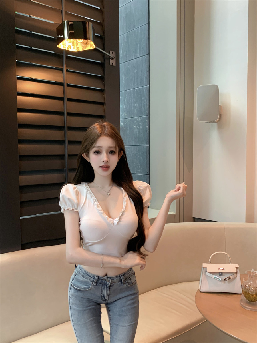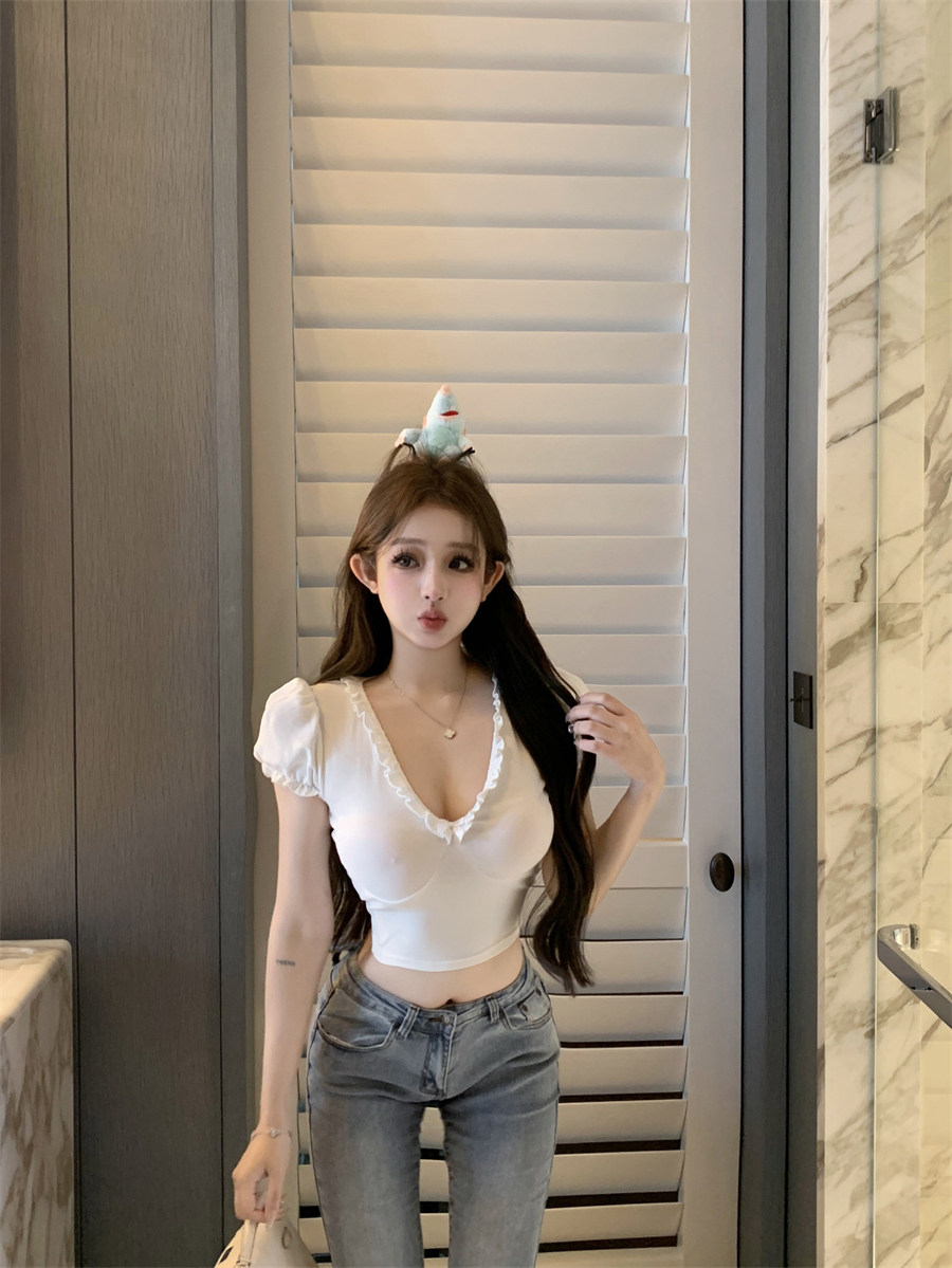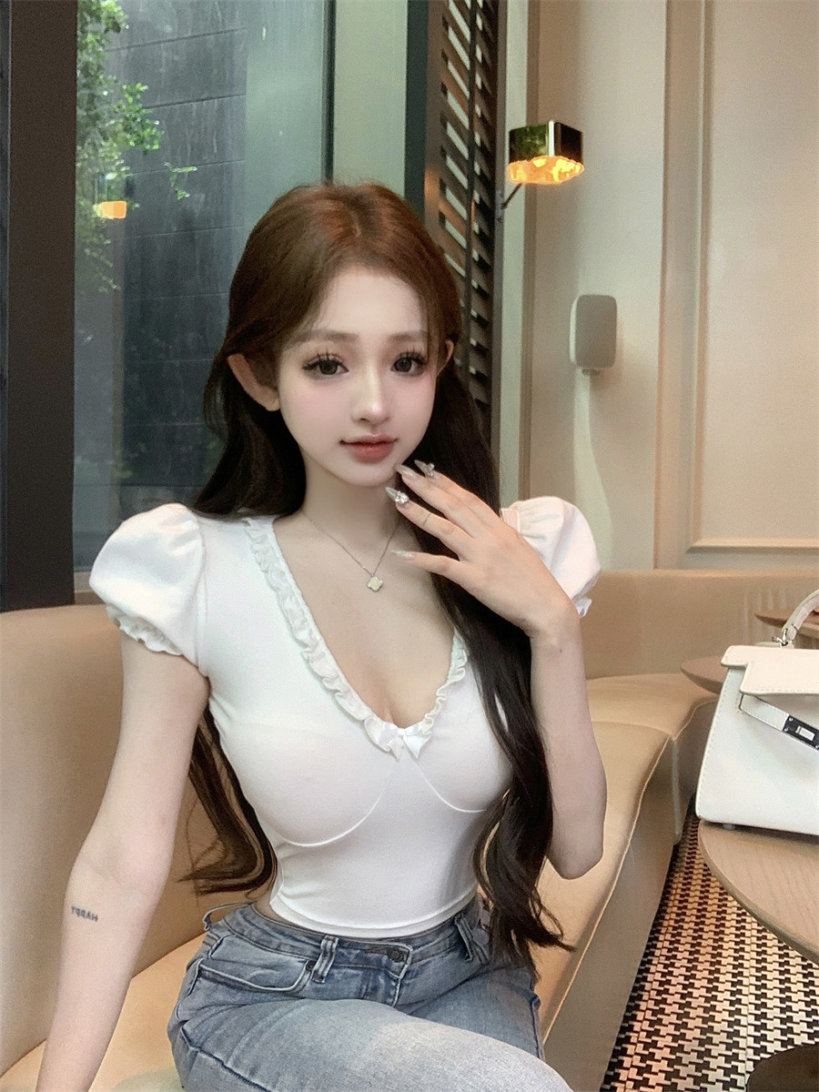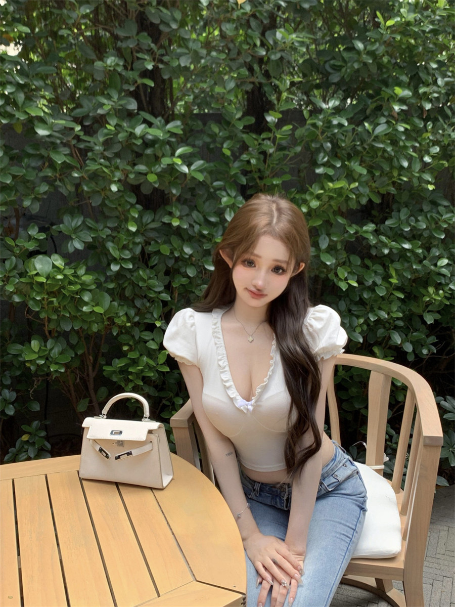 設計感木耳邊V領修身顯瘦白色泡泡袖甜辣T恤上衣
