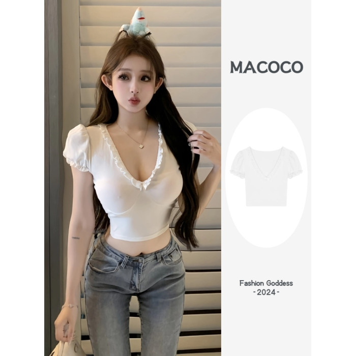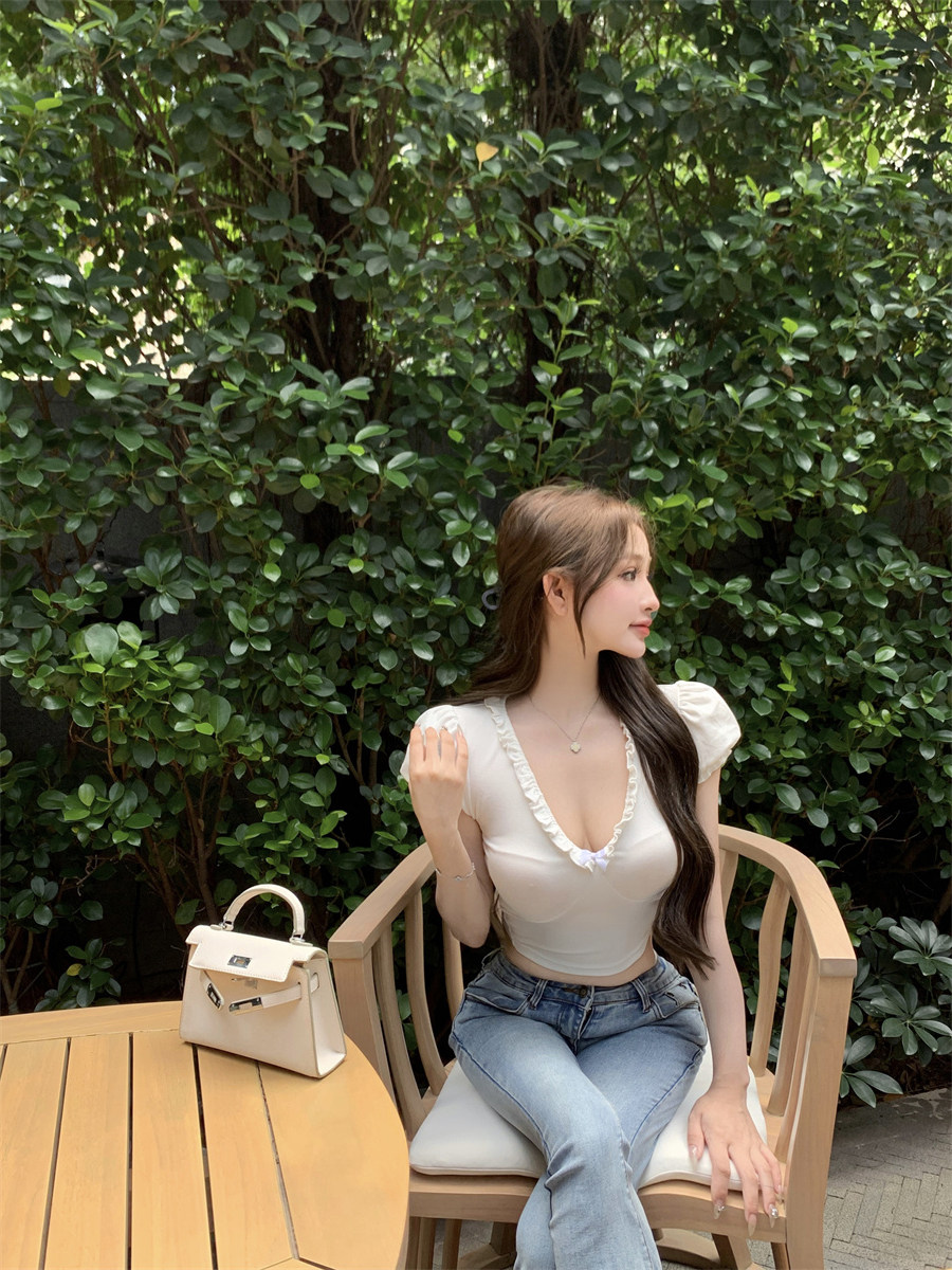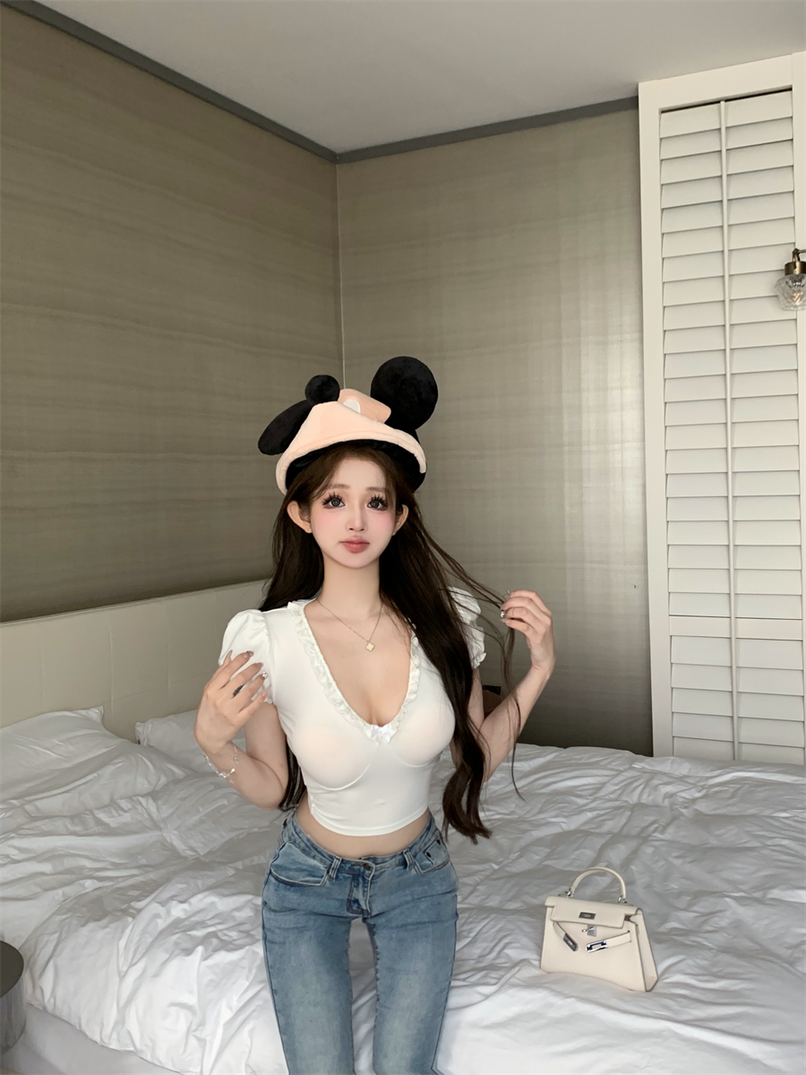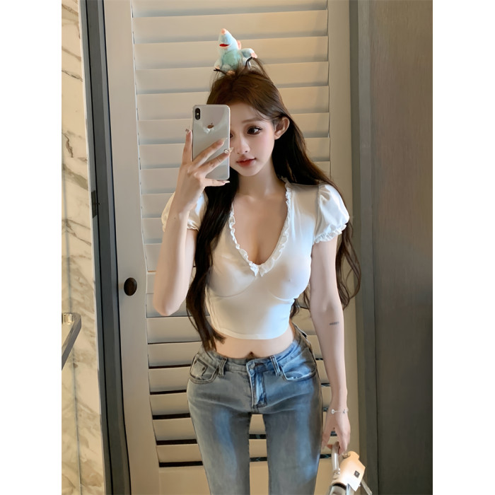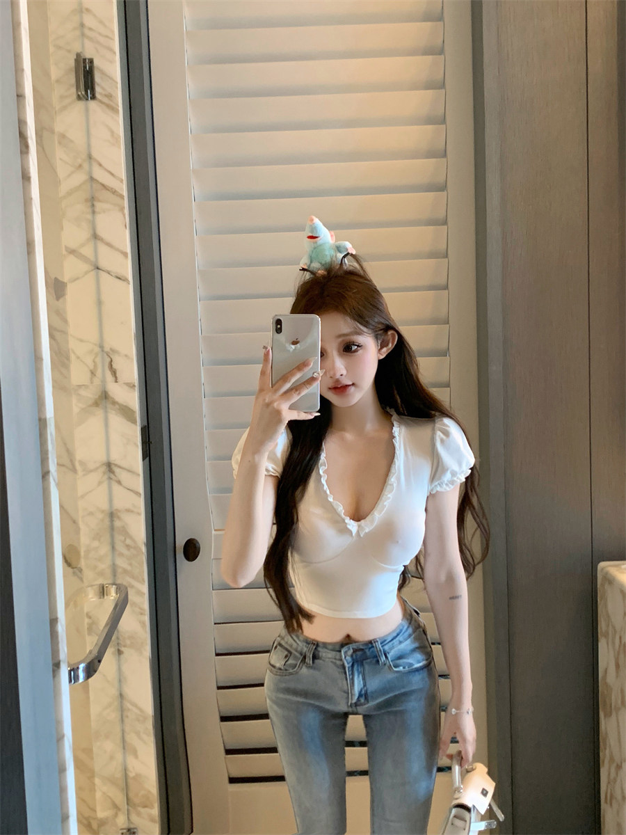 設計感木耳邊V領修身顯瘦白色泡泡袖甜辣T恤上衣
