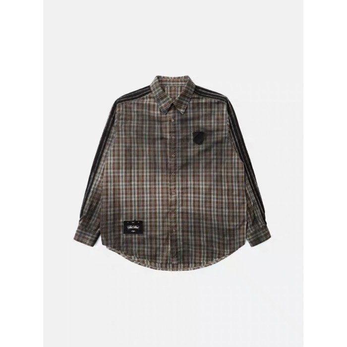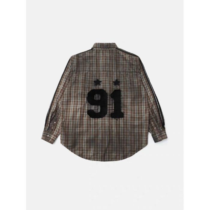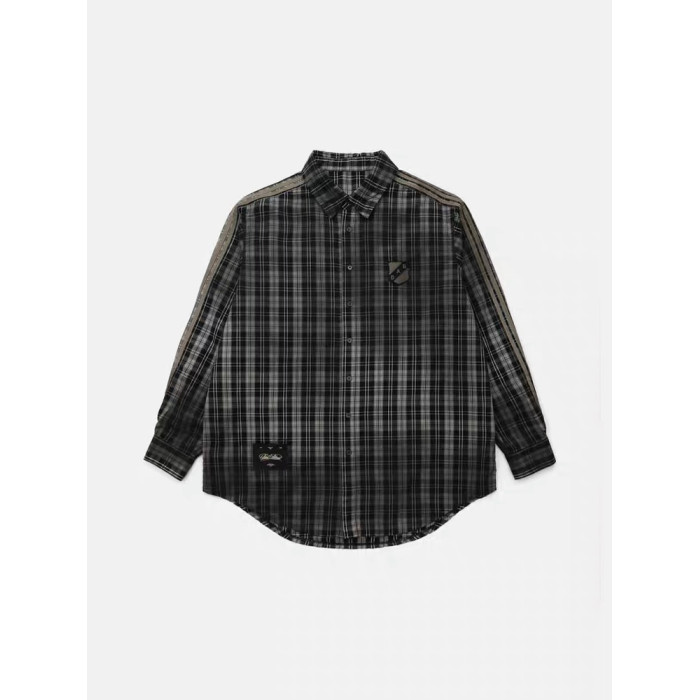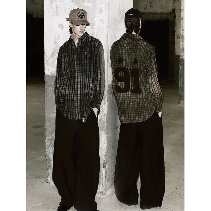 Badblood美式復古格子襯衫女做舊91貼布綉繙領格紋襯衣寬鬆情侶款