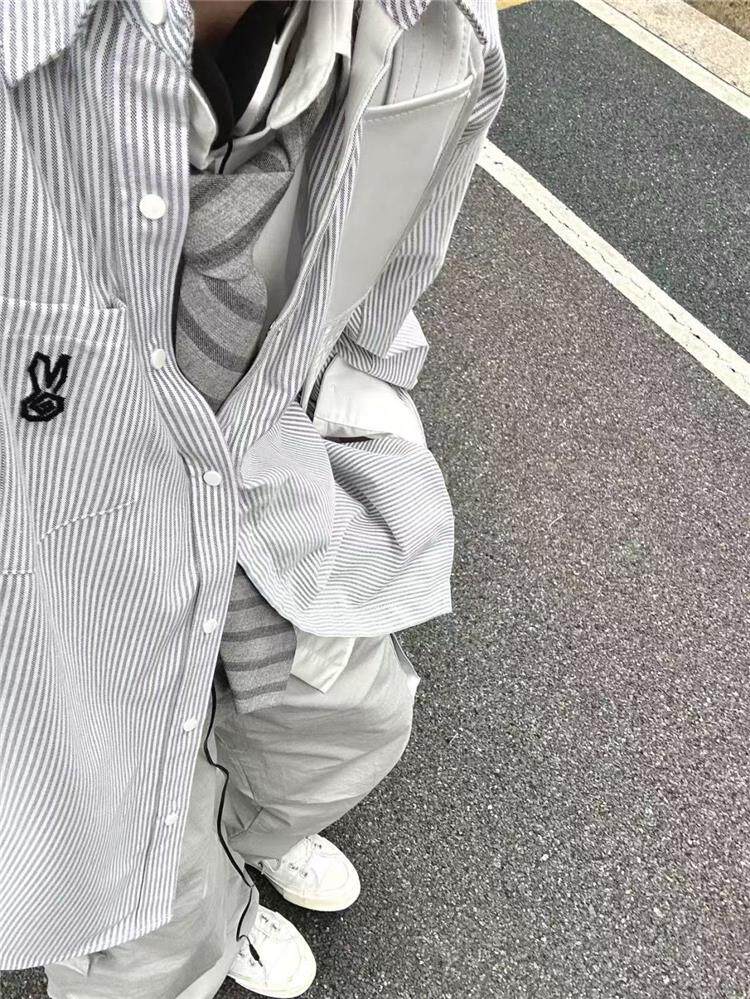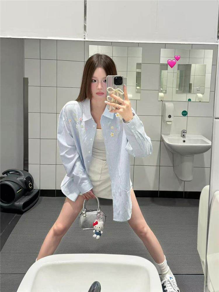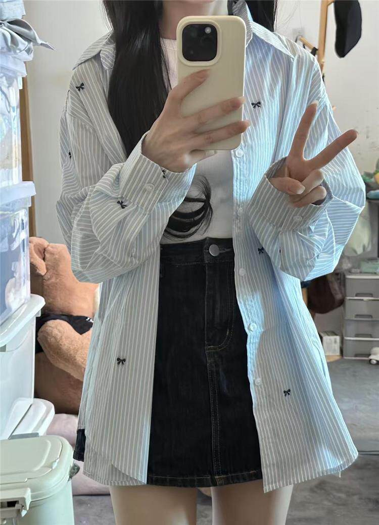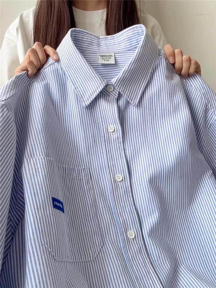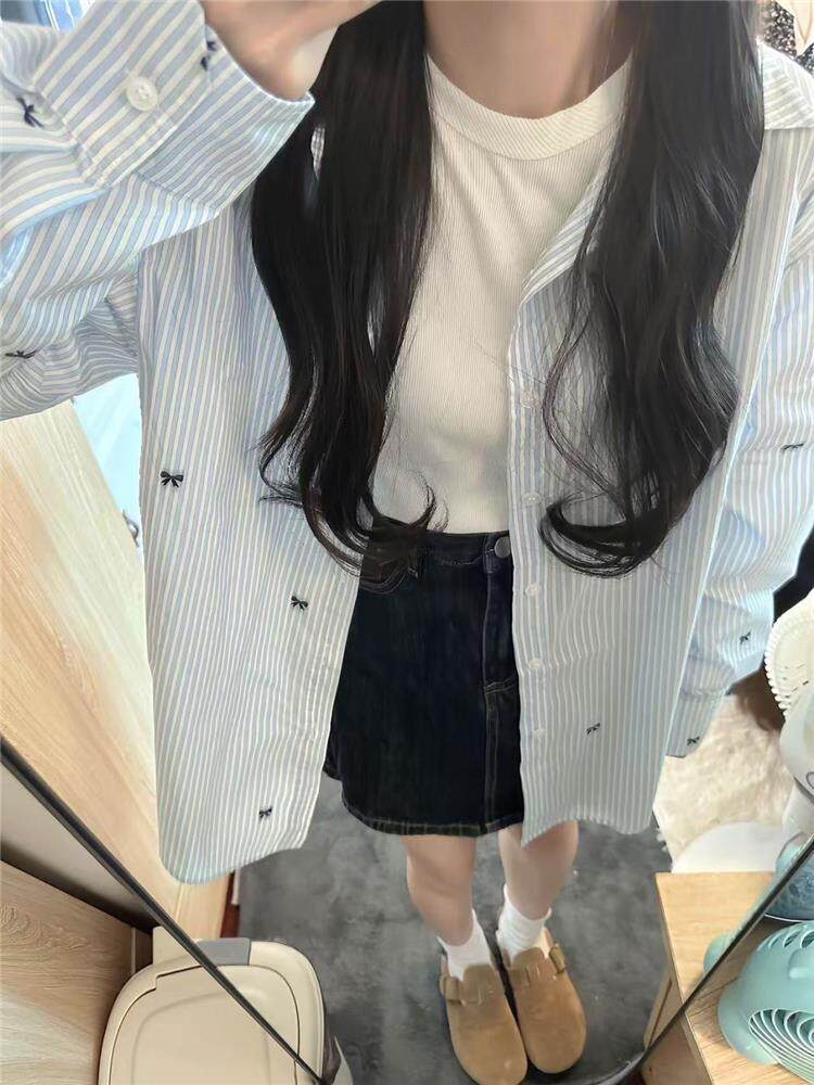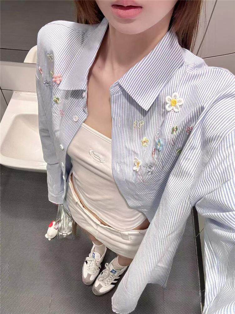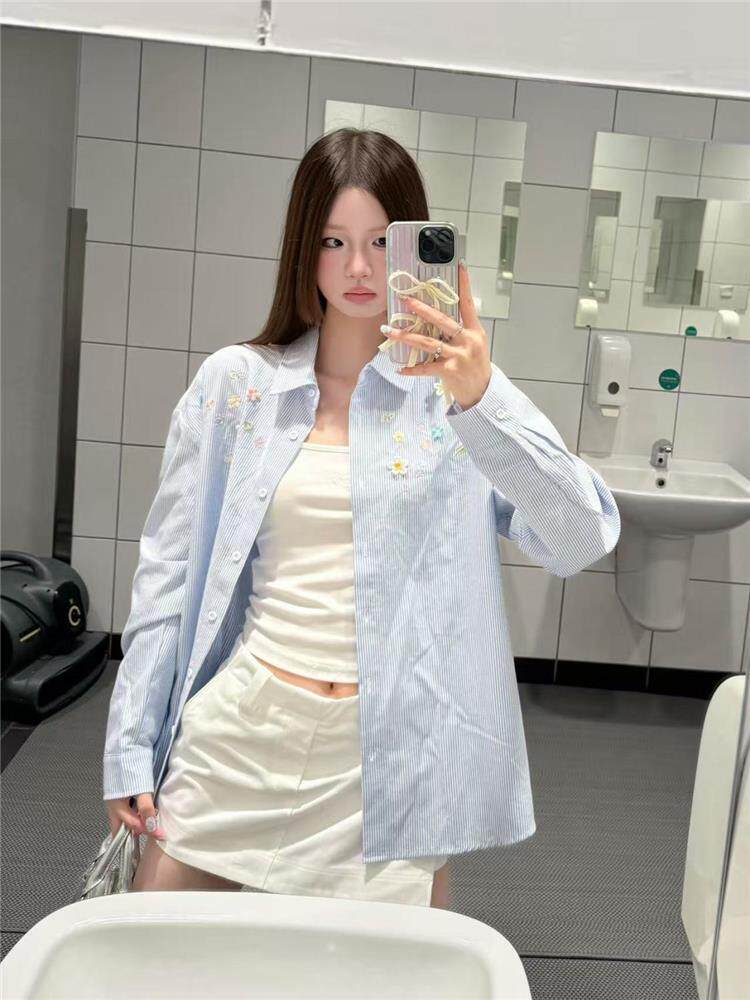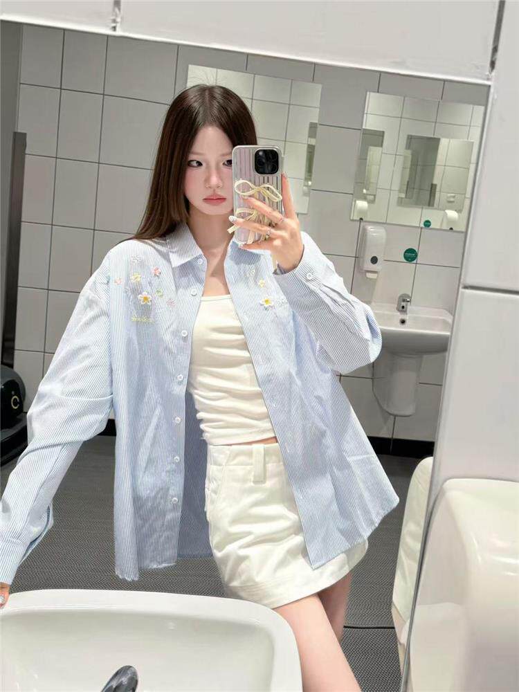 年輕刺綉藍色條紋襯衫女曡穿上衣寬鬆遮肉顯瘦休閒小個子長袖襯衣