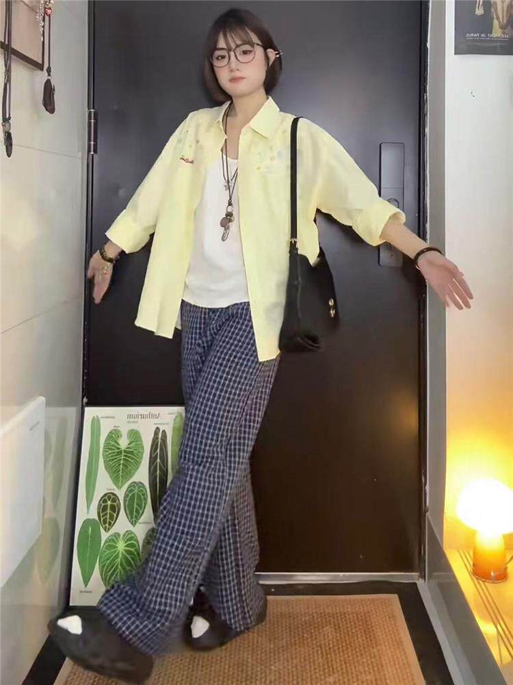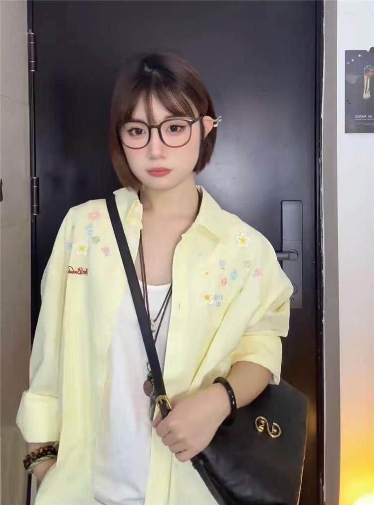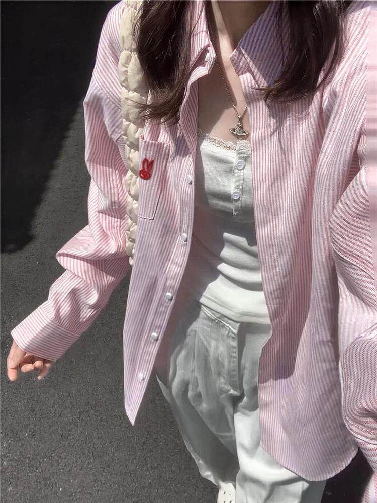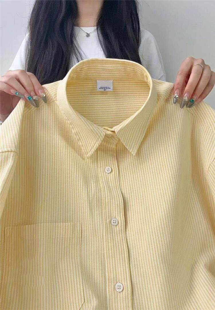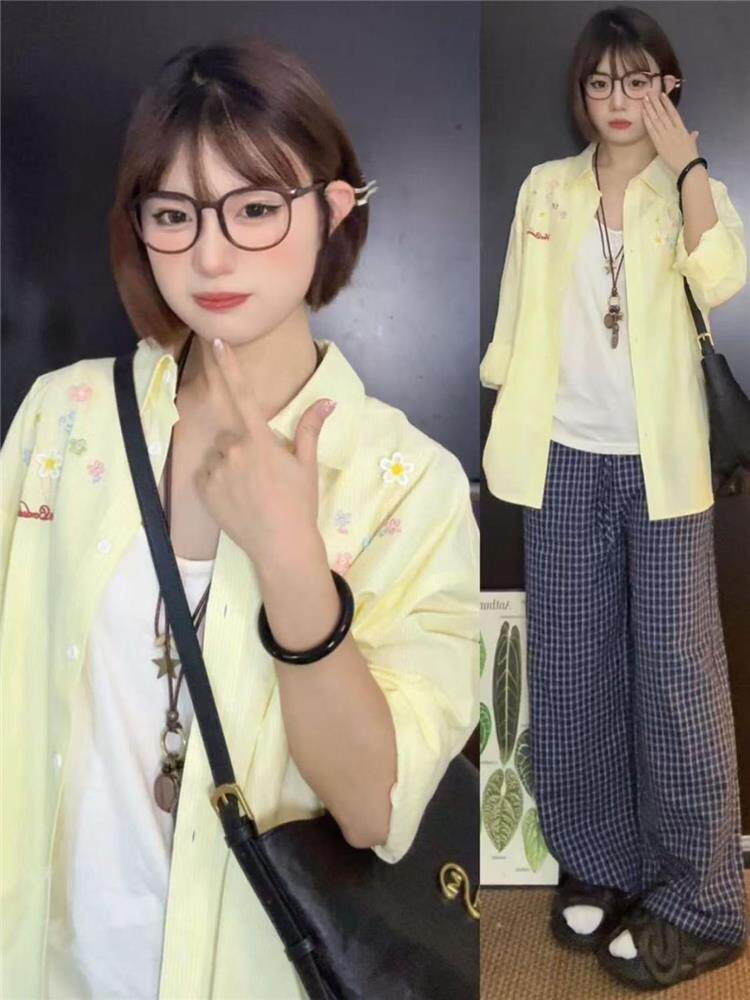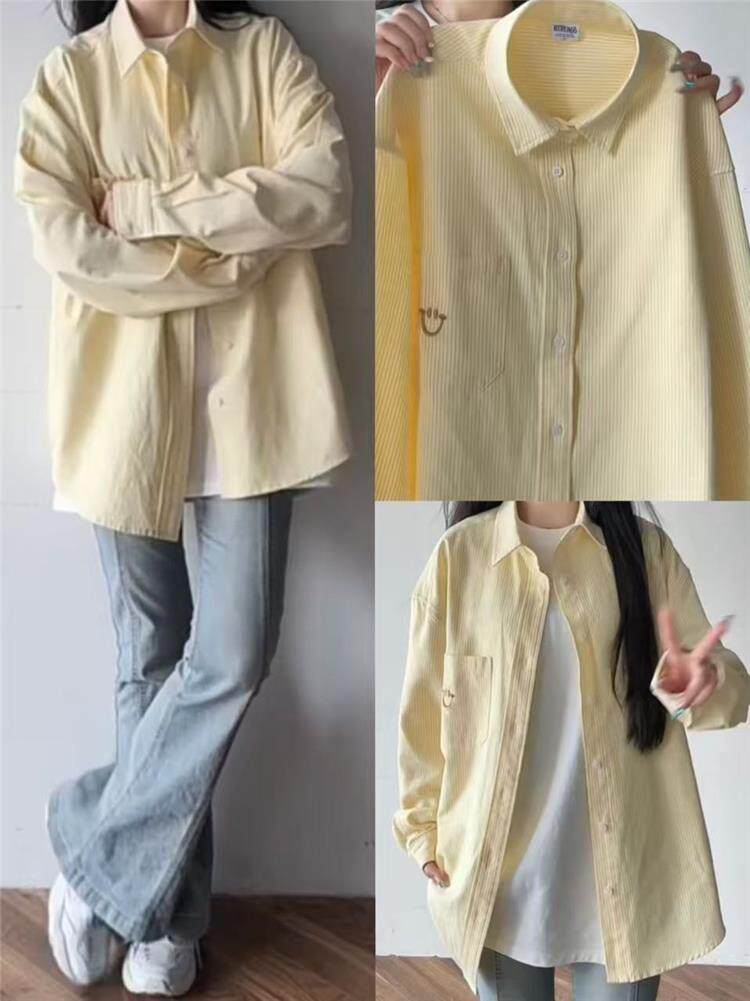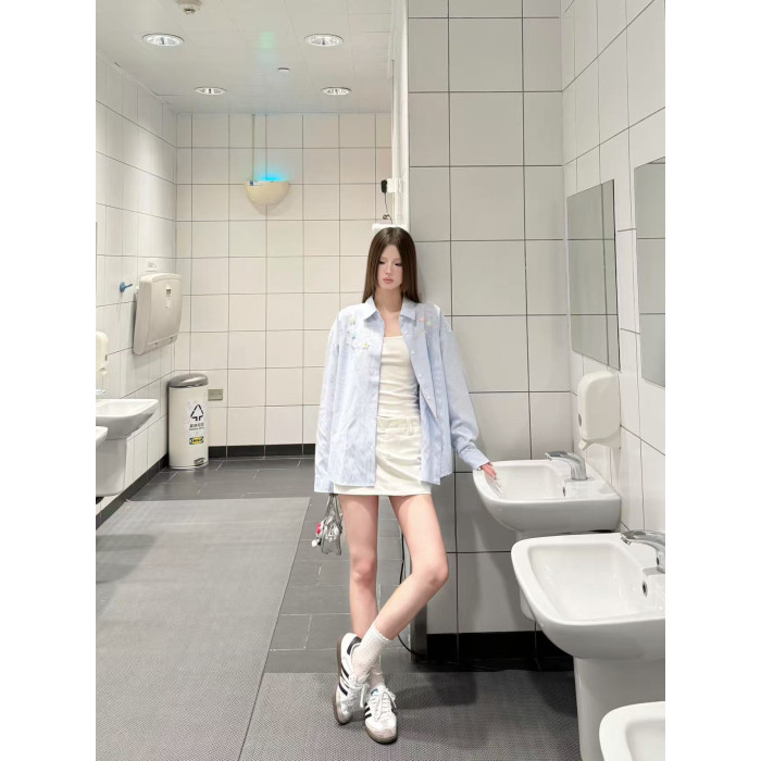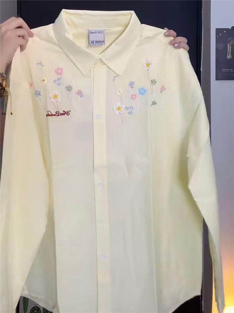 年輕刺綉藍色條紋襯衫女曡穿上衣寬鬆遮肉顯瘦休閒小個子長袖襯衣