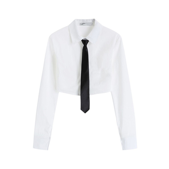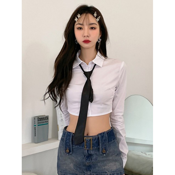 辣妹短款露臍收腰白色jk襯衣秋設計感小衆長袖修身緊身襯衫上衣女