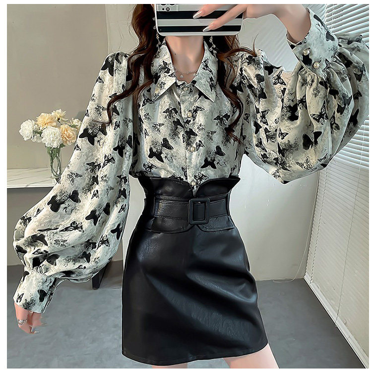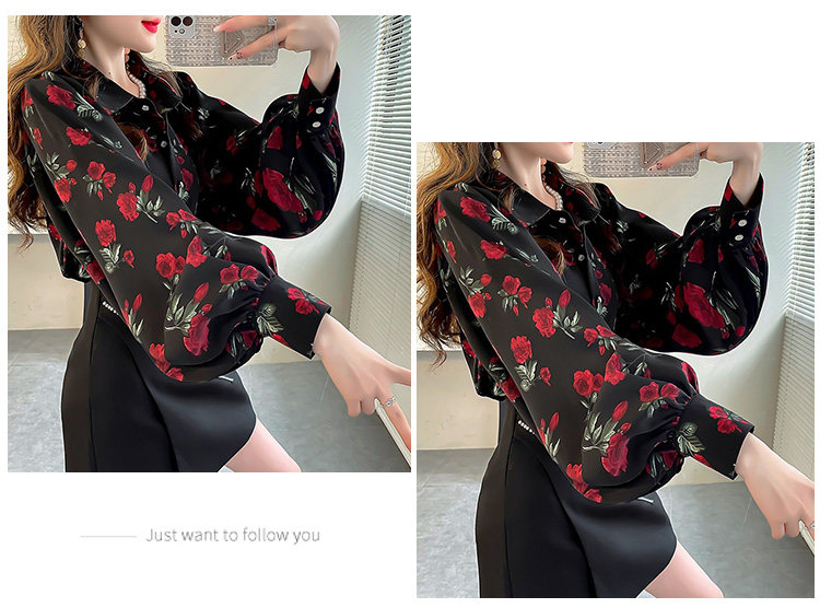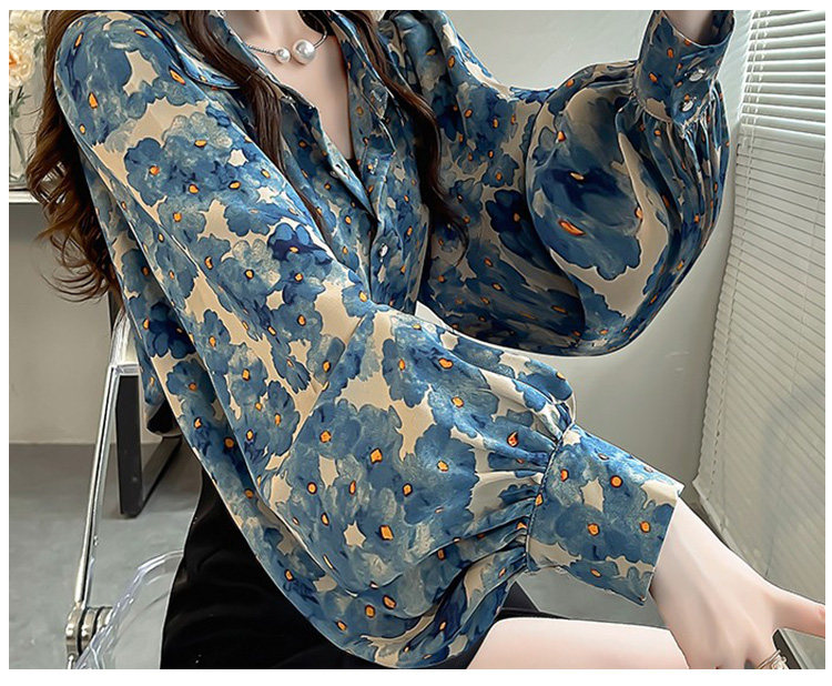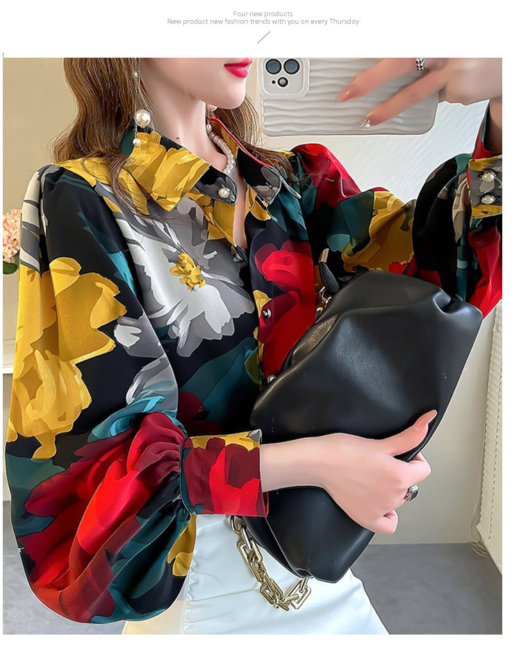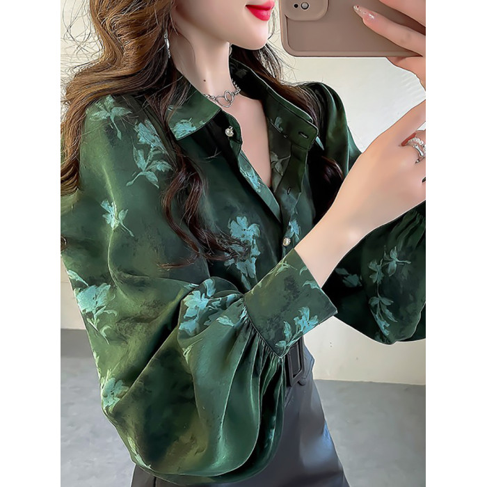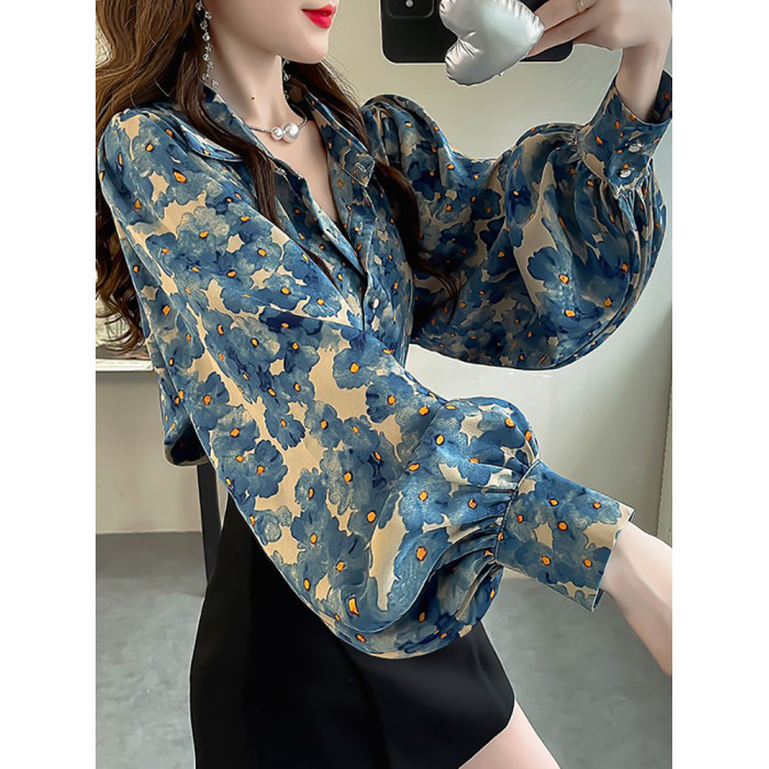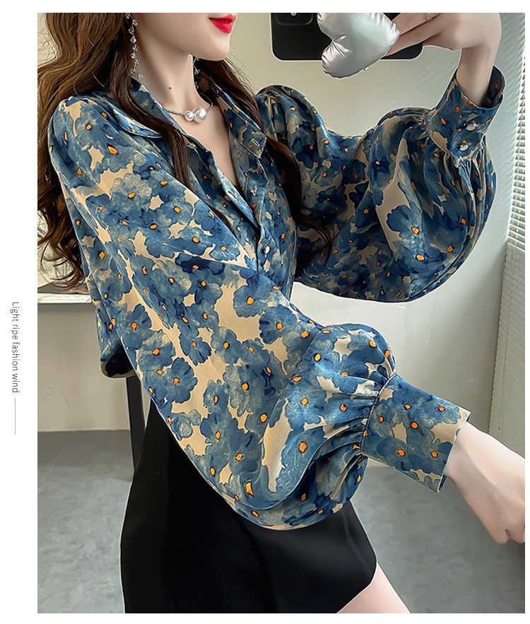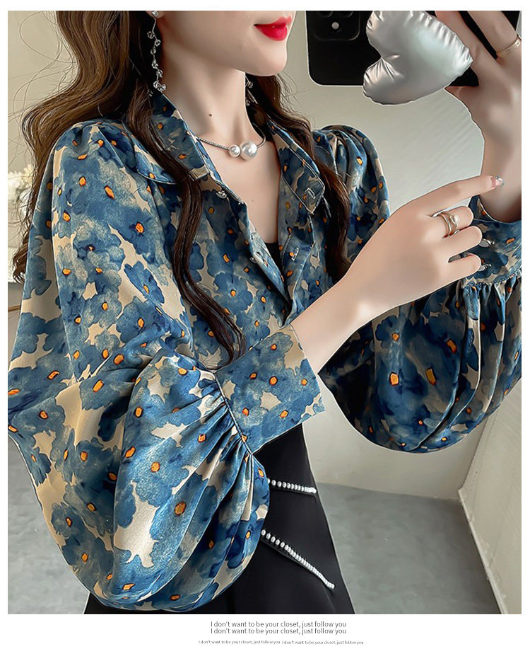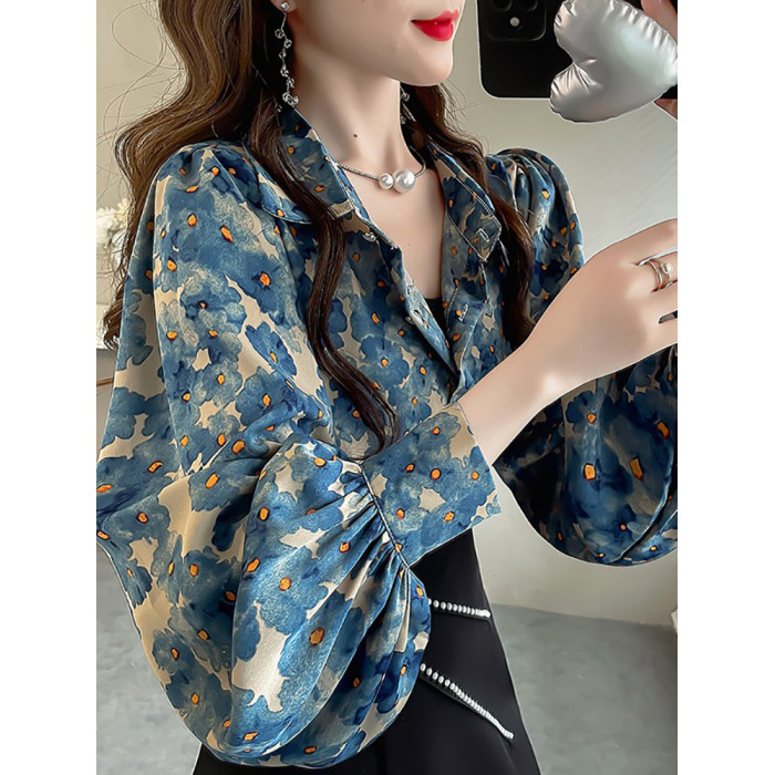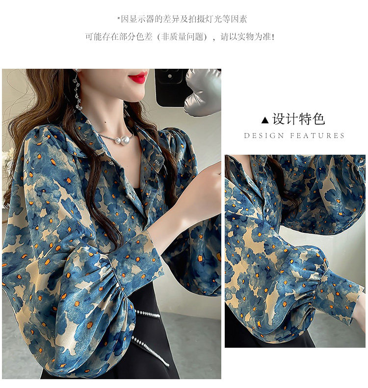 春季大碼燈籠袖襯衫女設計感小衆復古印花襯衣時尚氣質繙領上衣仙