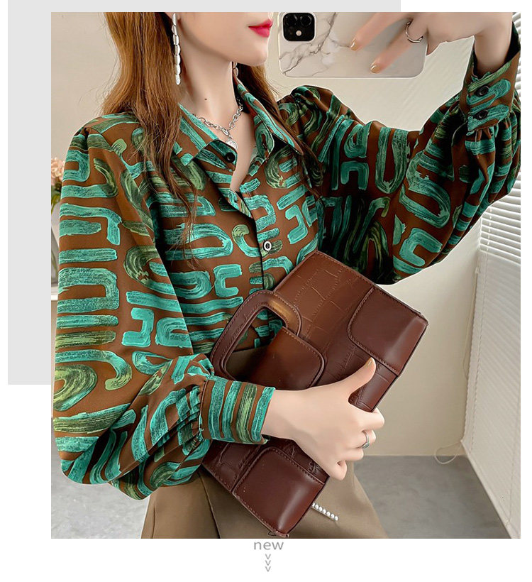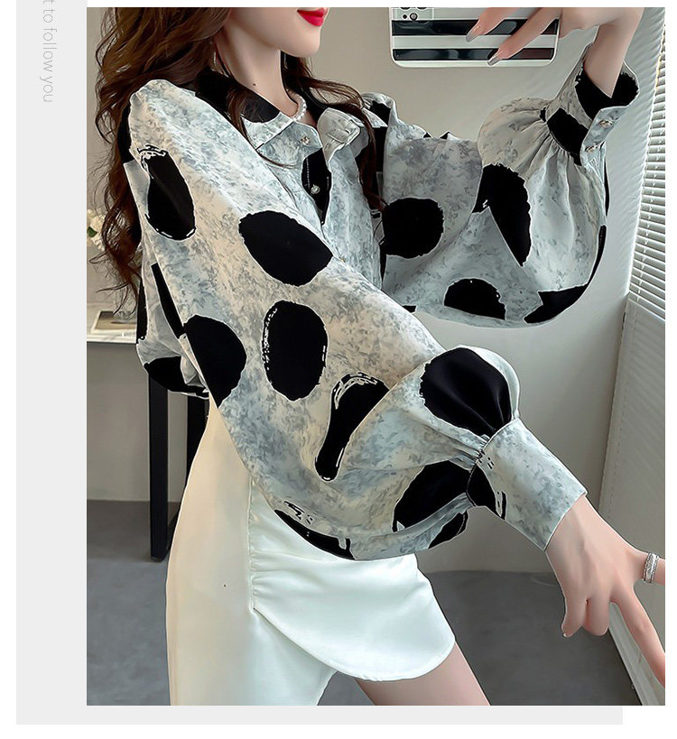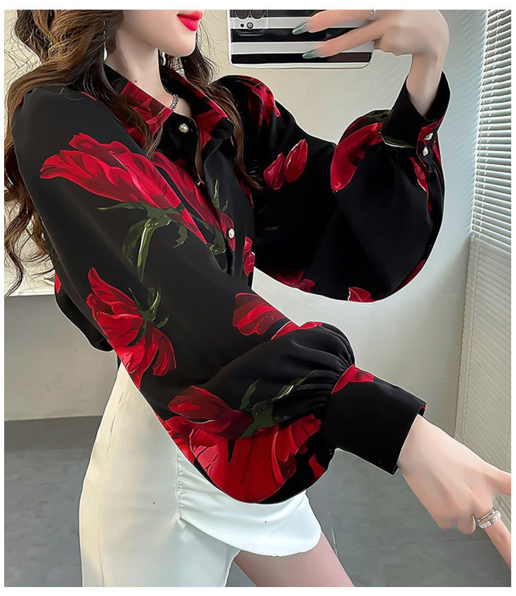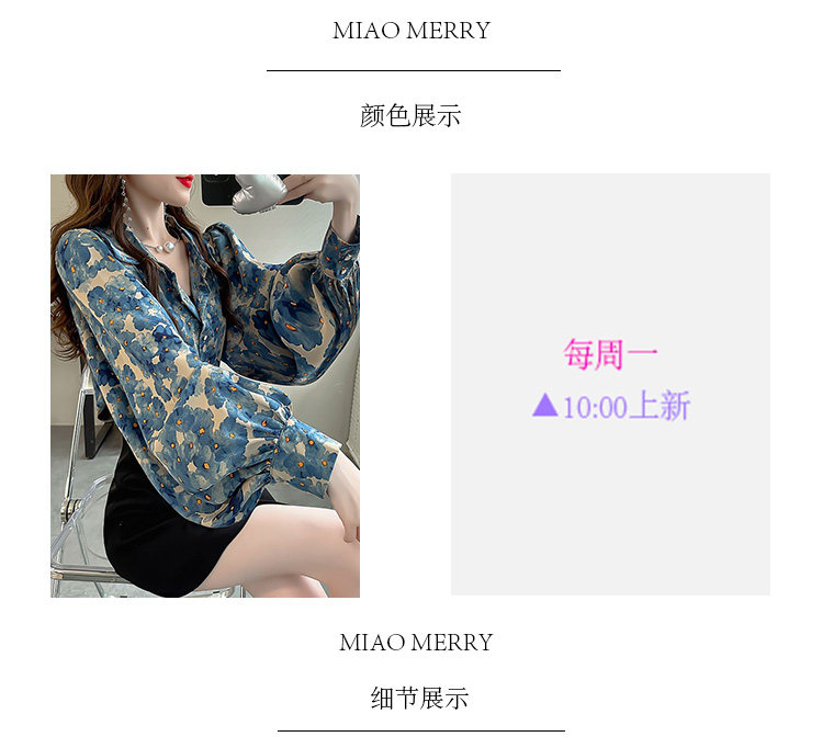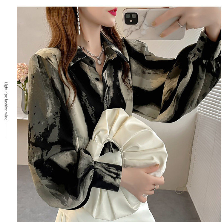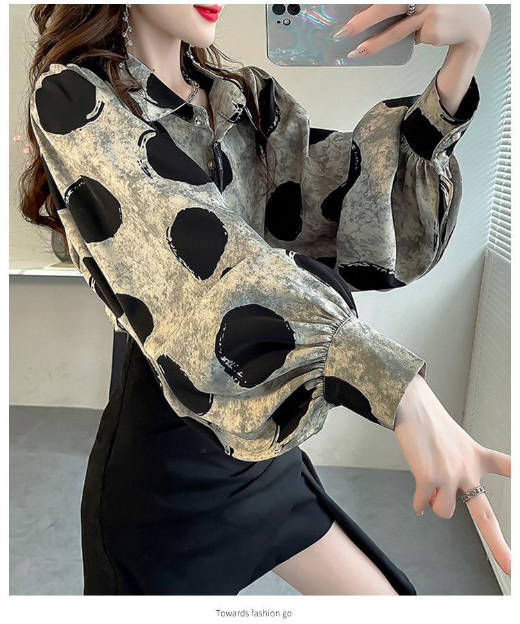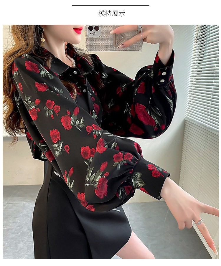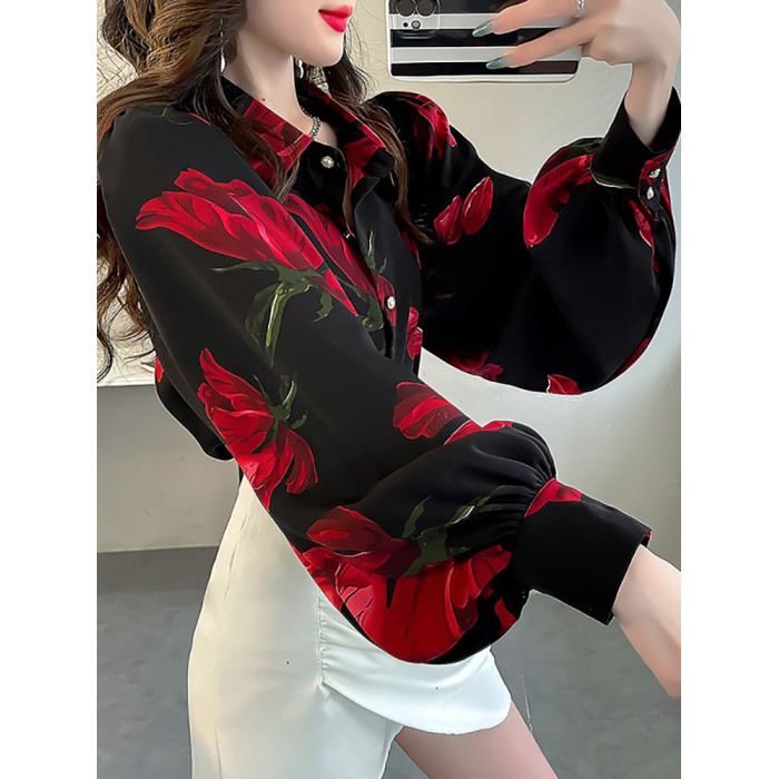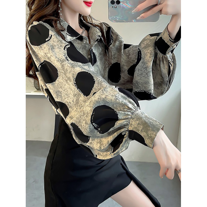 春季大碼燈籠袖襯衫女設計感小衆復古印花襯衣時尚氣質繙領上衣仙