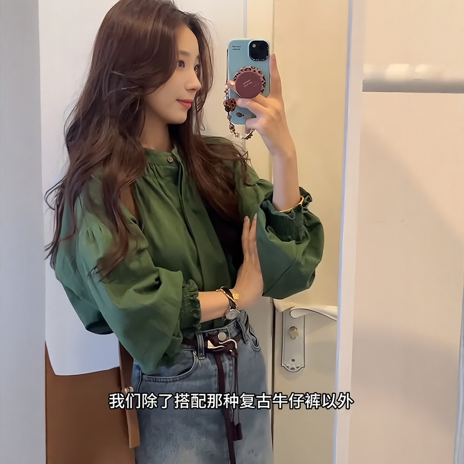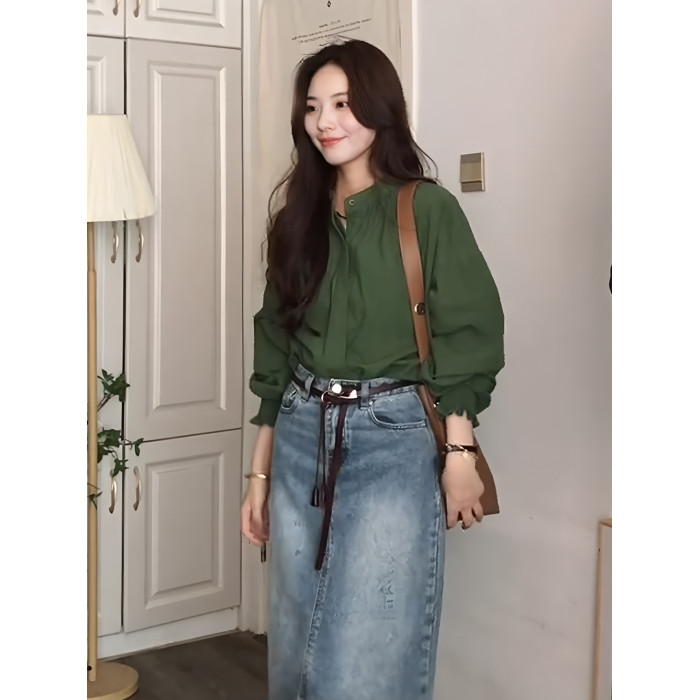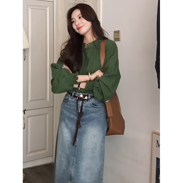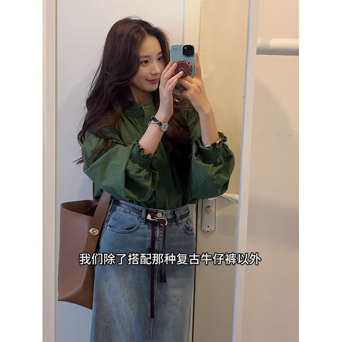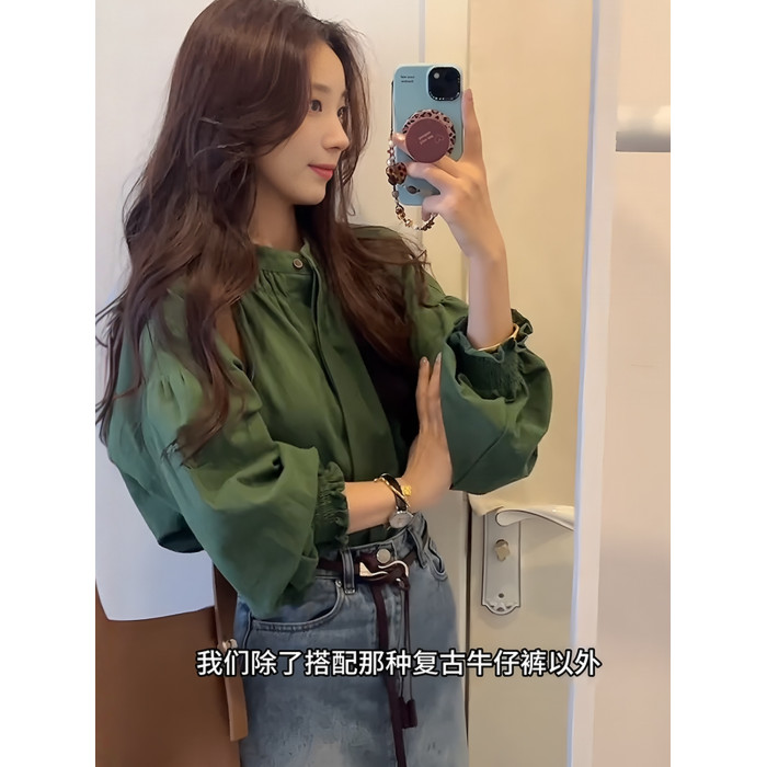 復古氣質綠色圓領燈籠袖襯衫女秋季新款高級感寬鬆顯瘦百搭薄上衣