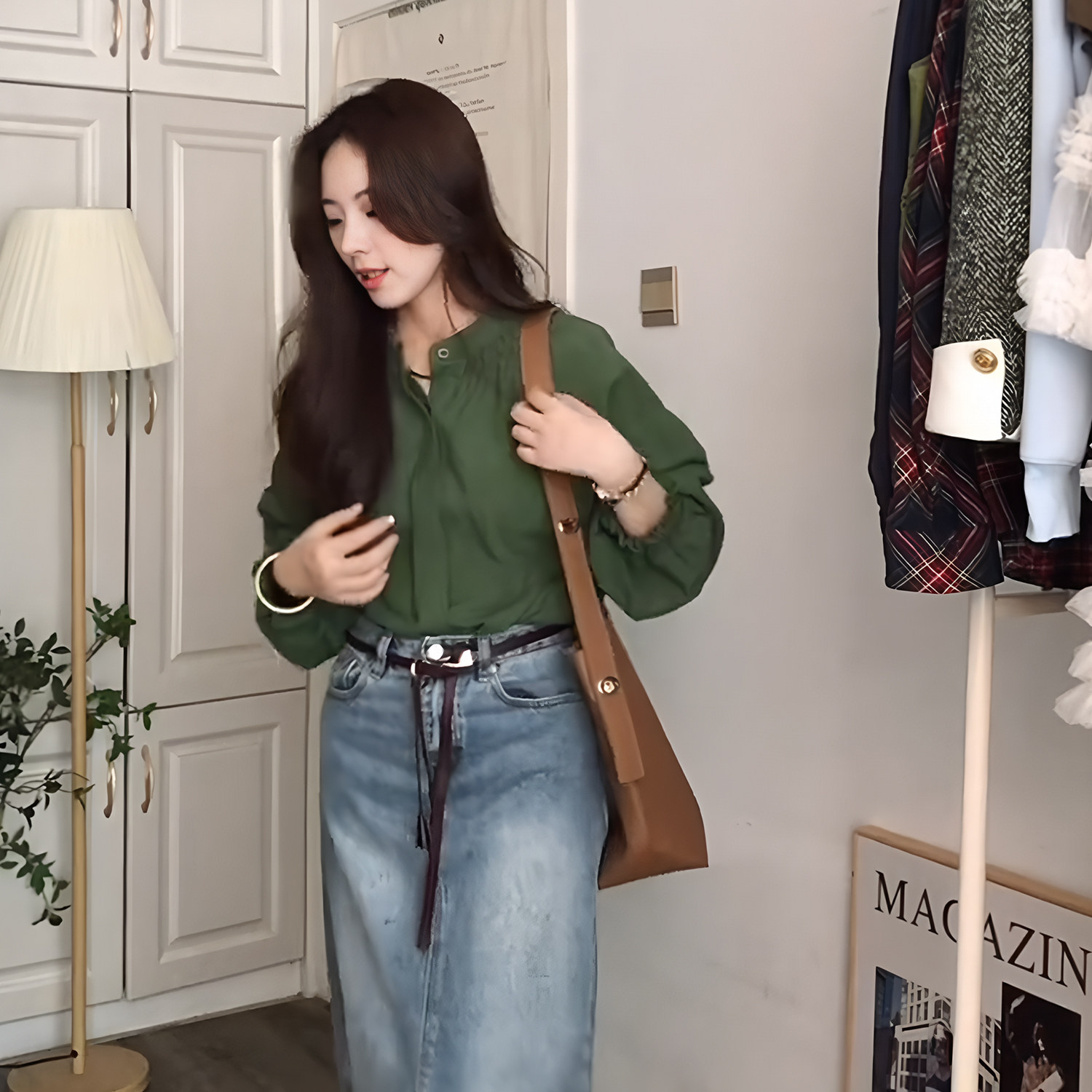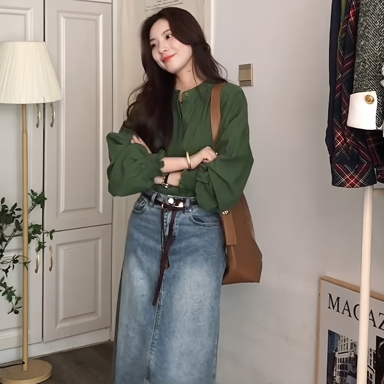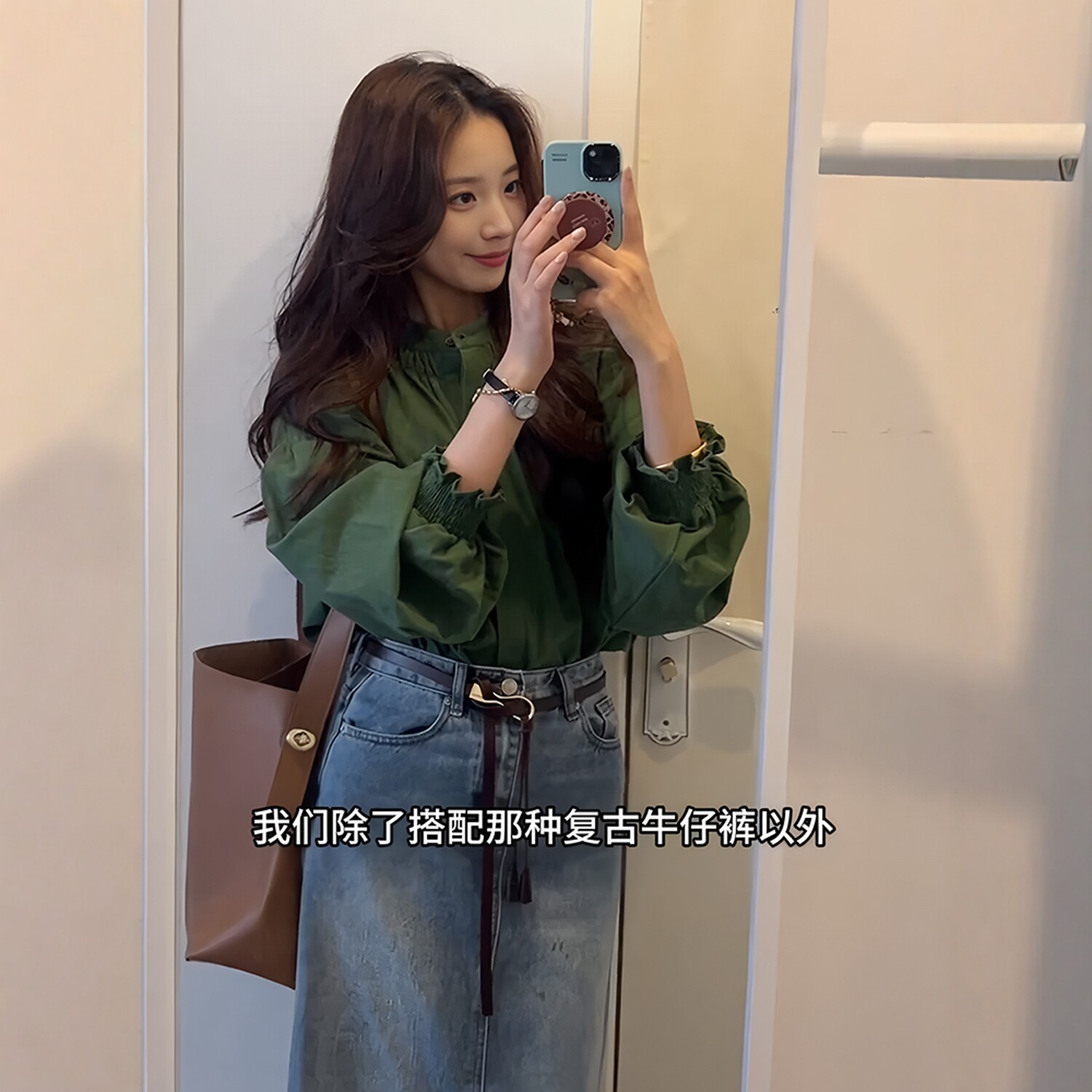 復古氣質綠色圓領燈籠袖襯衫女秋季新款高級感寬鬆顯瘦百搭薄上衣