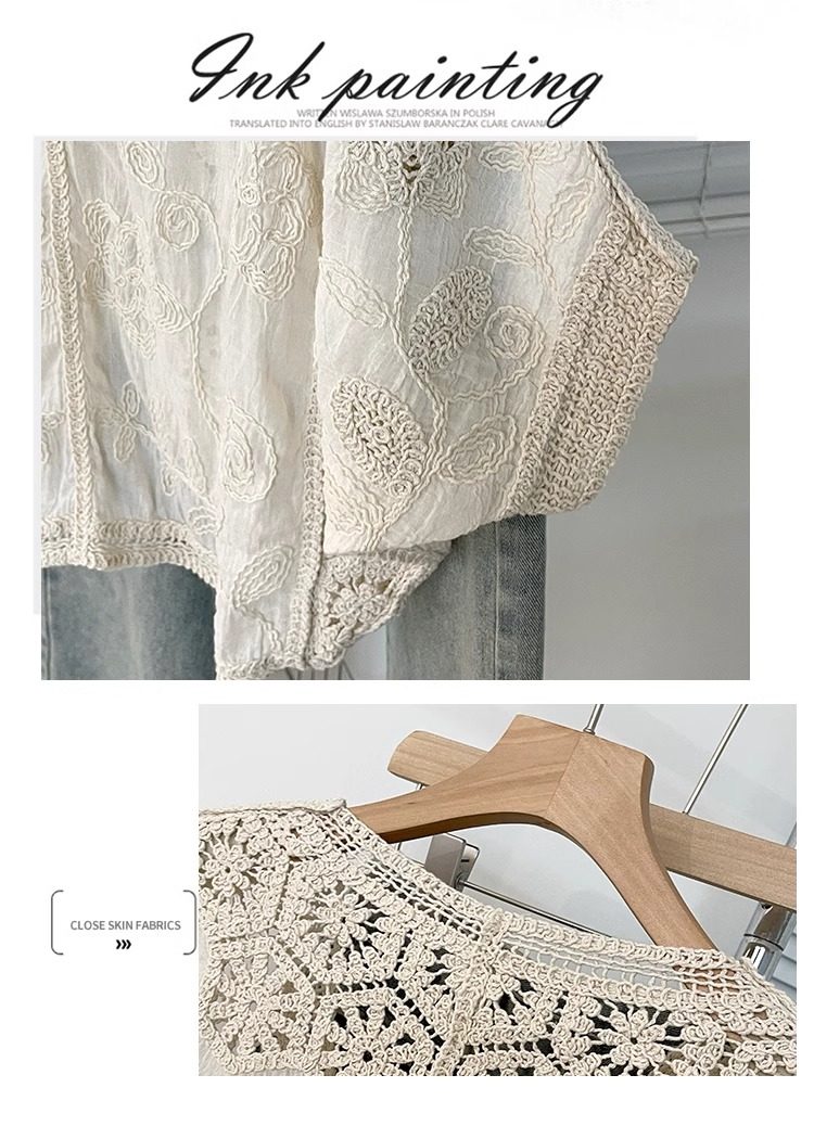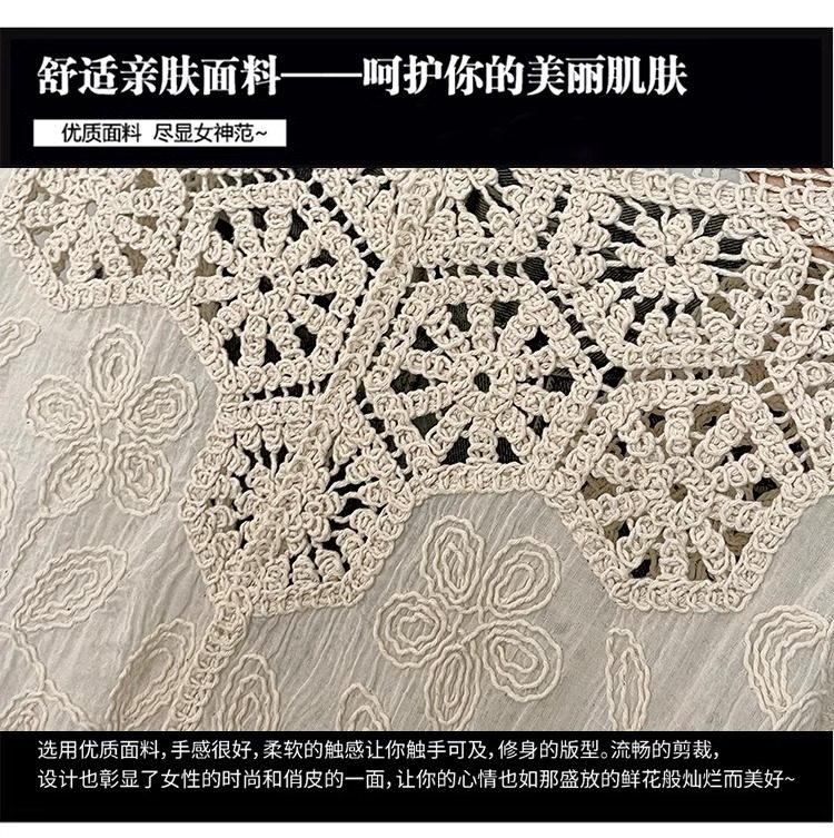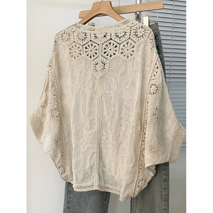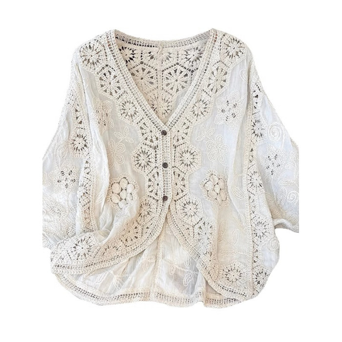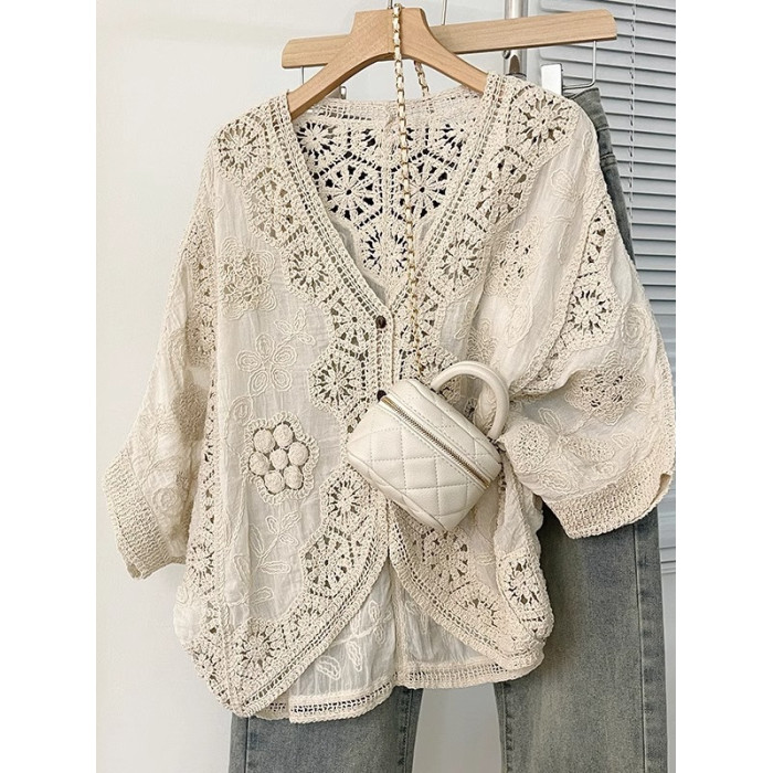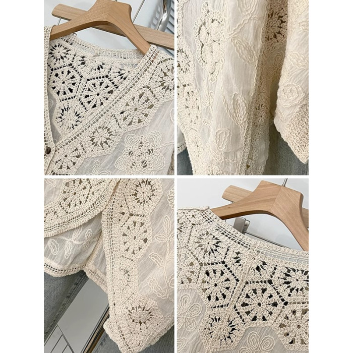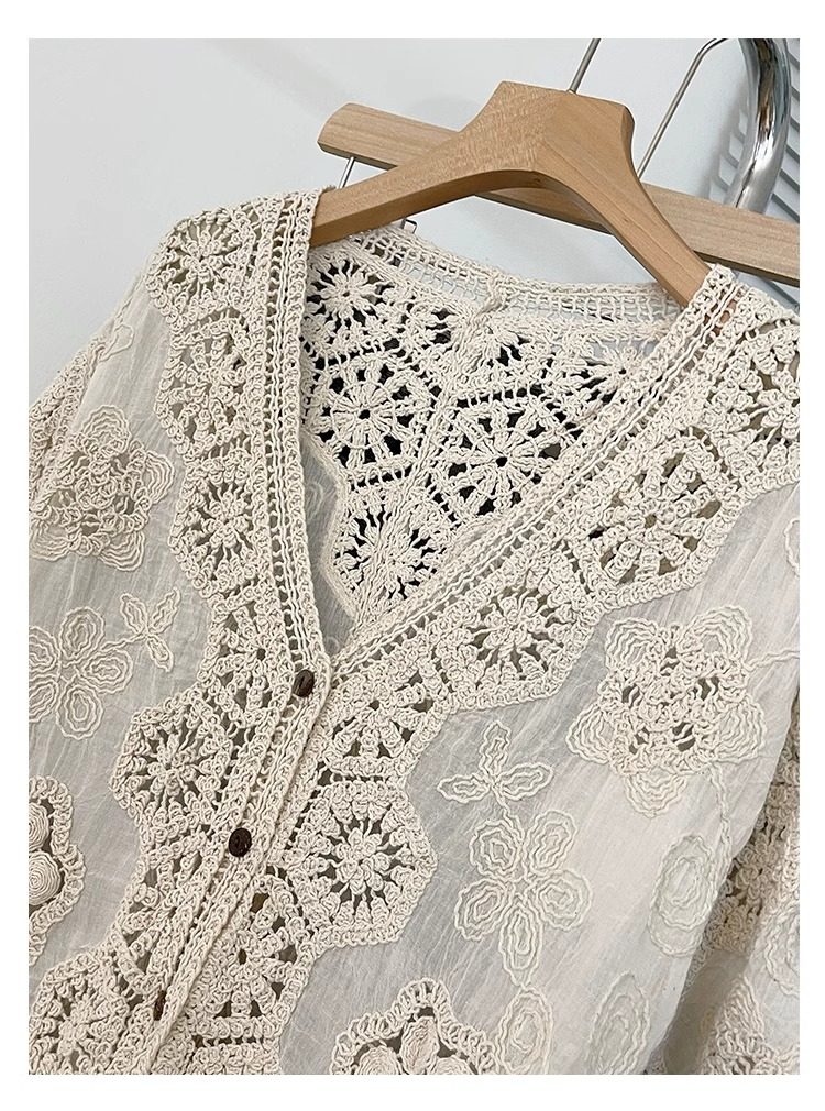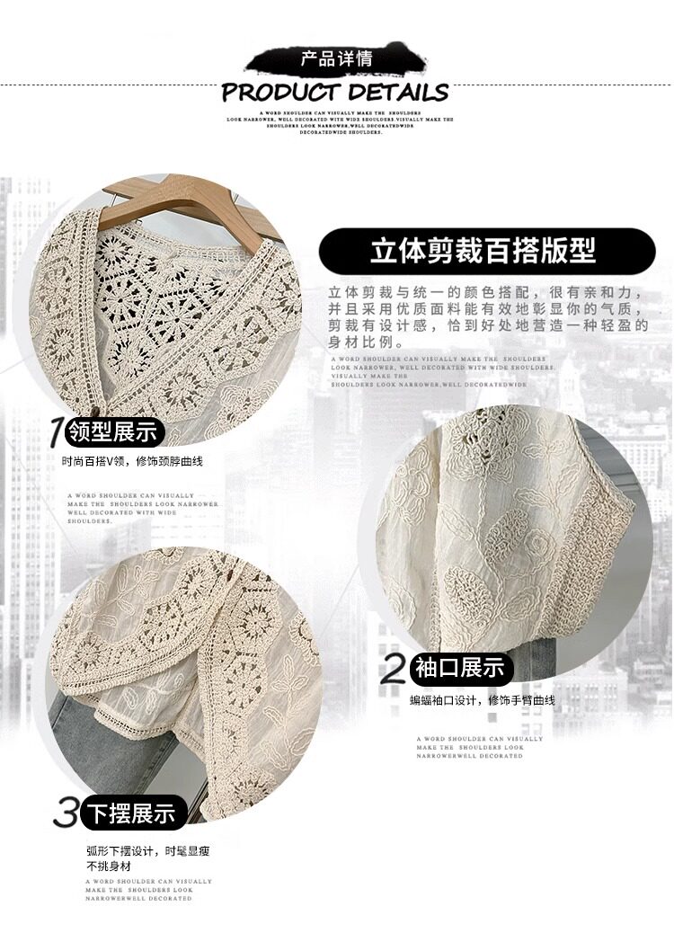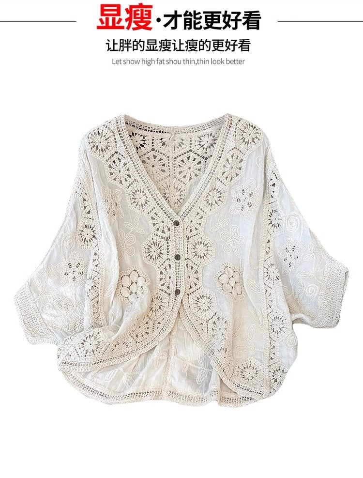 法式V領七分袖防曬開衫女2025夏大碼胖mm不規則鉤花鏤空外套上衣