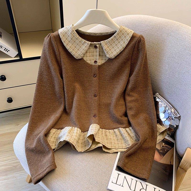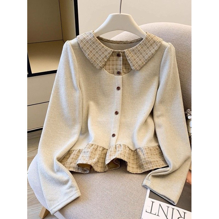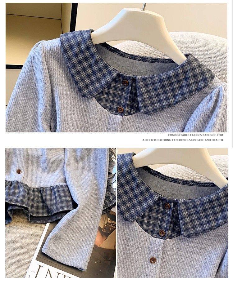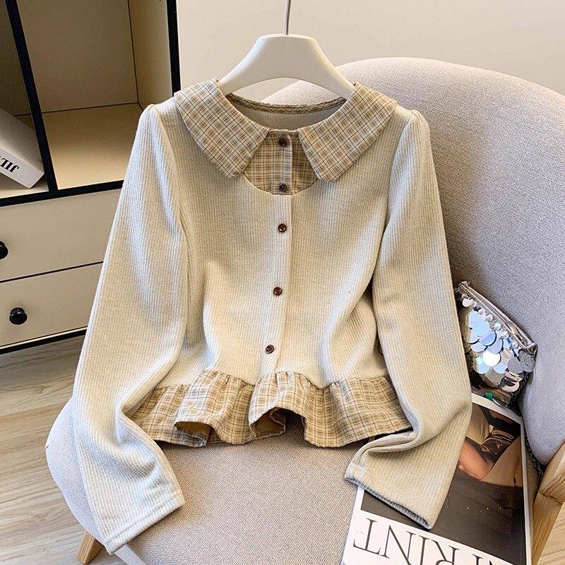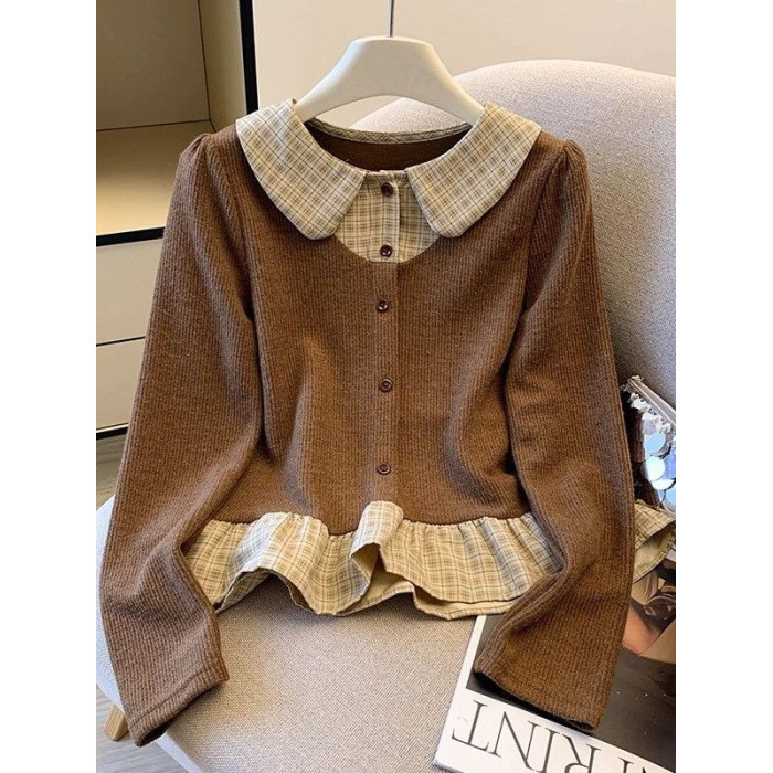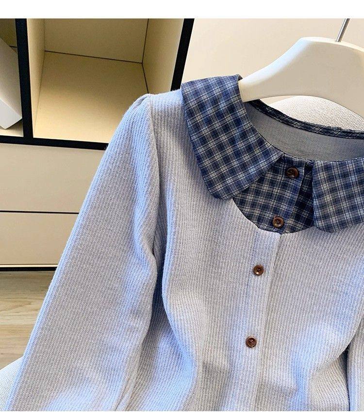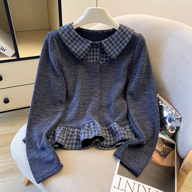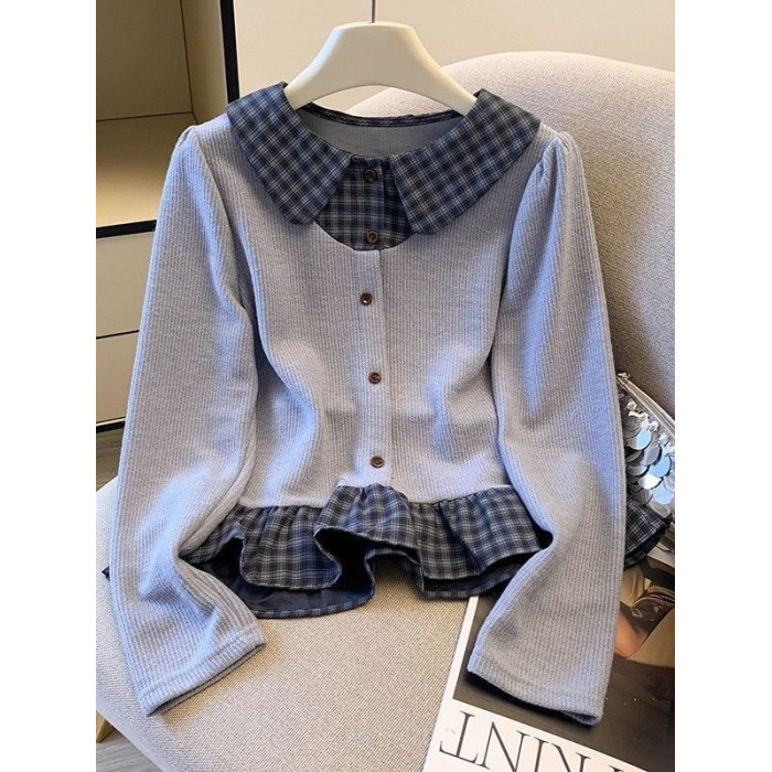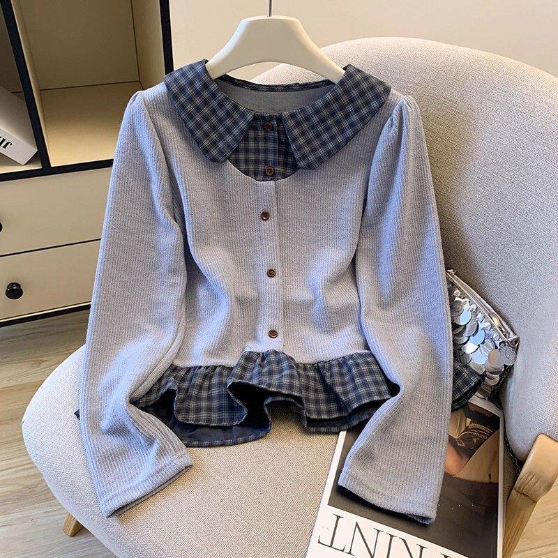 法式格子荷葉邊襯衫上衣女秋冬氣質好看寬鬆顯瘦設計感假兩件長袖