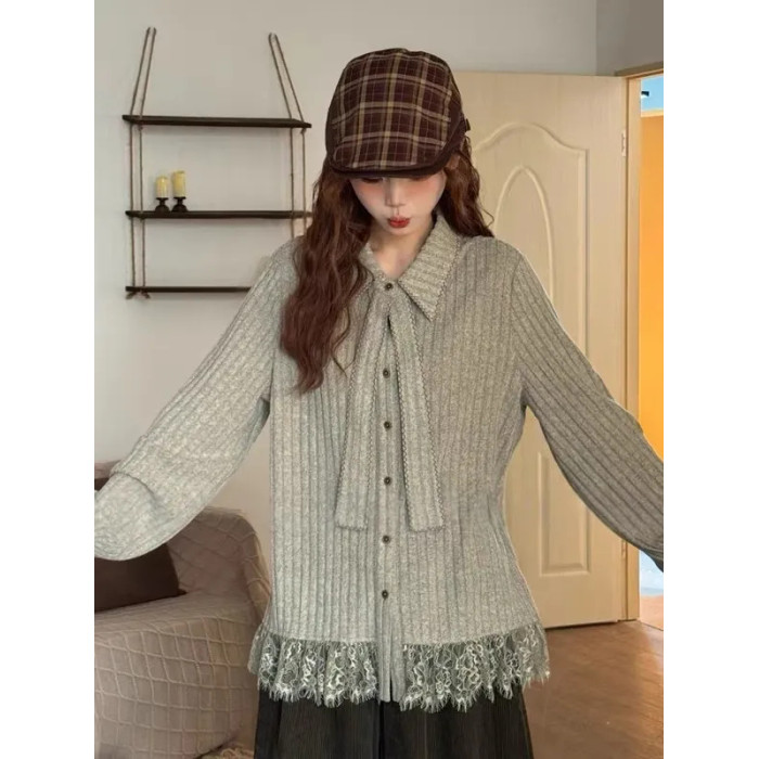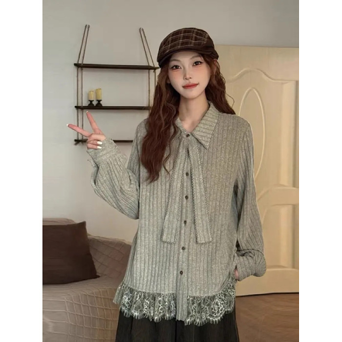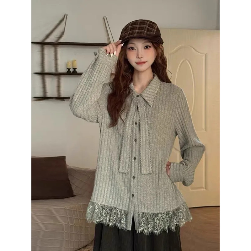 大碼蕾絲花邊繙領長袖襯衫女2026秋季新款高級感寬鬆顯瘦襯衣上衣