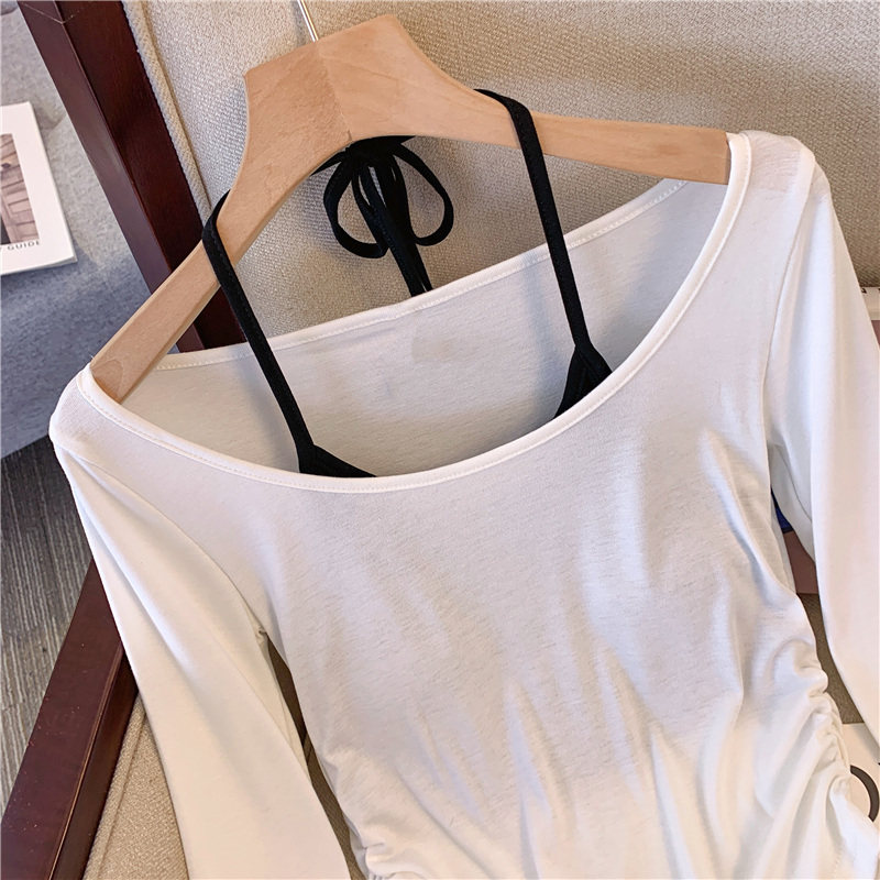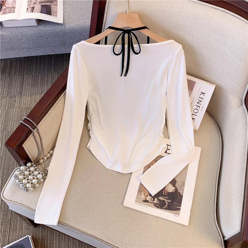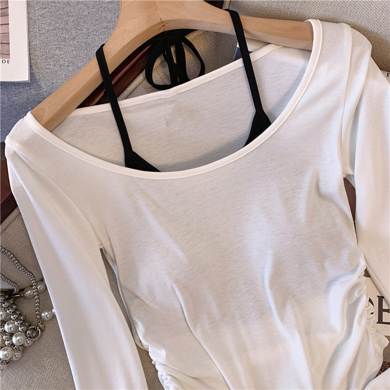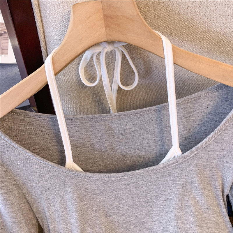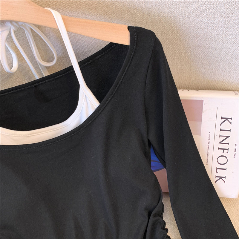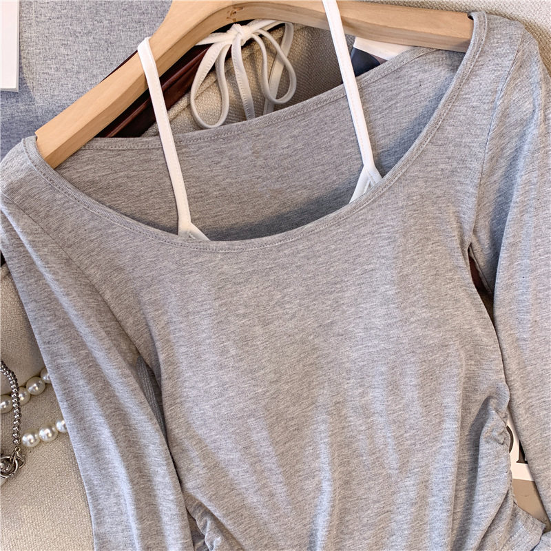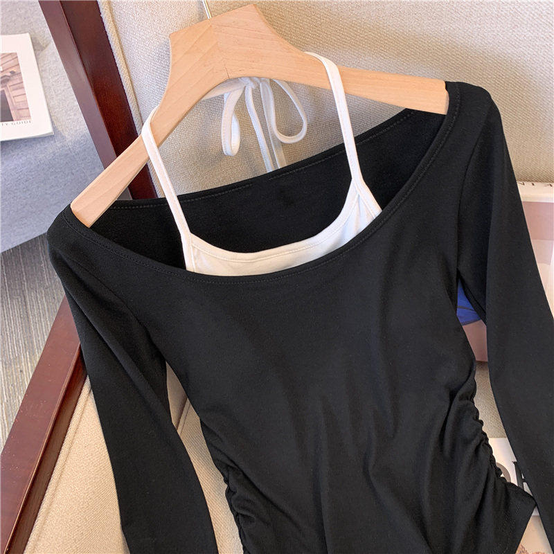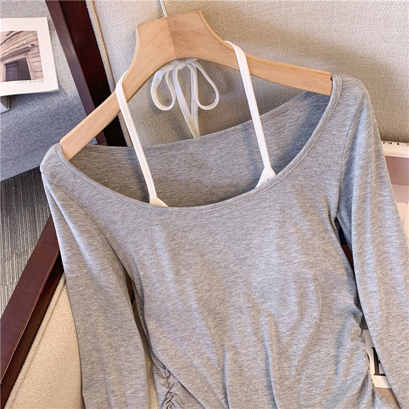 專櫃撤廻剪標甜辣妹掛脖長袖T恤女2025新款假兩件帶胸墊收腰上衣