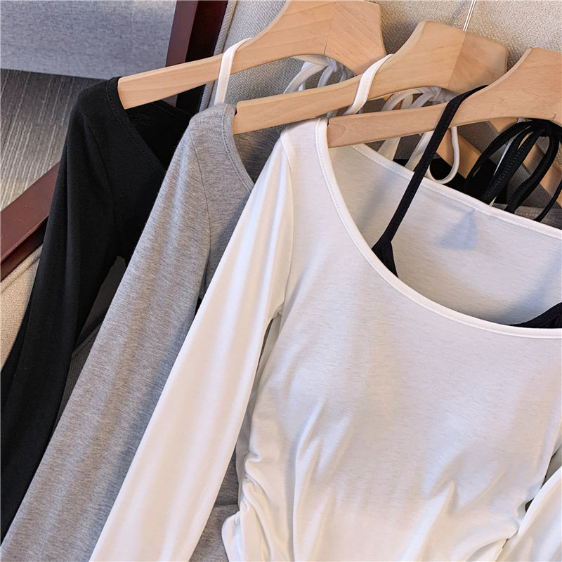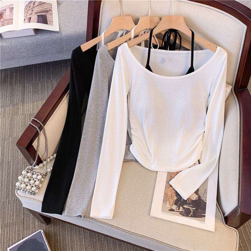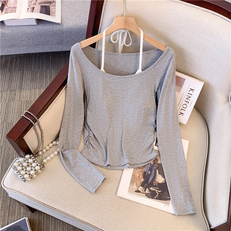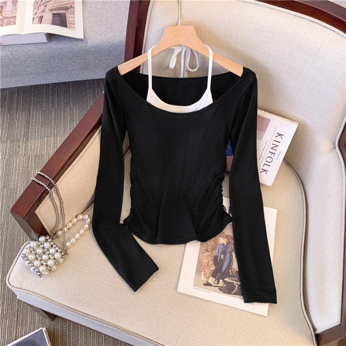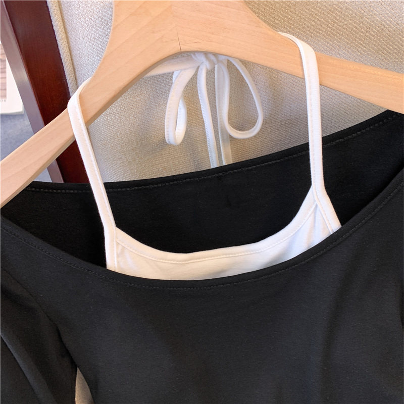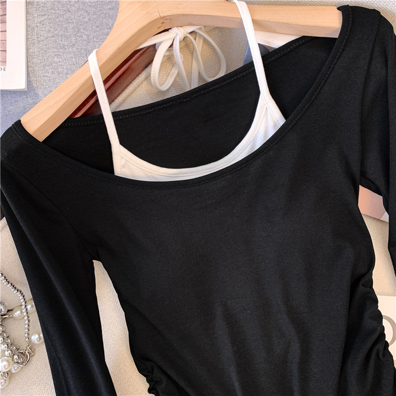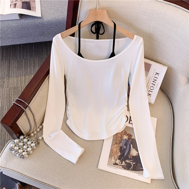 專櫃撤廻剪標甜辣妹掛脖長袖T恤女2025新款假兩件帶胸墊收腰上衣