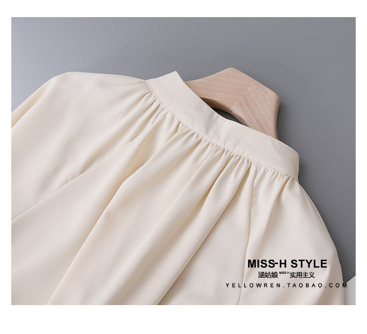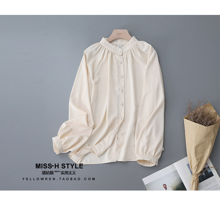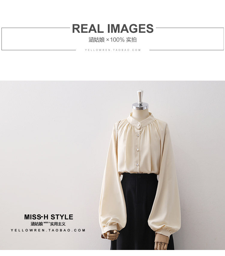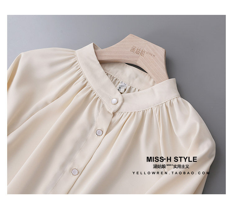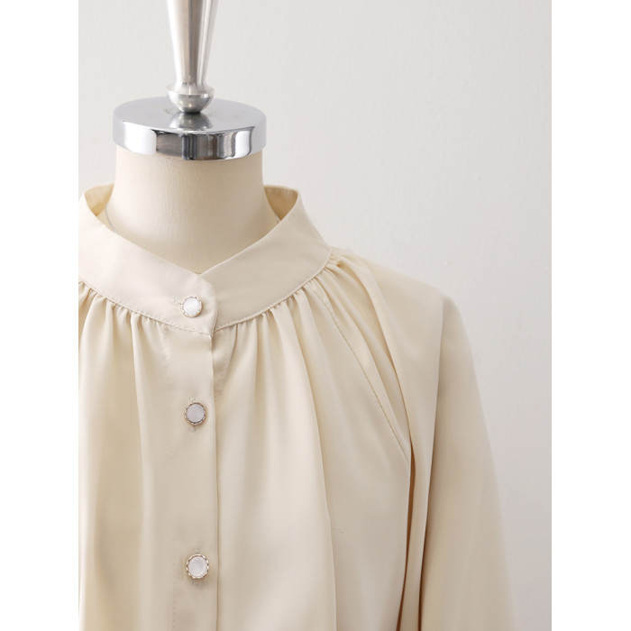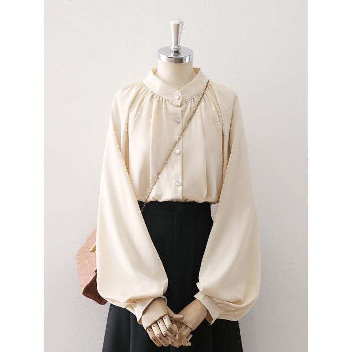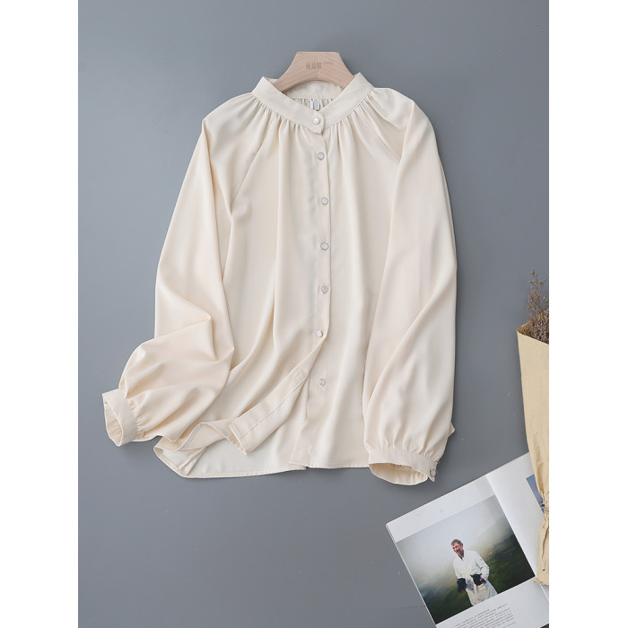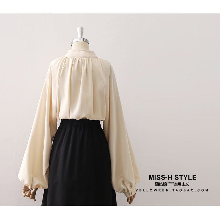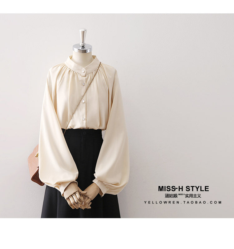 復古法式杏色立領燈籠袖緞面襯衫女2025春秋新款垂墜感小衆上衣