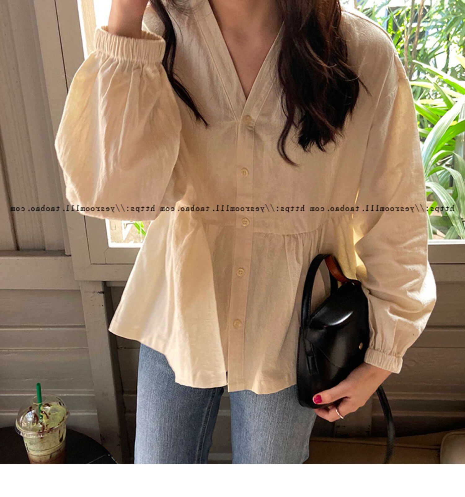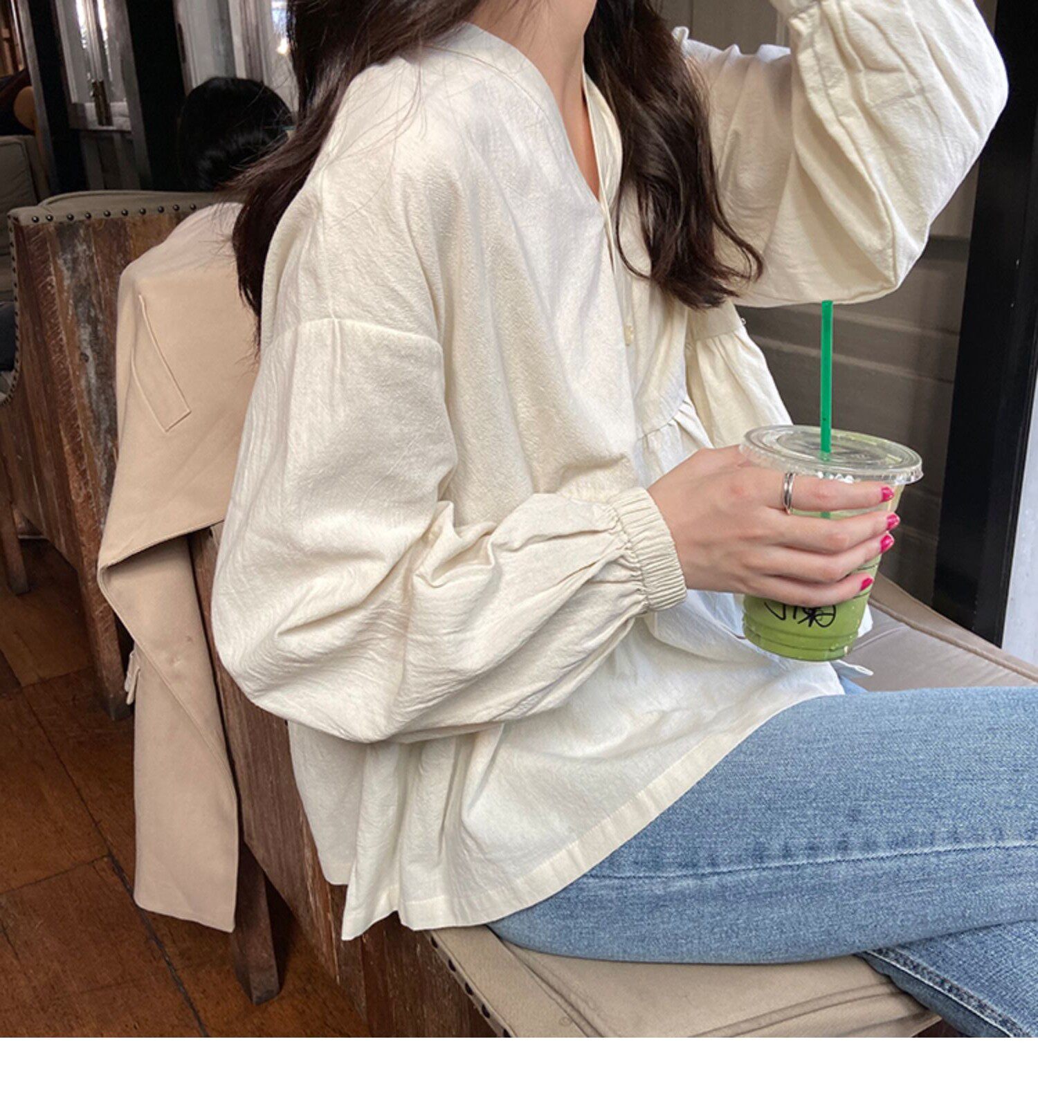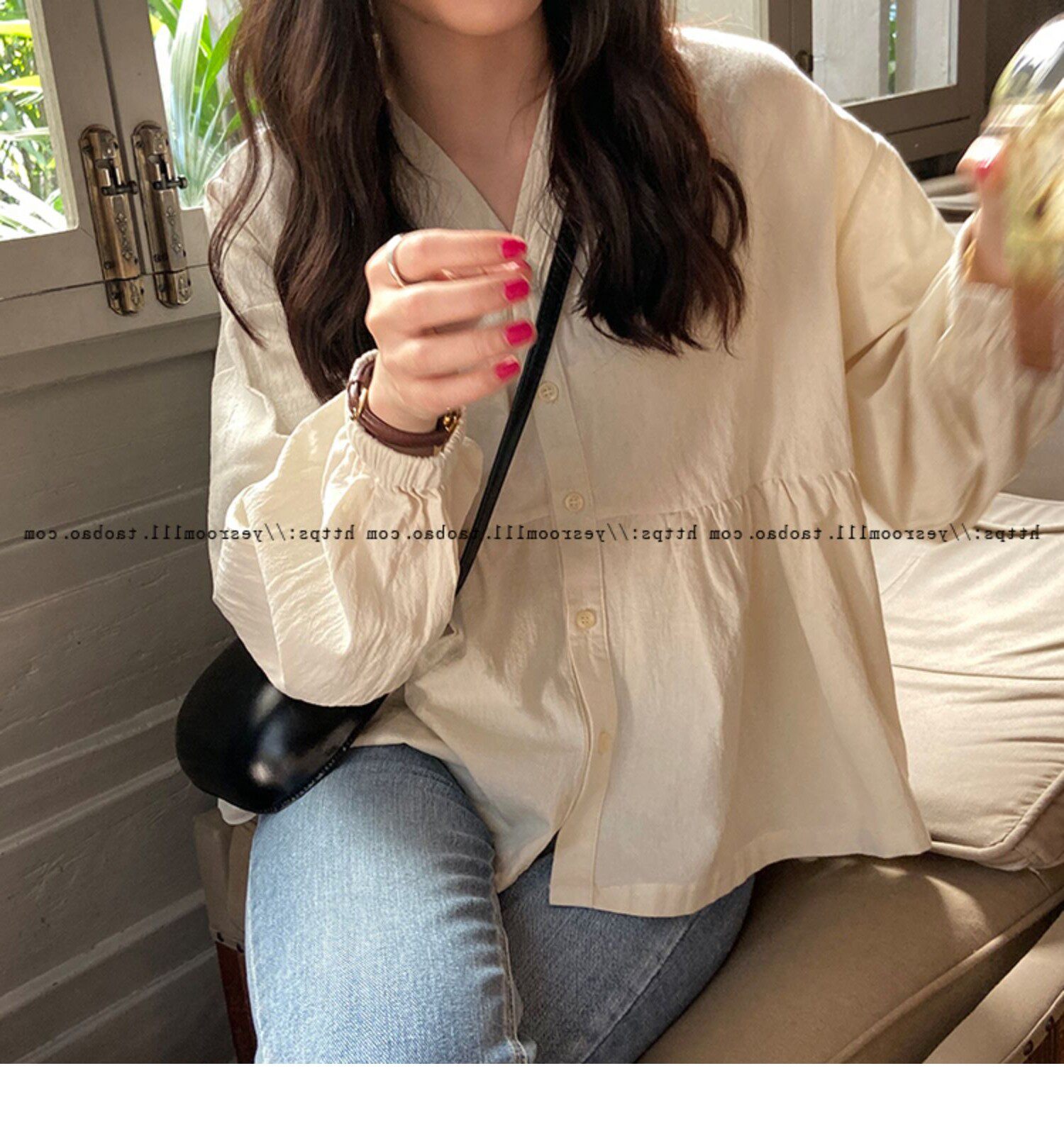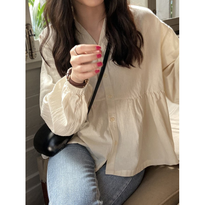 溫柔韓系寬鬆V領杏色襯衫ins百搭設計感2026早春款排釦長袖娃娃衫