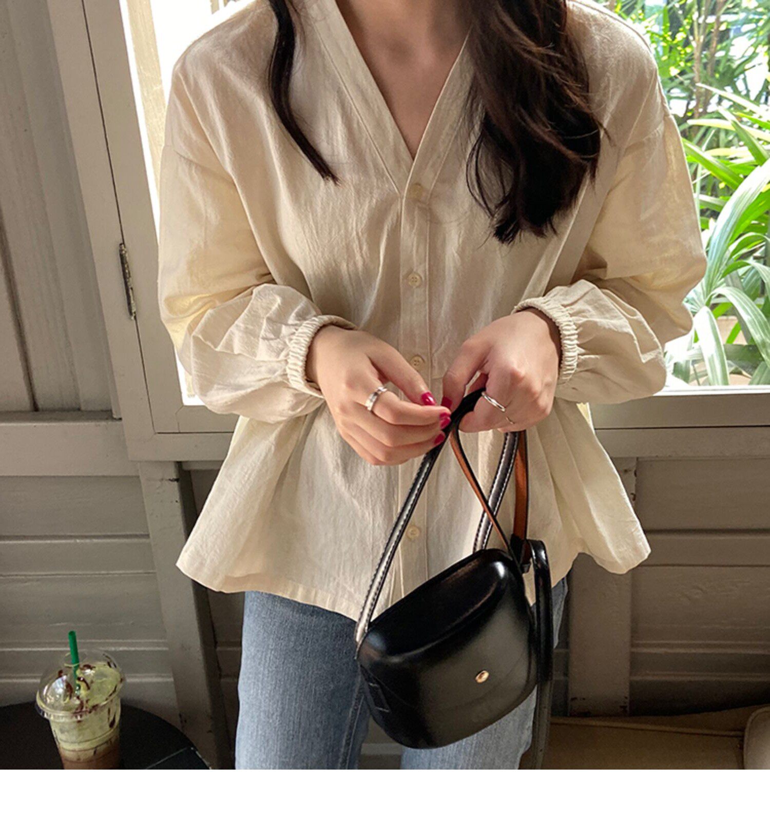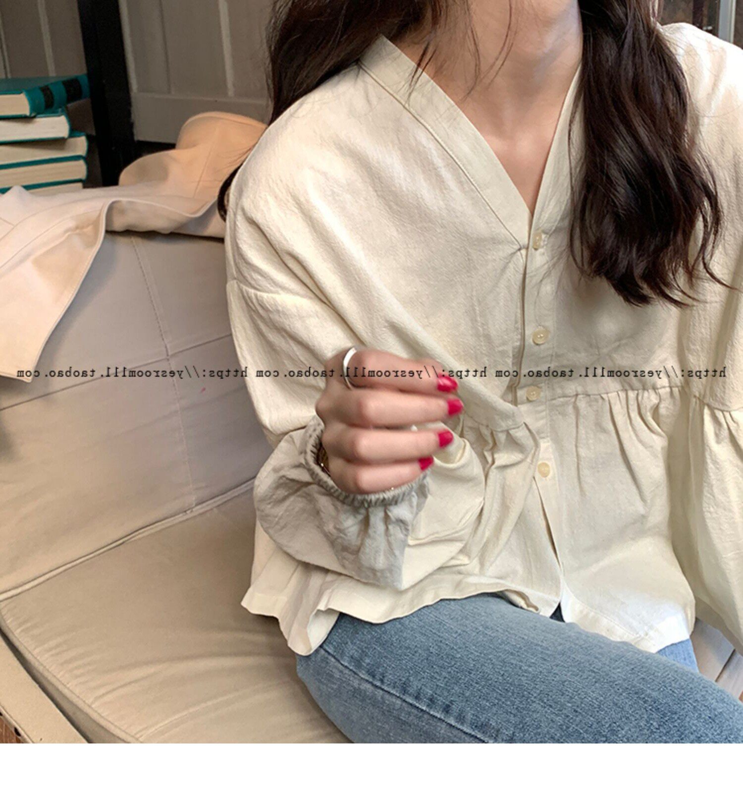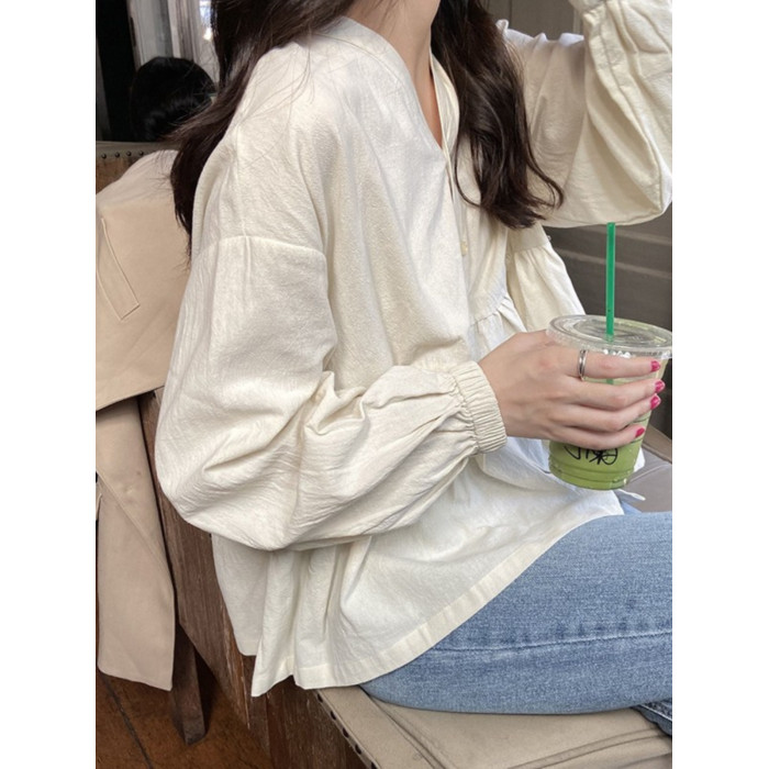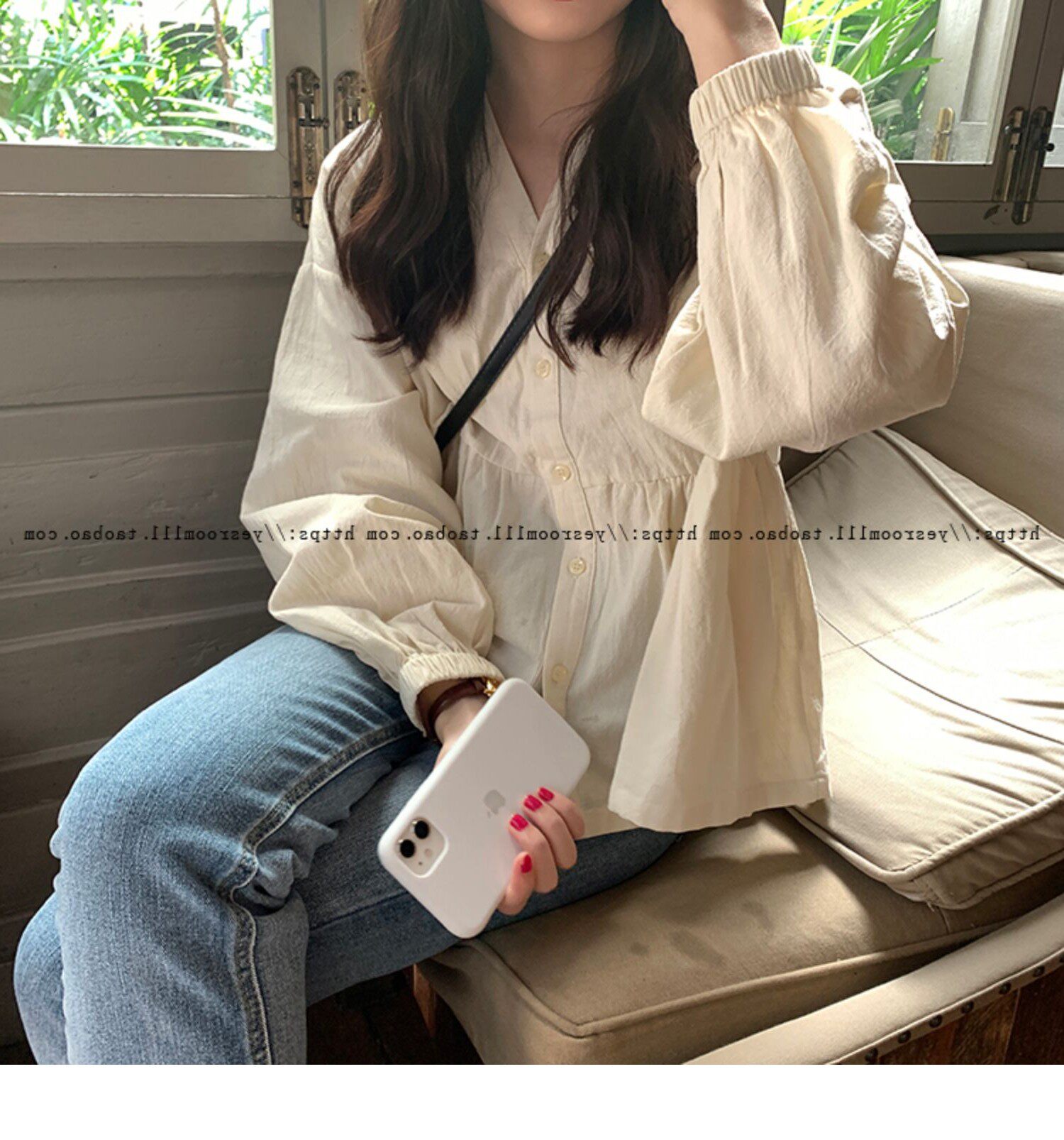 溫柔韓系寬鬆V領杏色襯衫ins百搭設計感2026早春款排釦長袖娃娃衫
