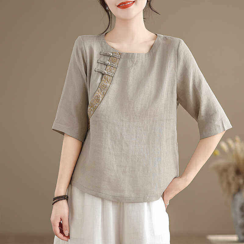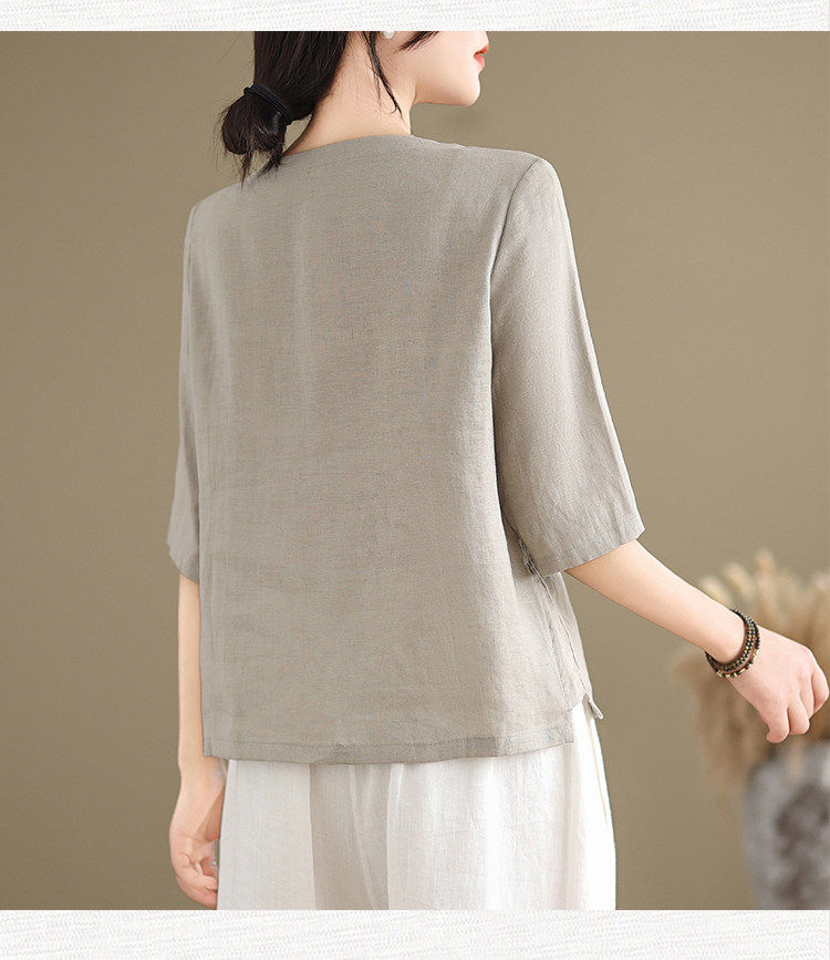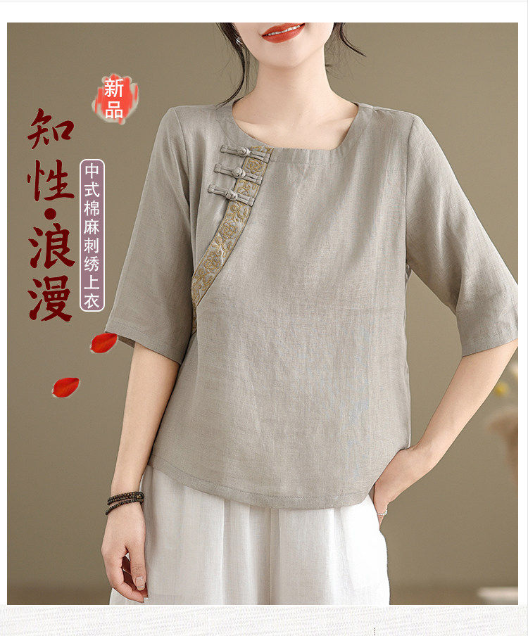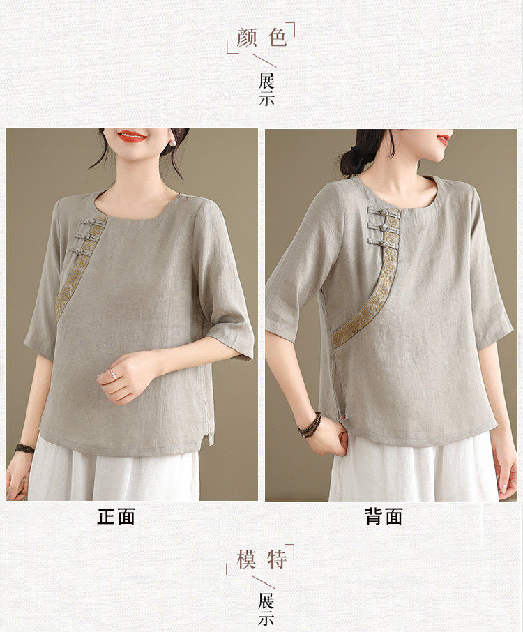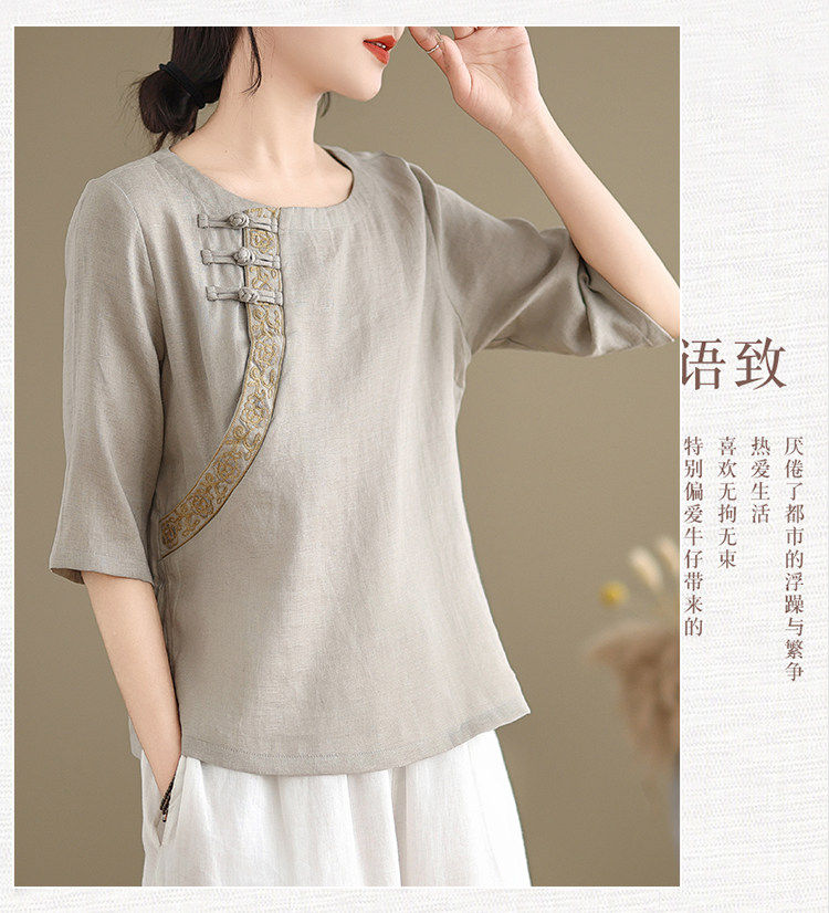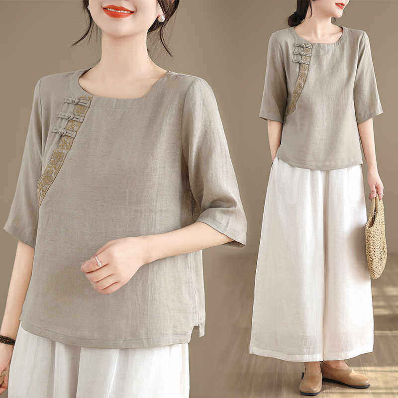 2026復古氣質大亞麻尺碼T恤中式上衣顯瘦素雅襯衫棉麻半袖女