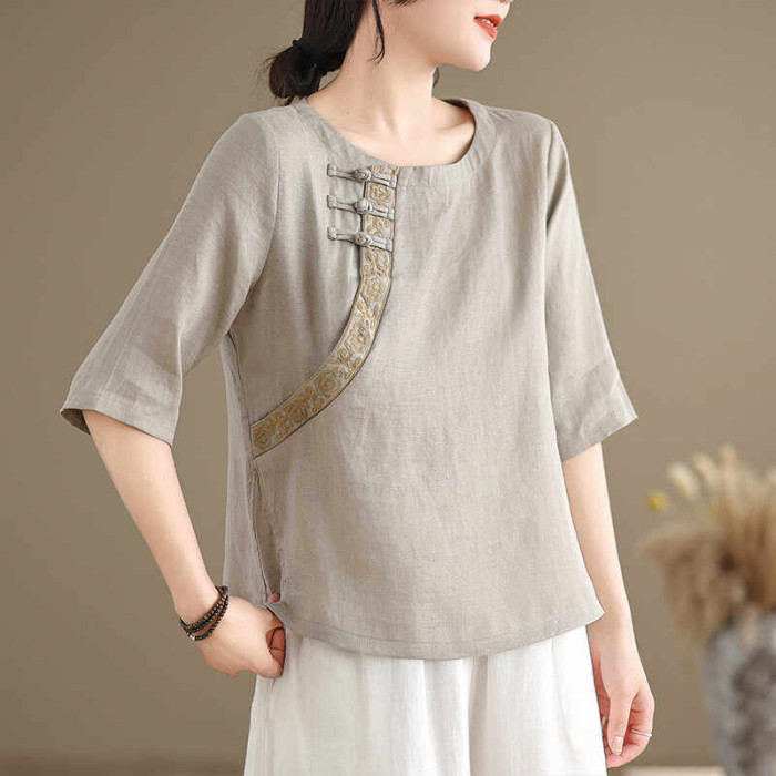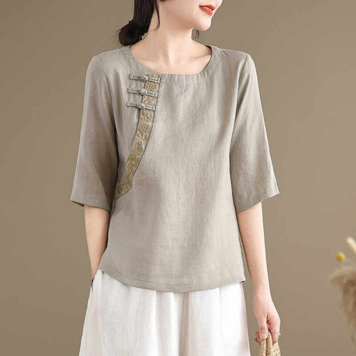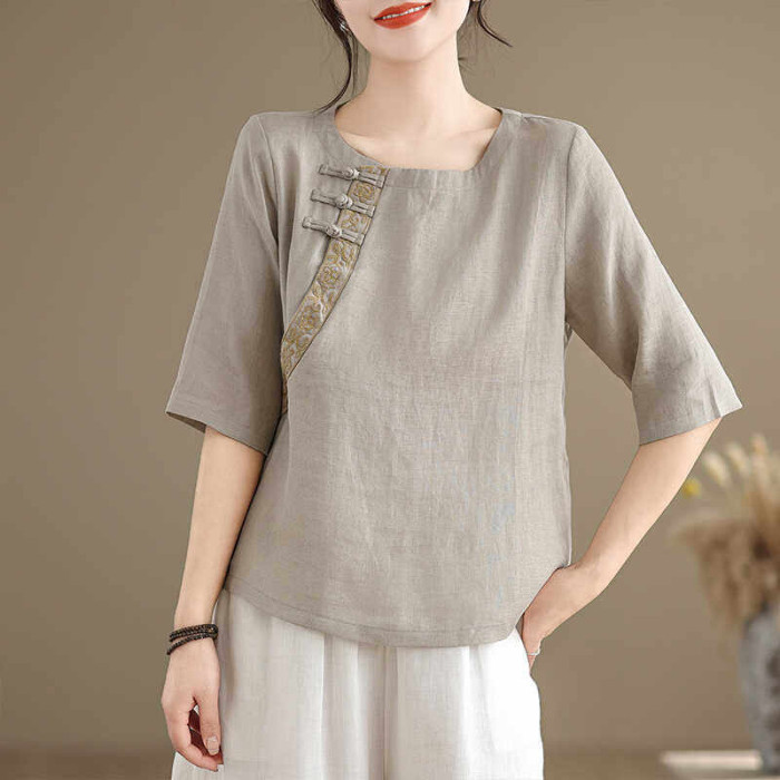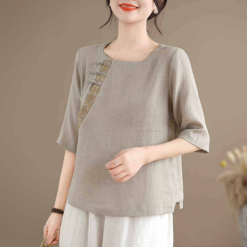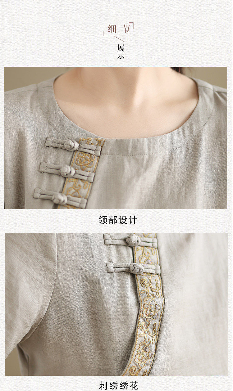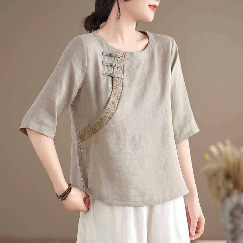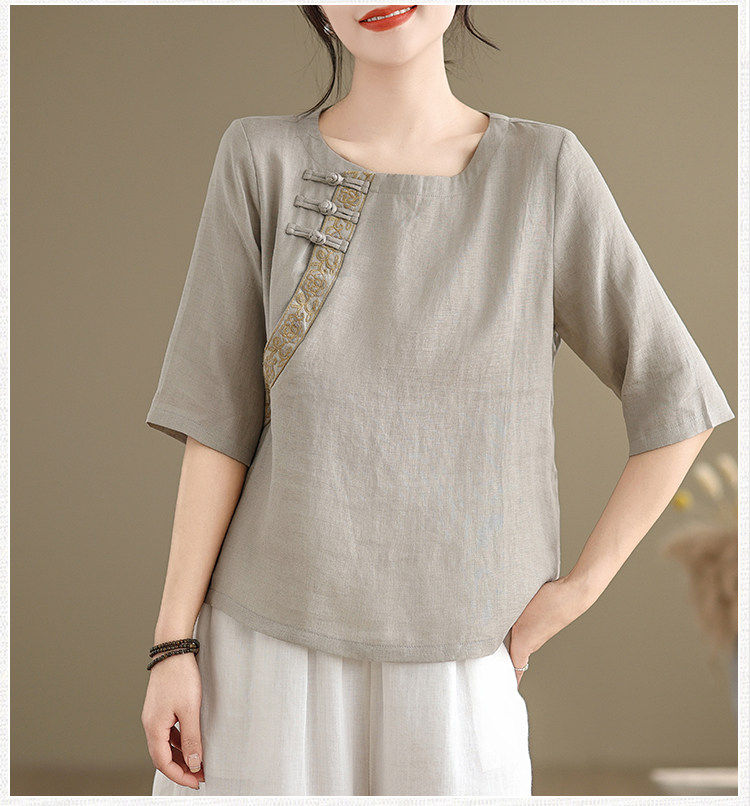 2026復古氣質大亞麻尺碼T恤中式上衣顯瘦素雅襯衫棉麻半袖女