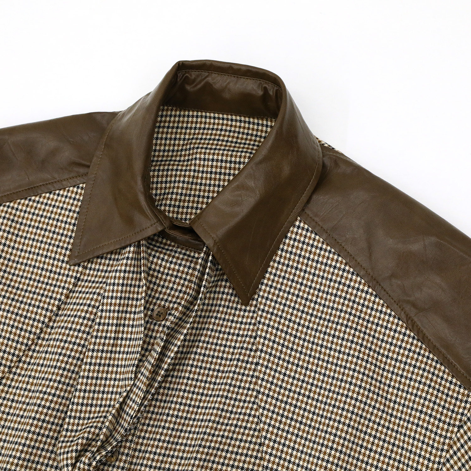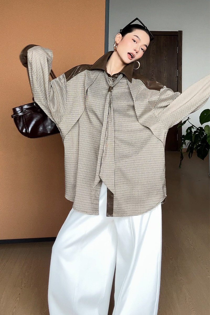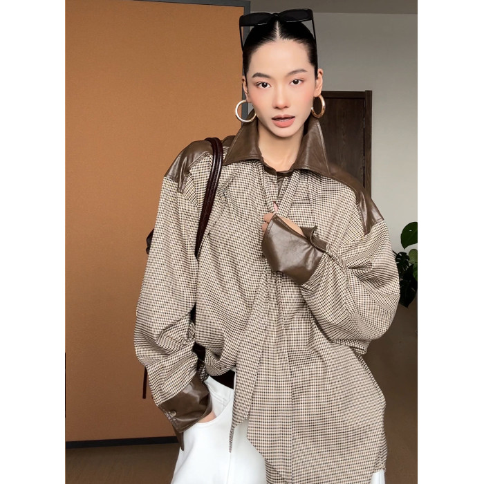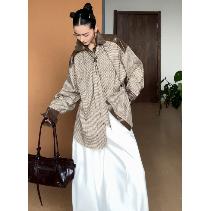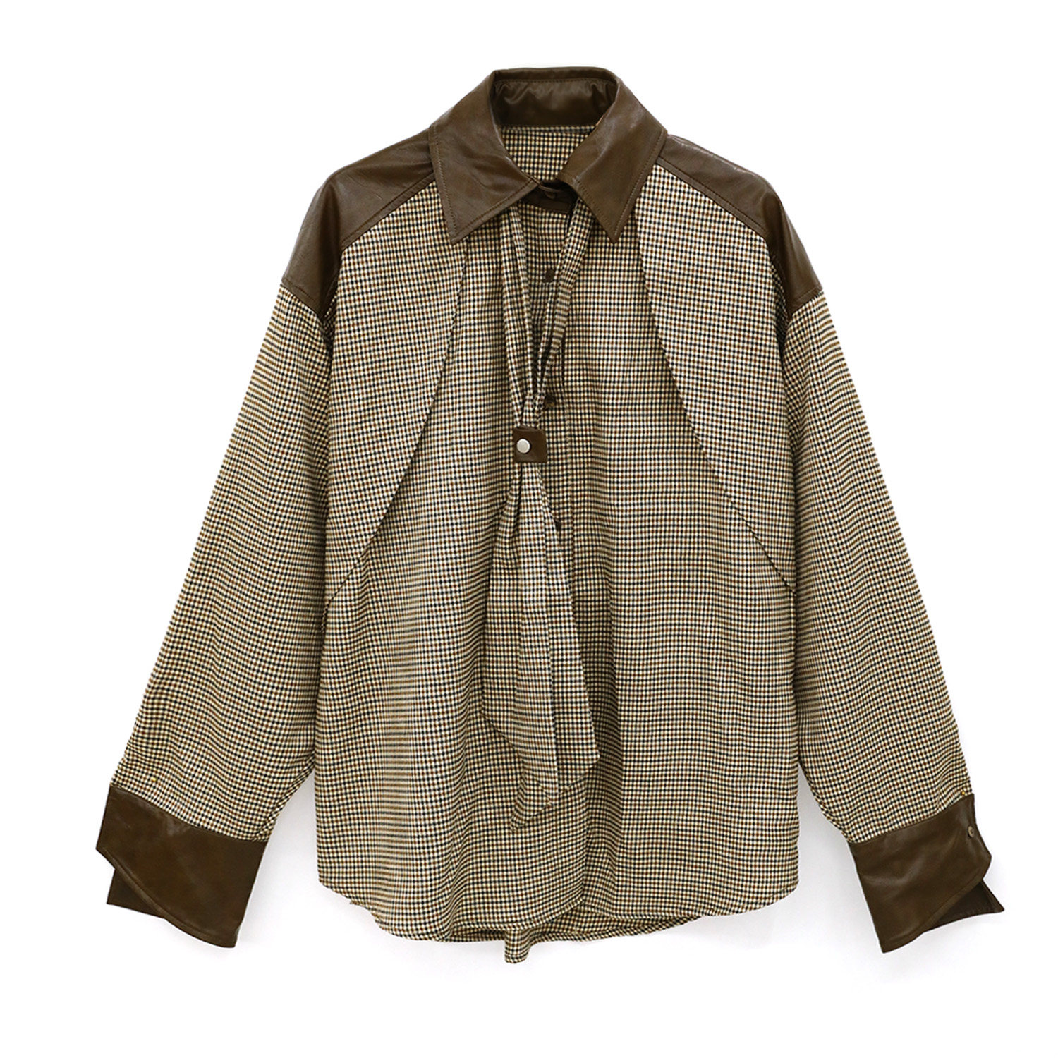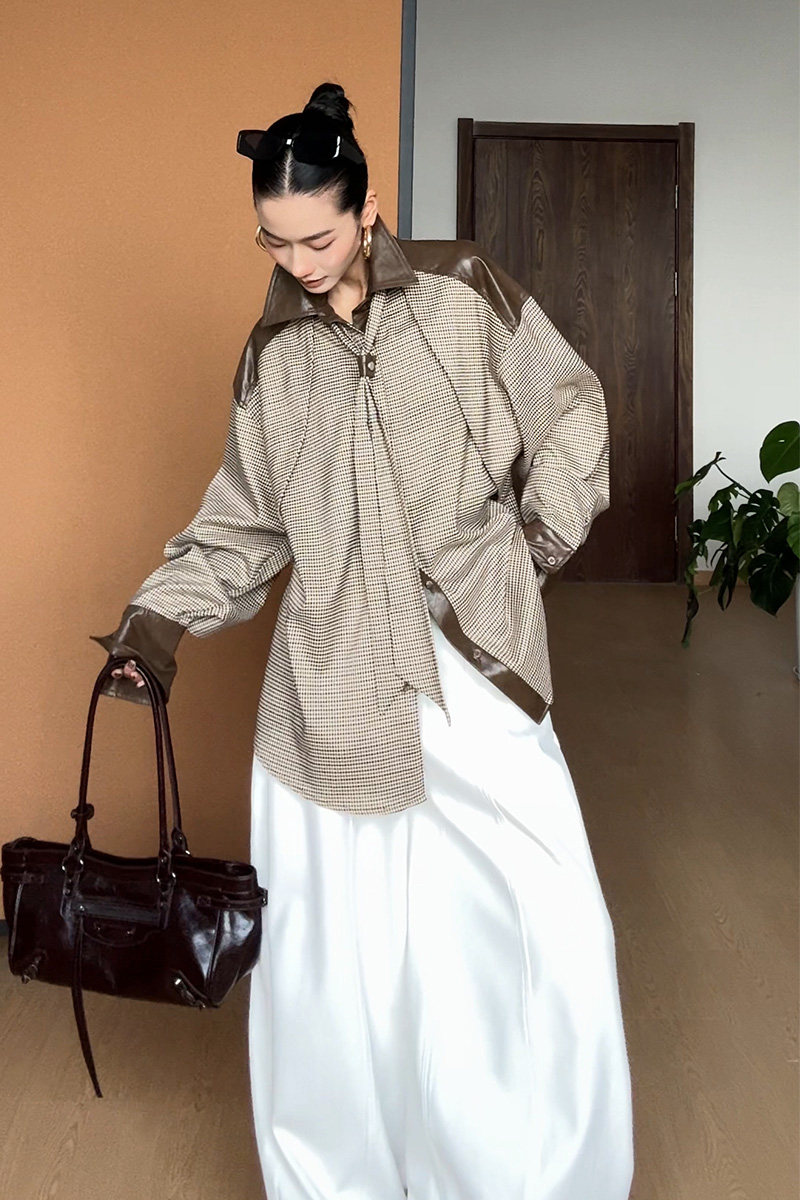 CIZZLEMORE【自由循跡】設計款美拉德撞色拼皮千鳥格領帶式襯衫