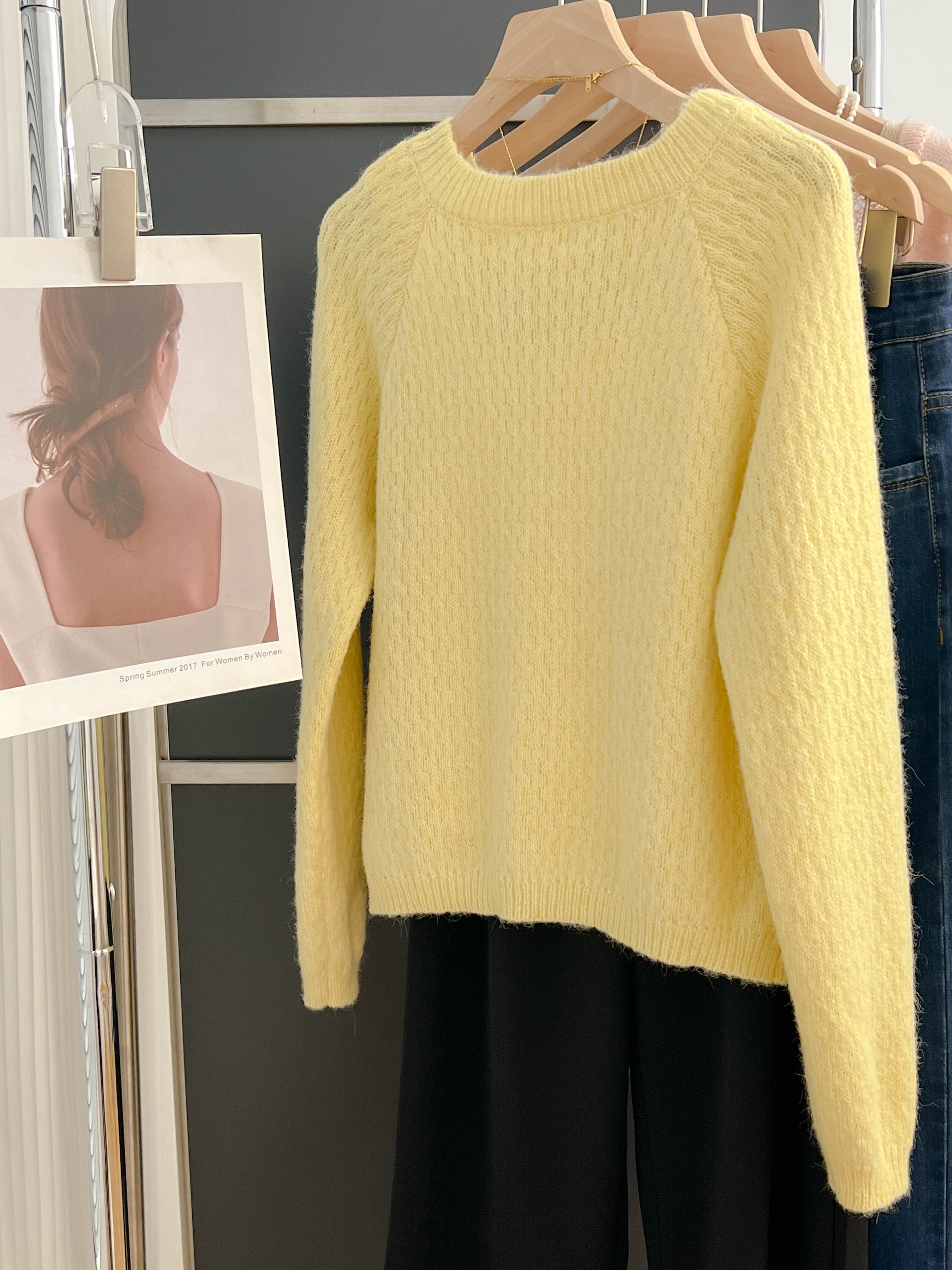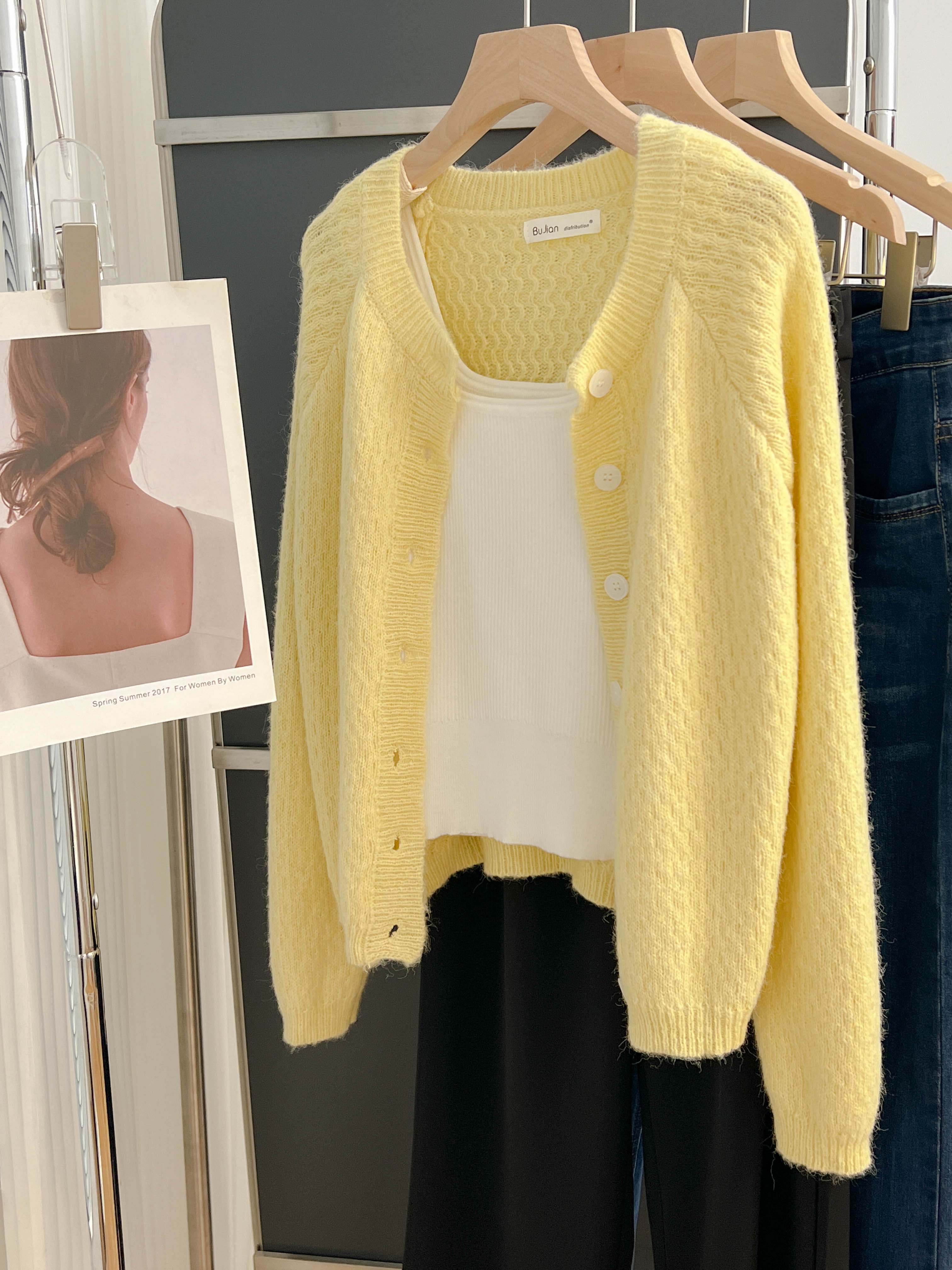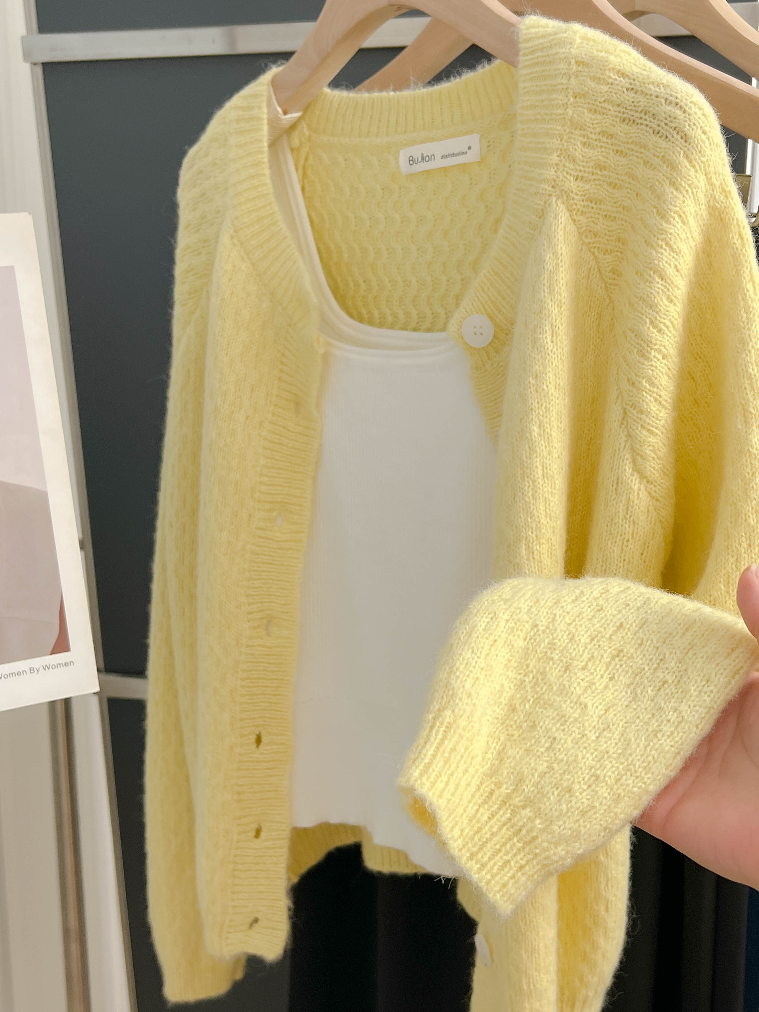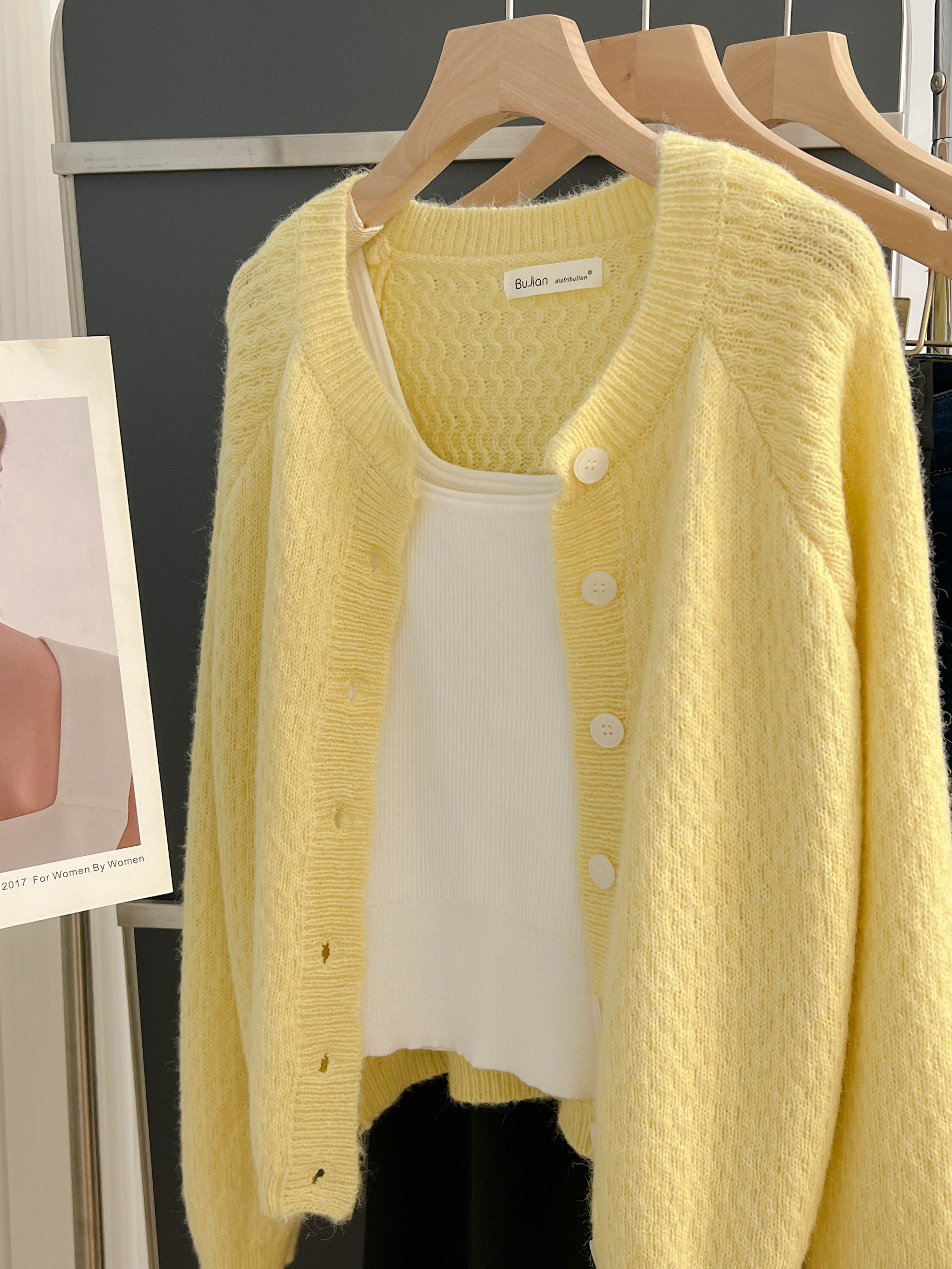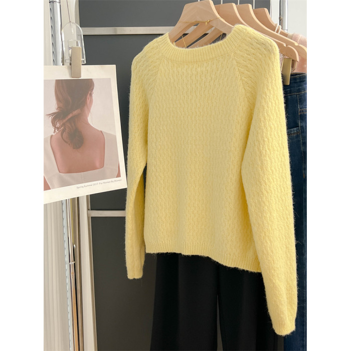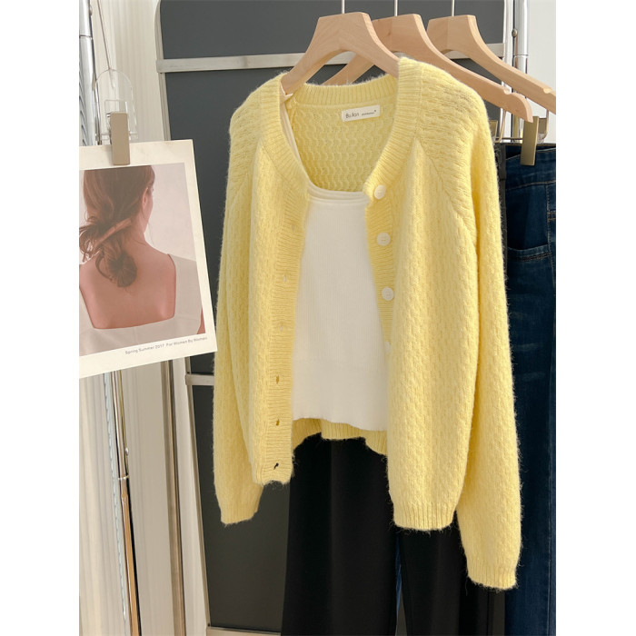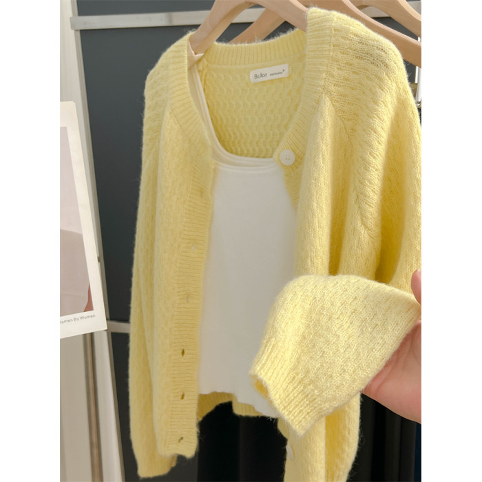 大牌春秋薄款黃色羊毛針織開衫浣熊絨軟糯慵懶風圓領毛衣外套