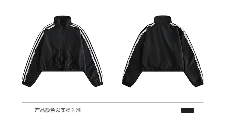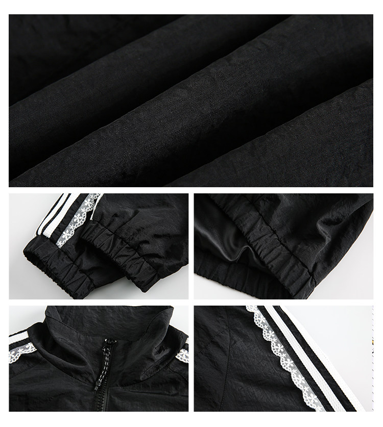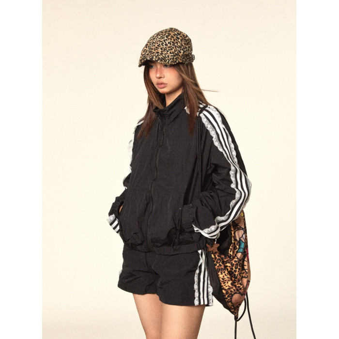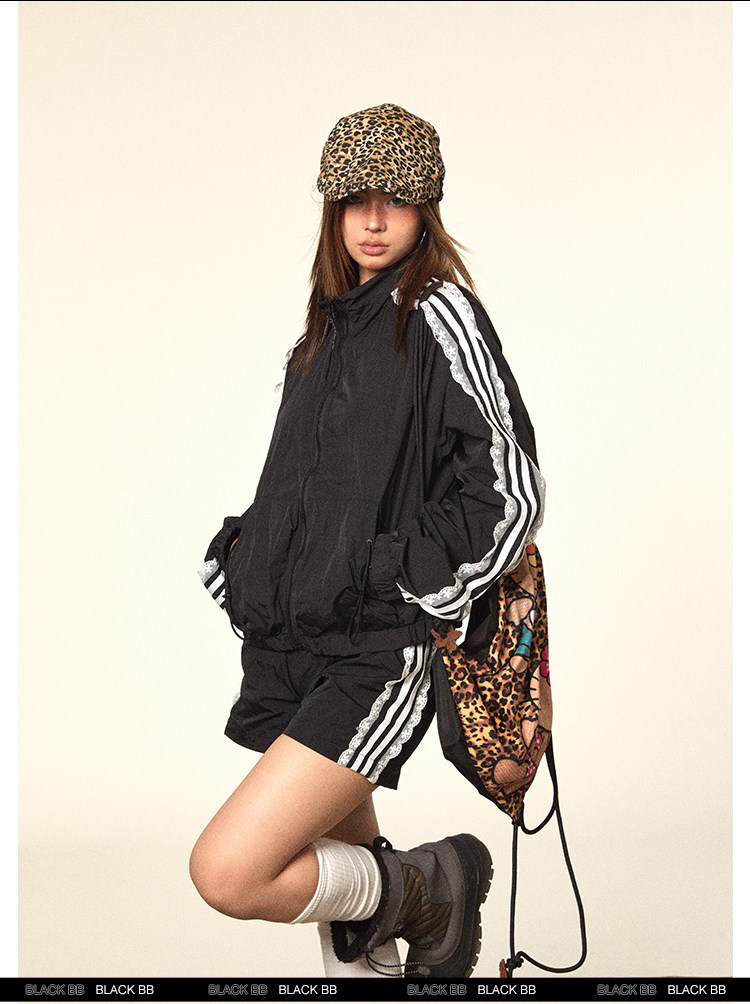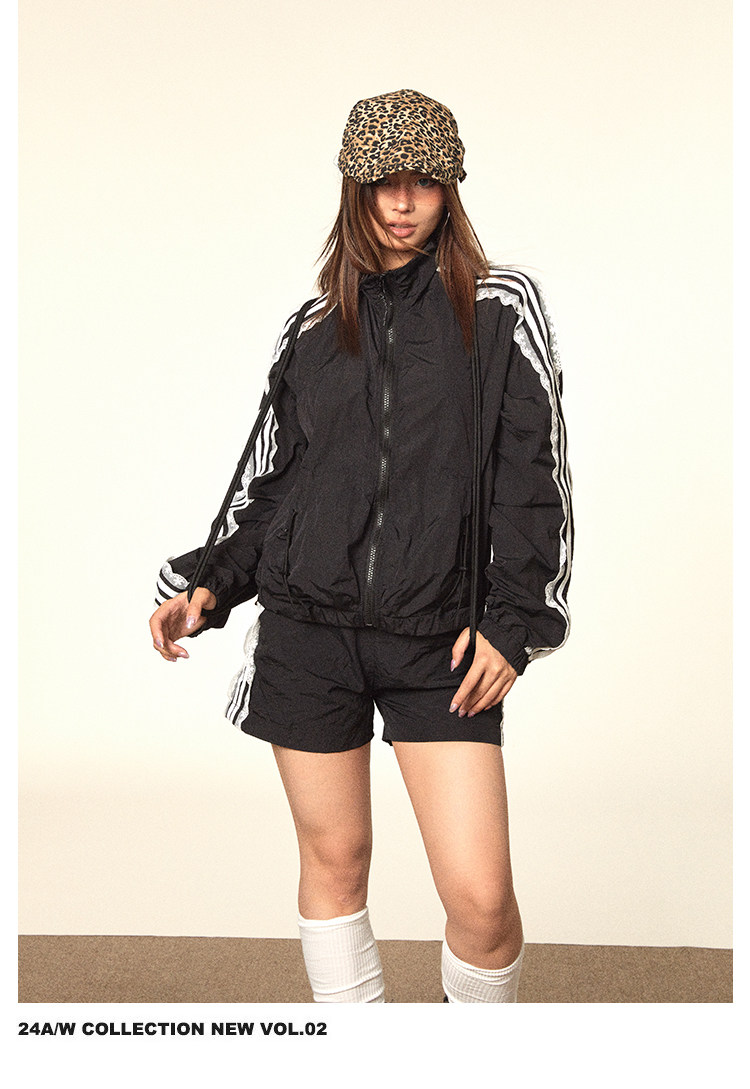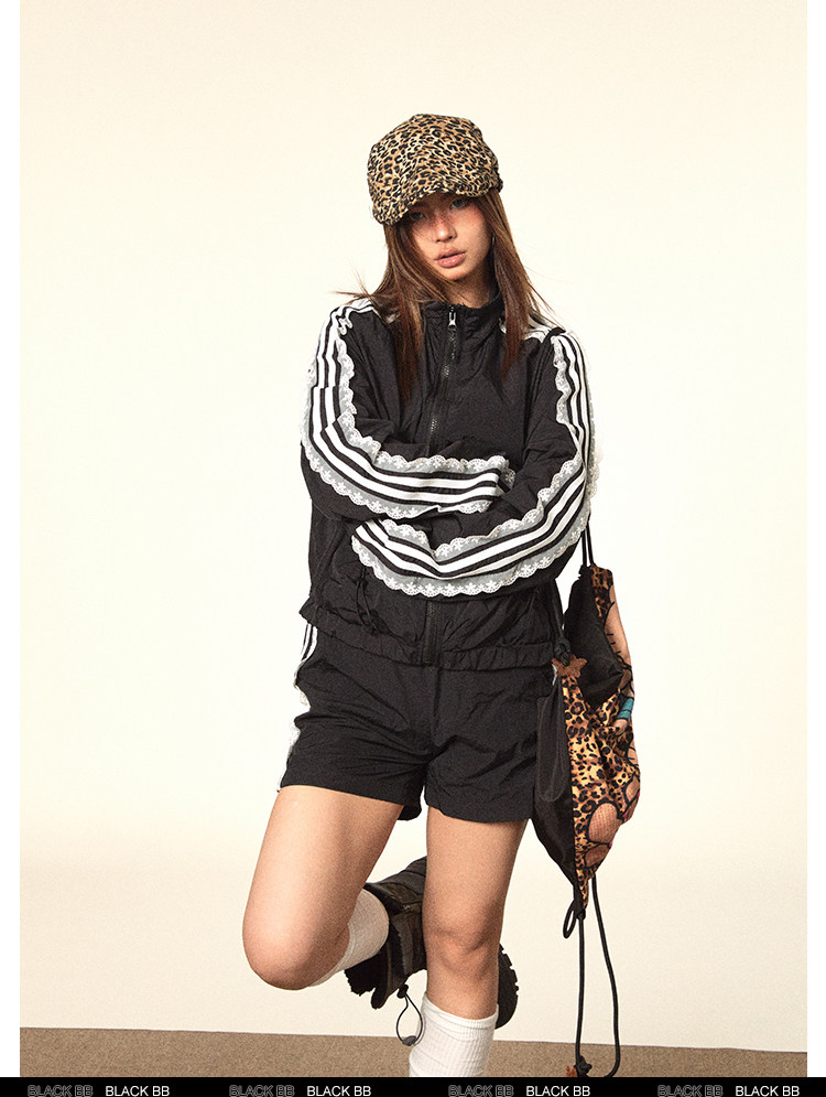 BLACKBB/蕾絲拼接拉鍊外套三條杠防曬衫運動套裝美式復古熱褲女夏