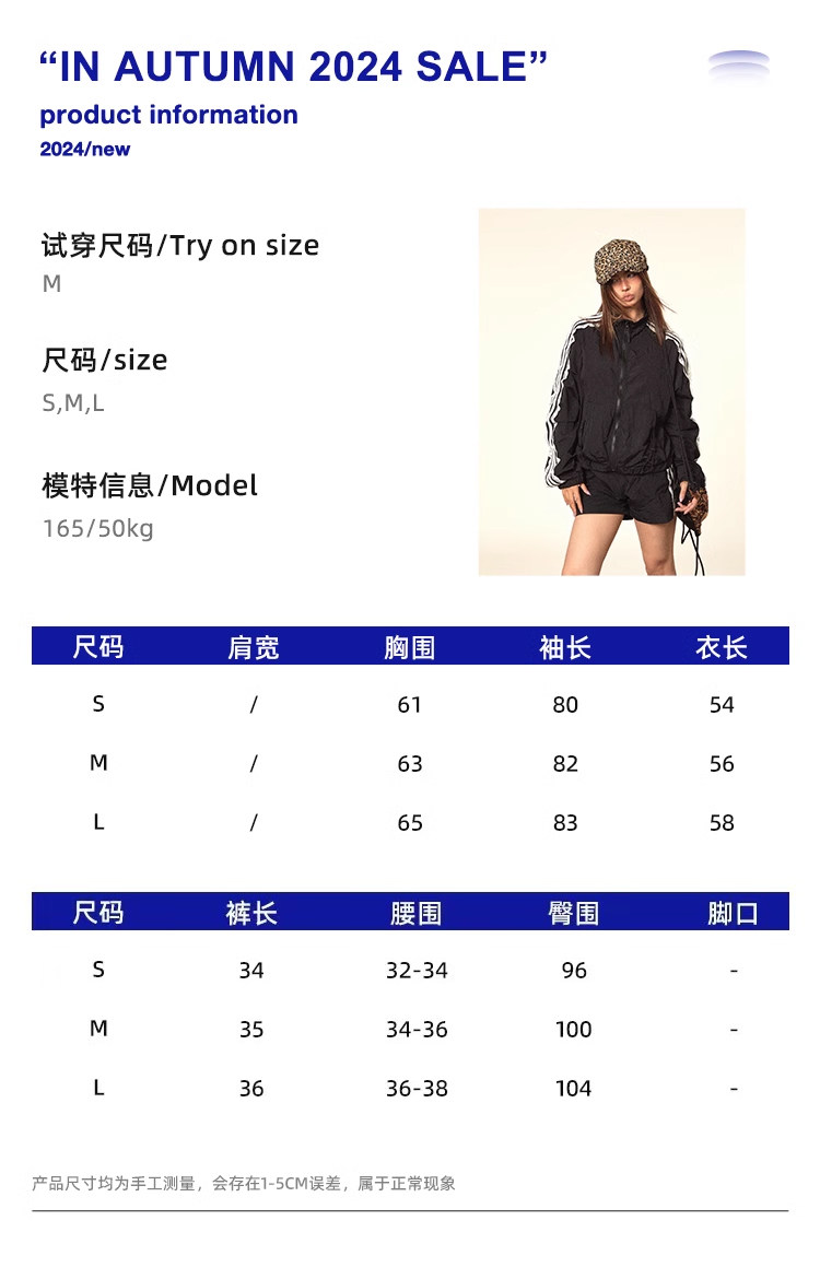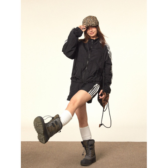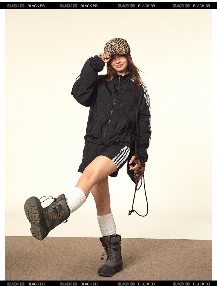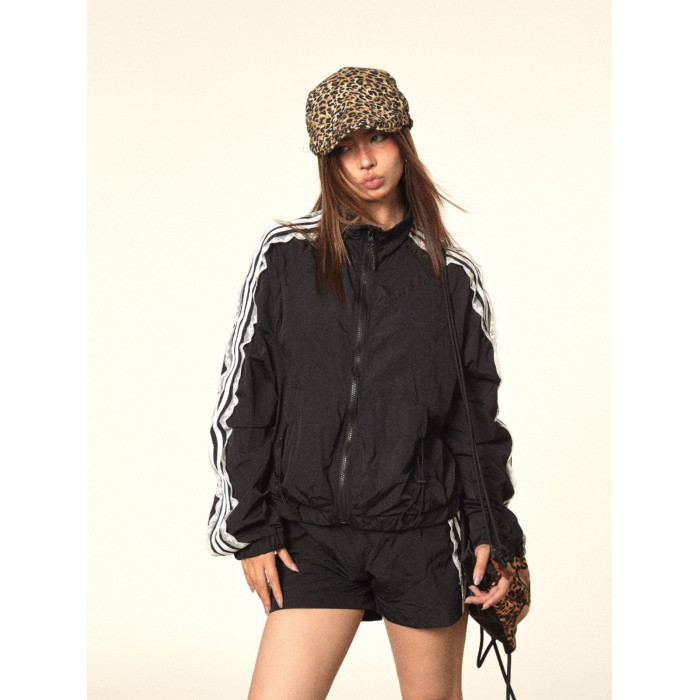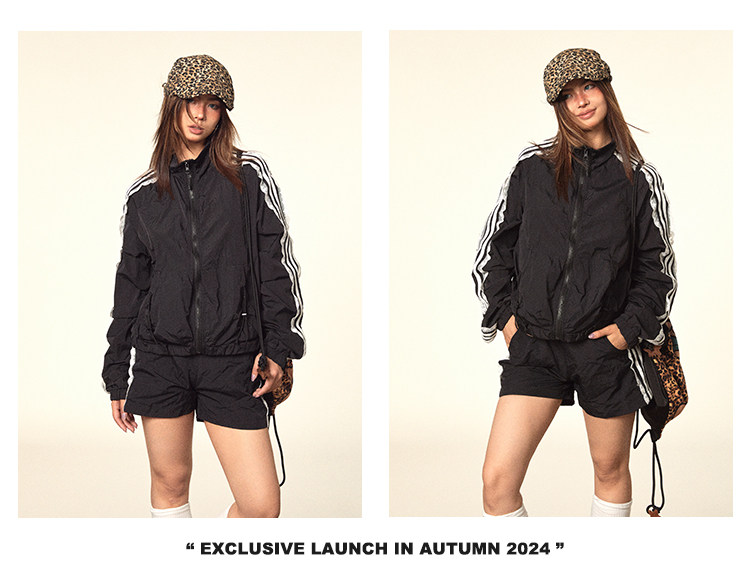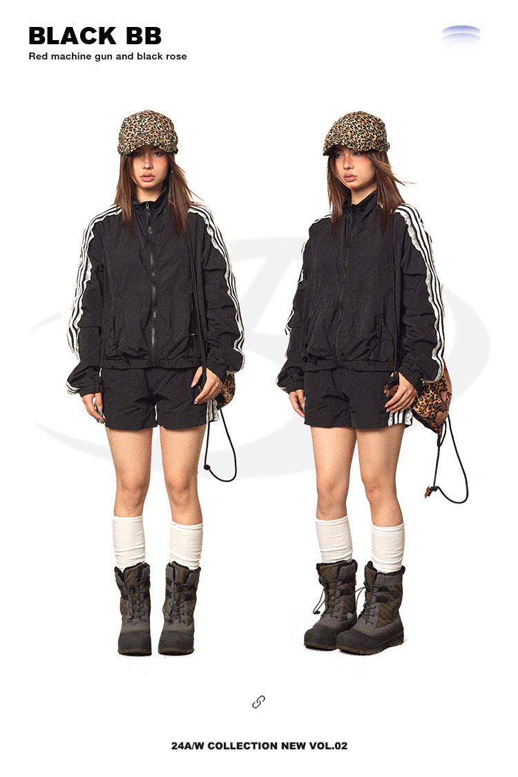 BLACKBB/蕾絲拼接拉鍊外套三條杠防曬衫運動套裝美式復古熱褲女夏