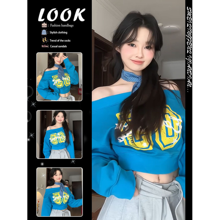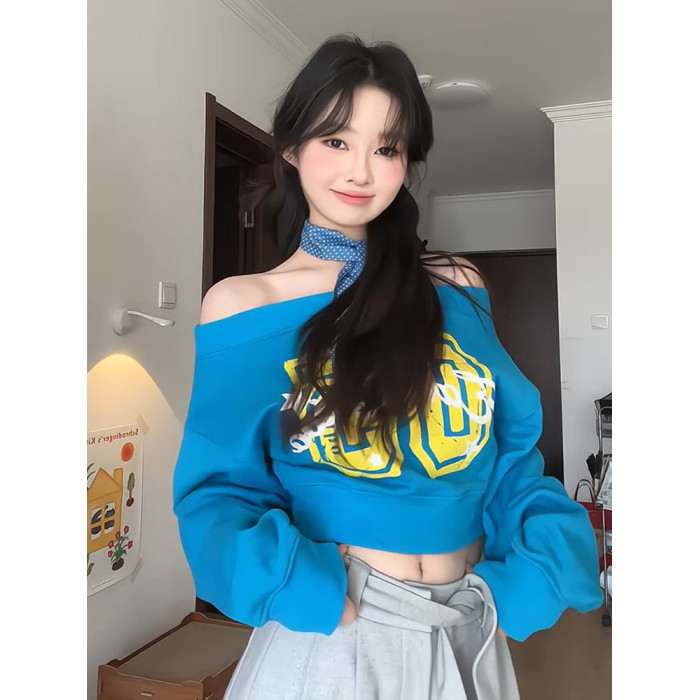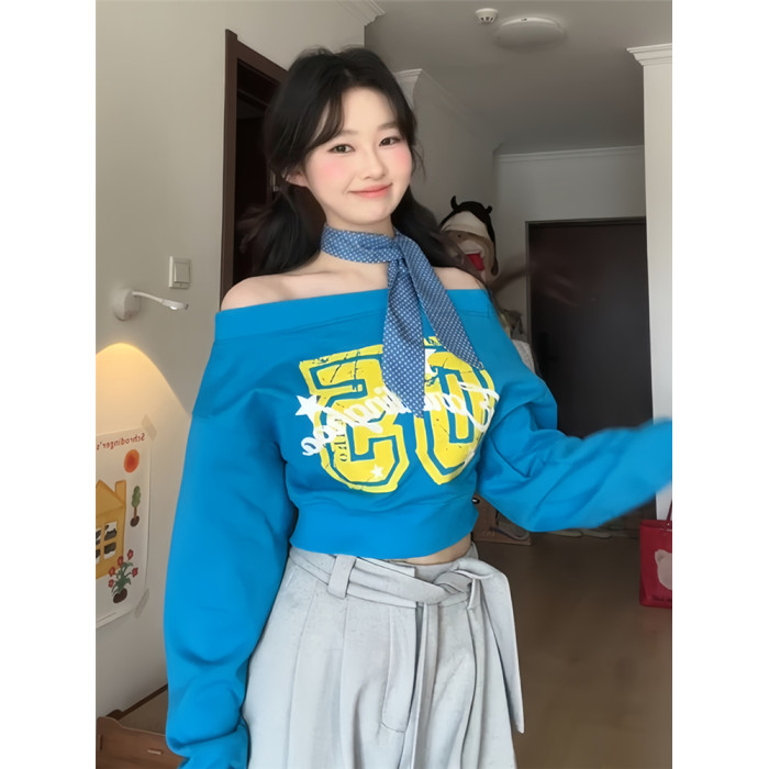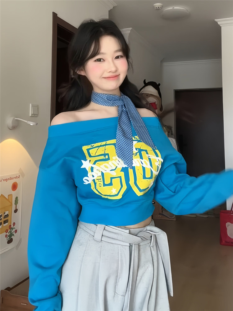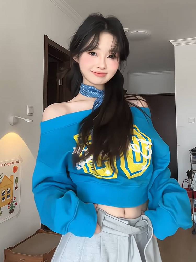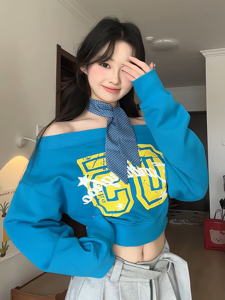 美式辣妹斜肩衛衣女春季字母印花修身顯瘦多巴胺藍色露肩長袖上衣