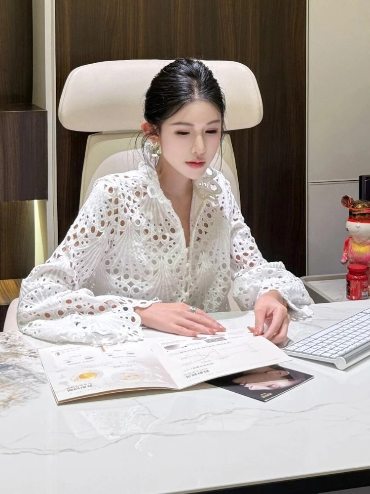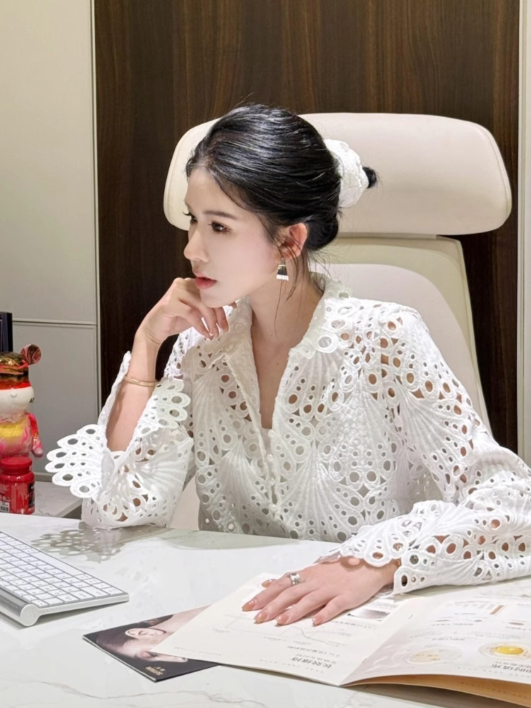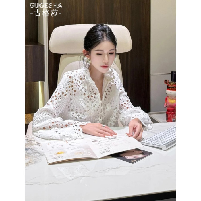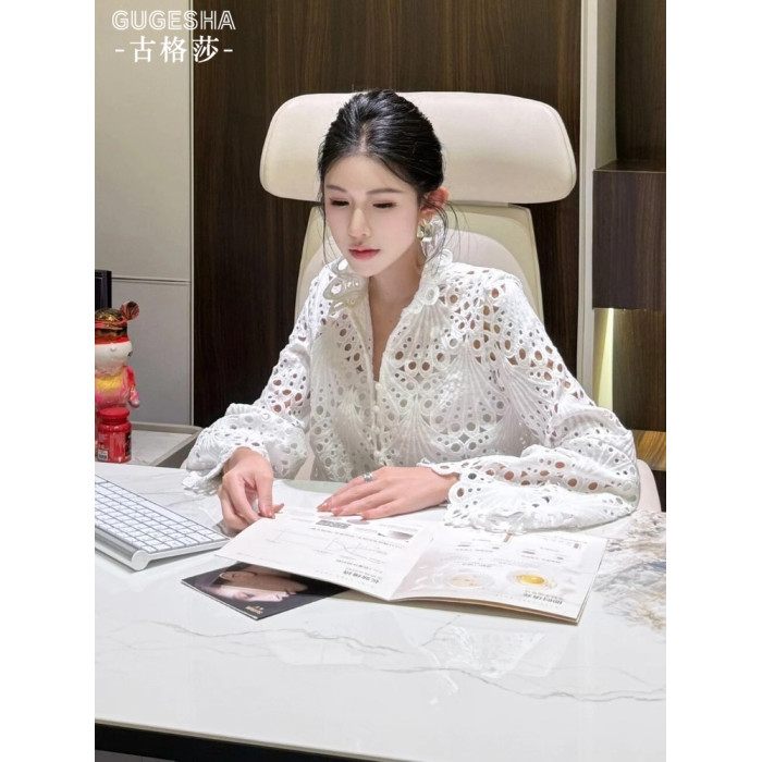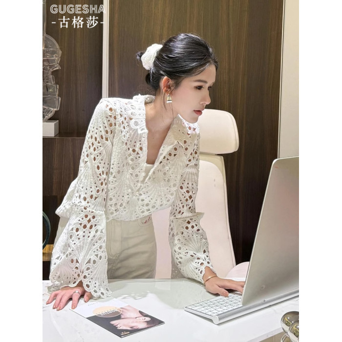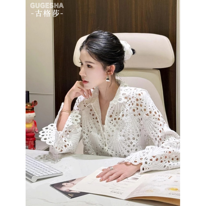 法式輕熟風白色鏤空繙領襯衫女夏季新款時尚小香風寬鬆長袖防曬衫