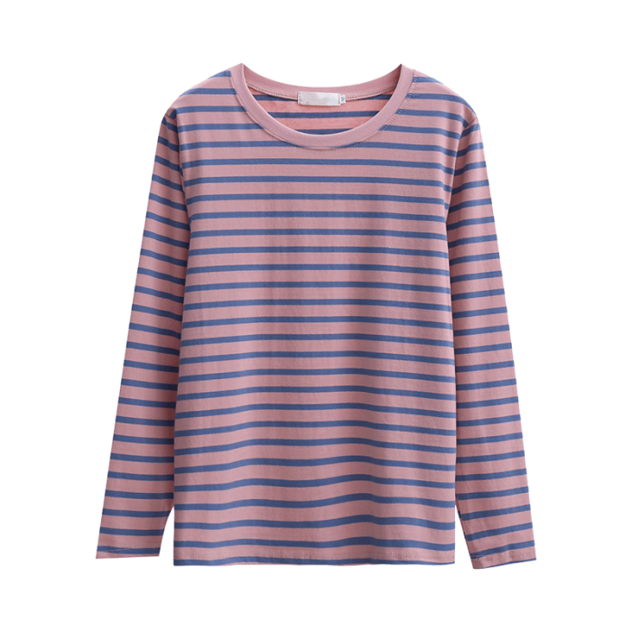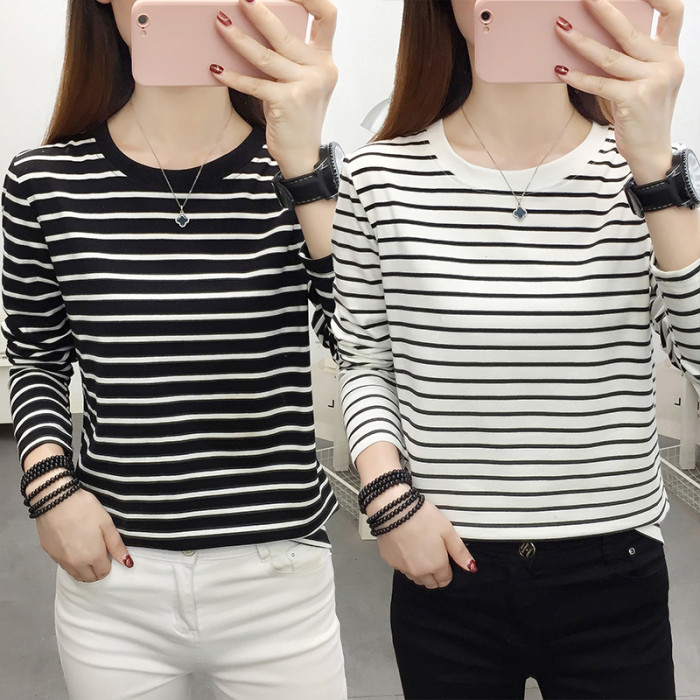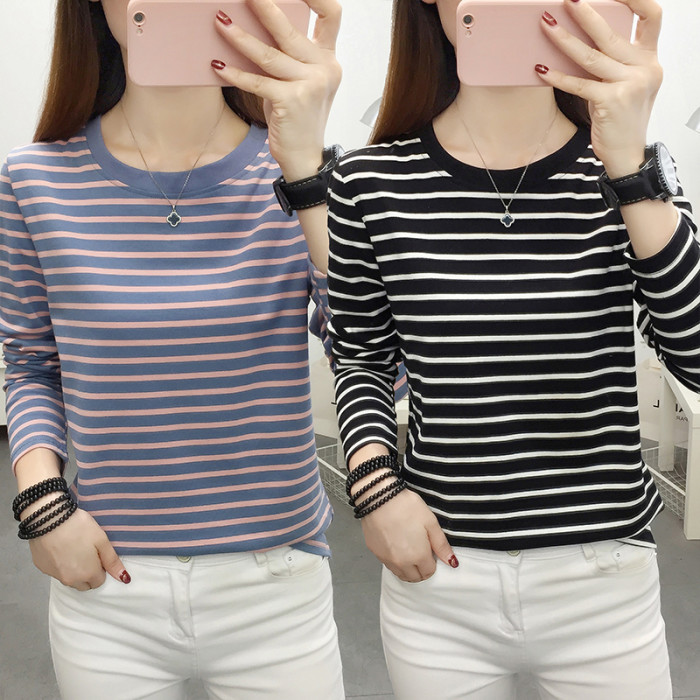 純棉條紋長袖t恤女裝2025年新款春秋裝寬鬆大碼女士打底衫上衣服