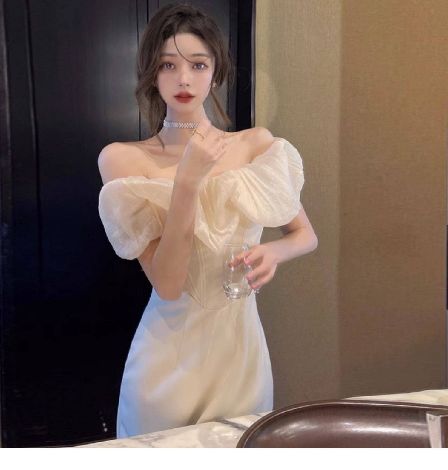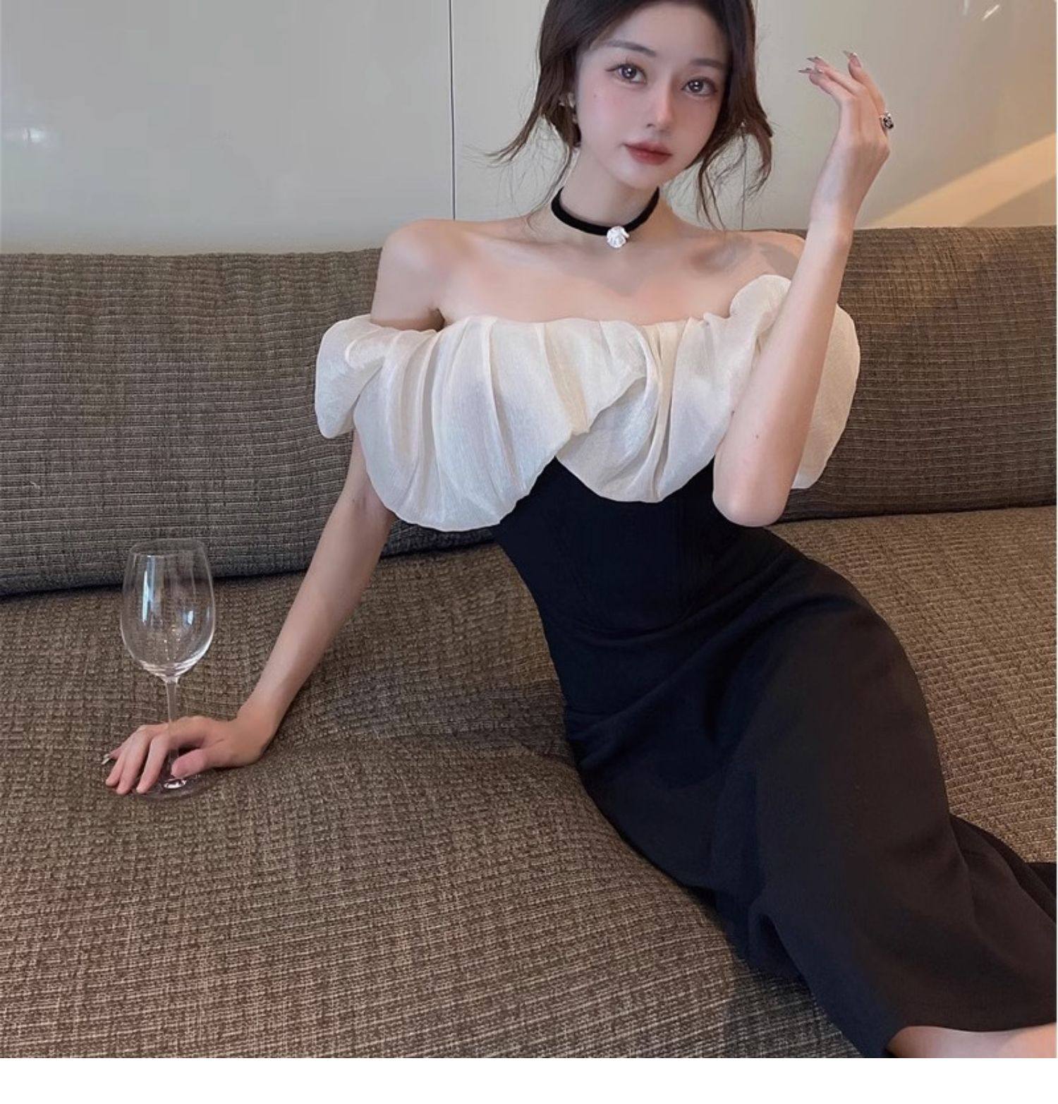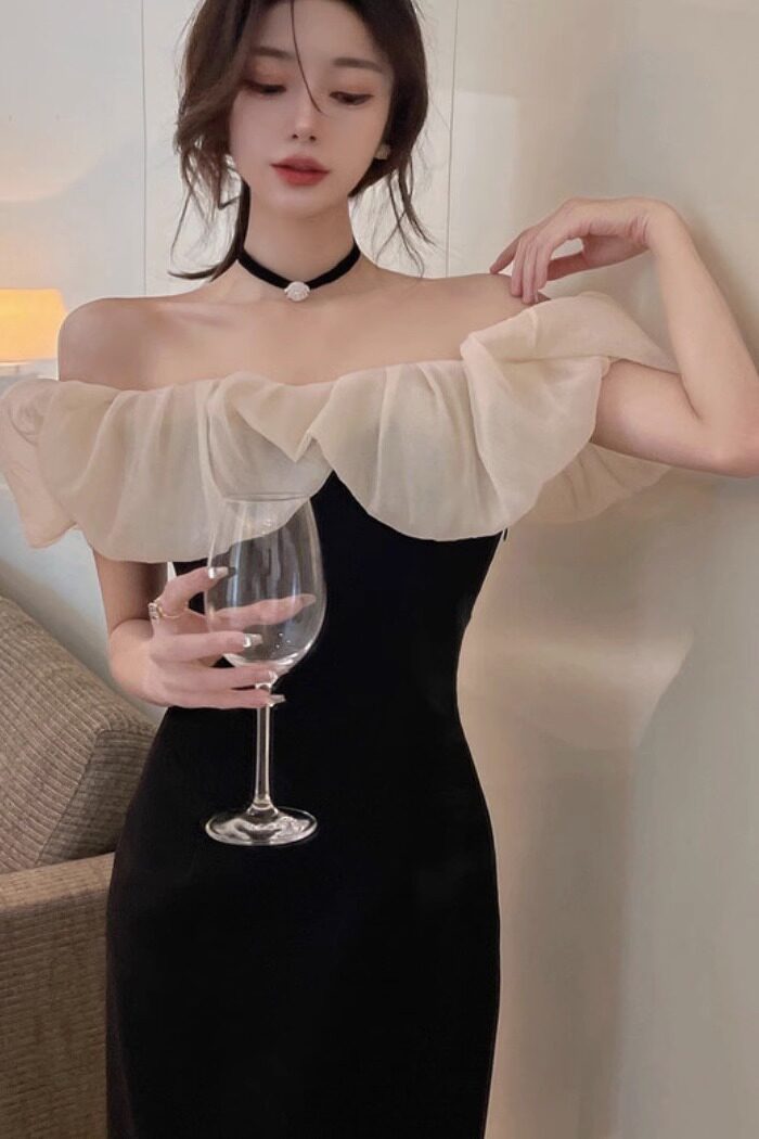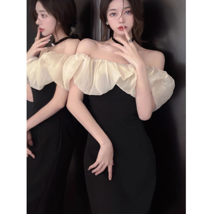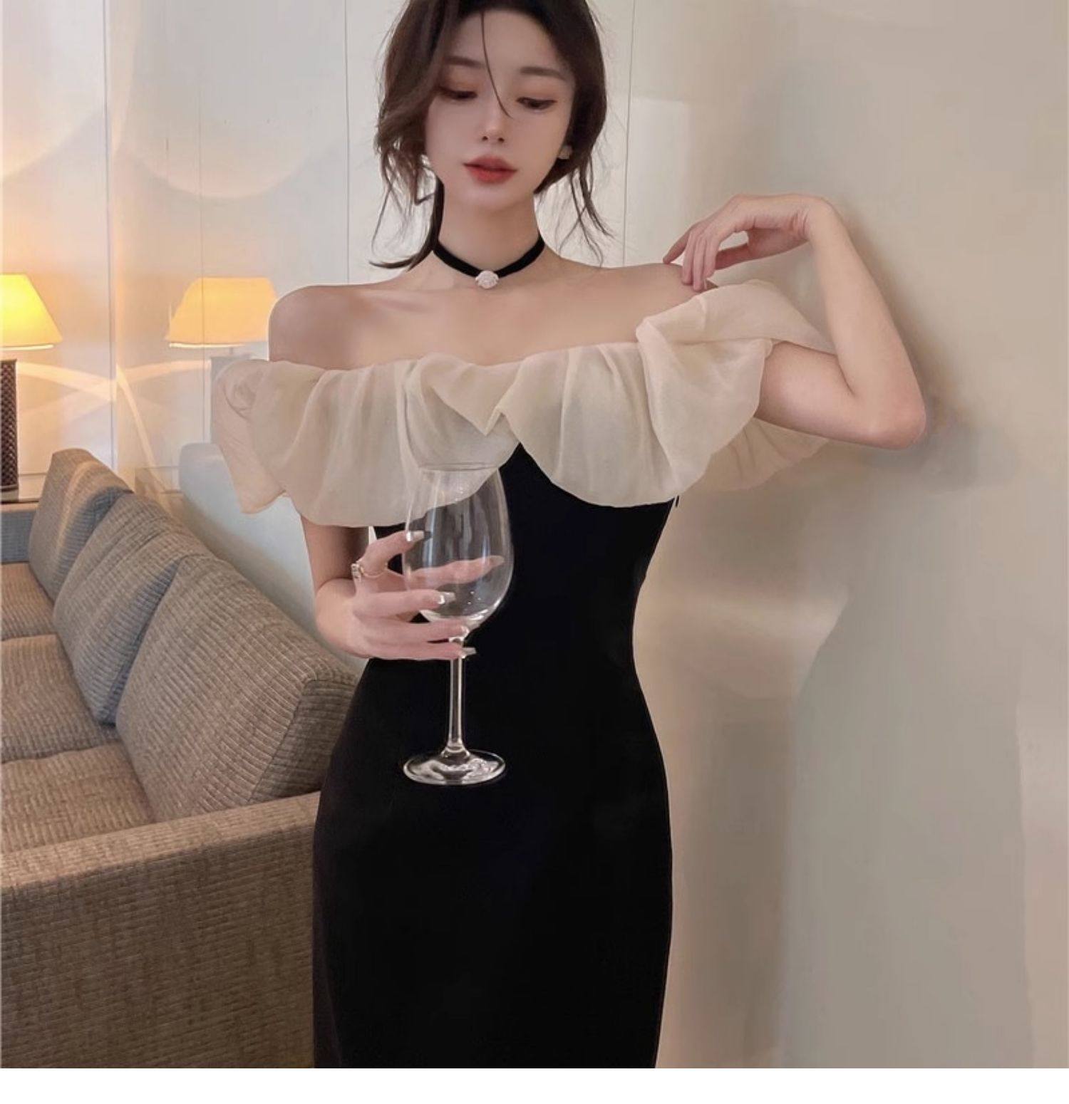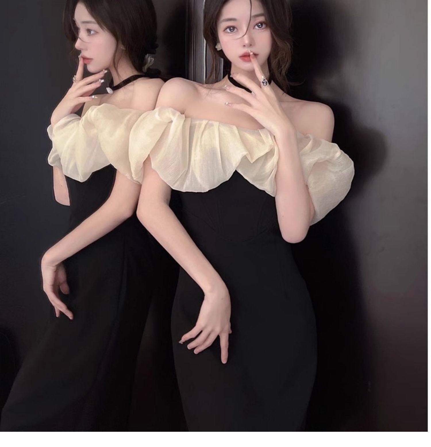 生日宴會晚禮服高級輕奢小衆氣質名媛法式高級感黑色一字肩連衣裙