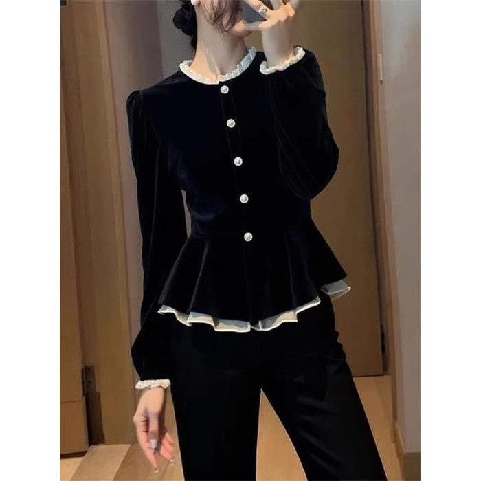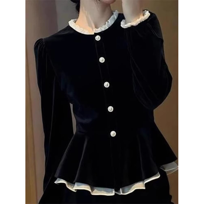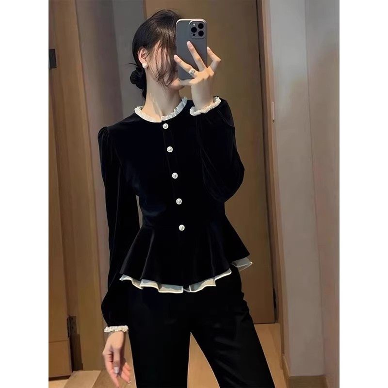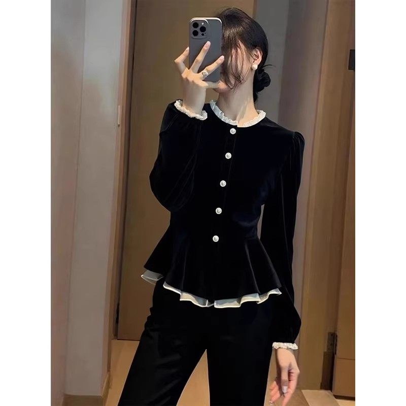 法式立領絲絨上衣女秋冬收腰裙擺小衫2025新款時尚洋氣長袖襯衫
