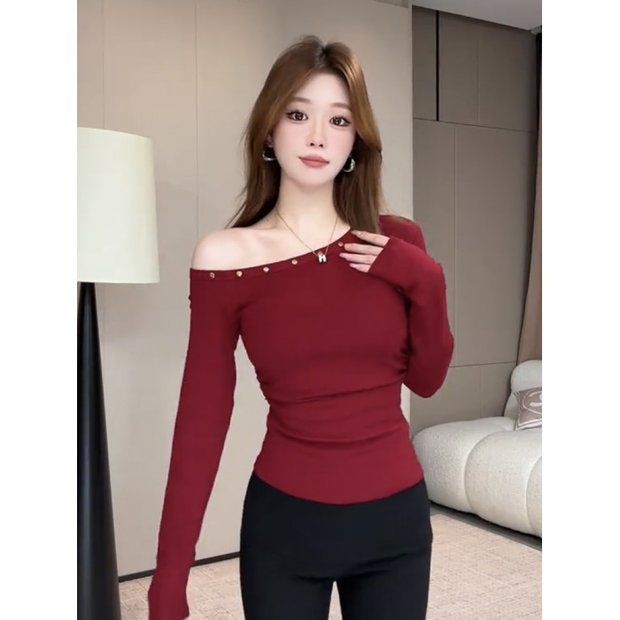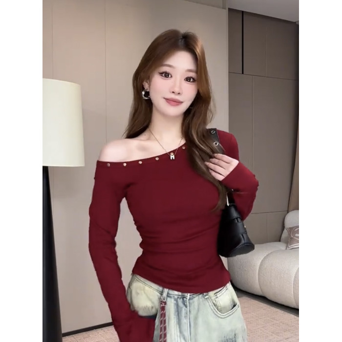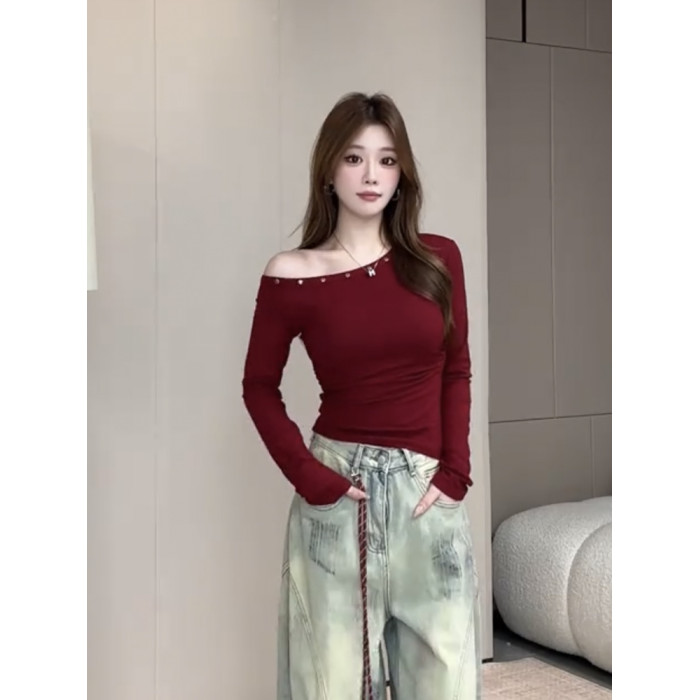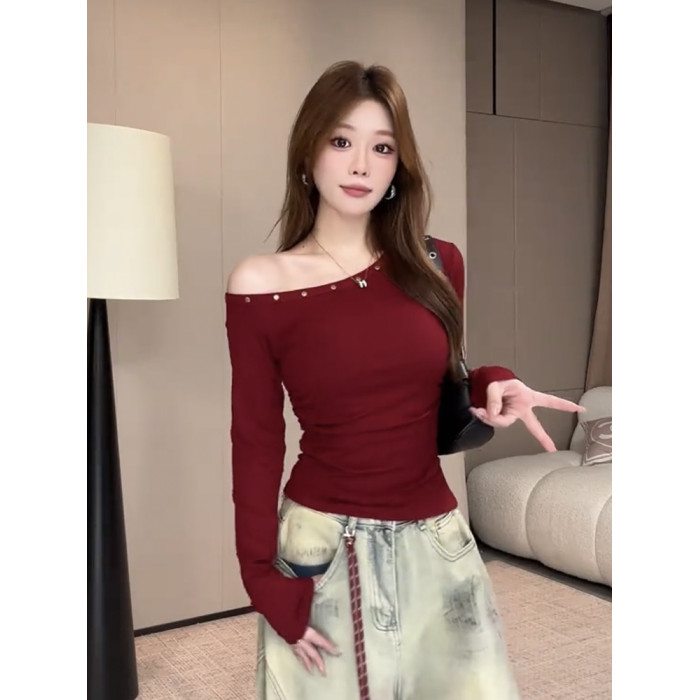 辣妹鉚釘斜肩長袖t恤女2025秋季新款露肩修身顯瘦短款打底衫上衣