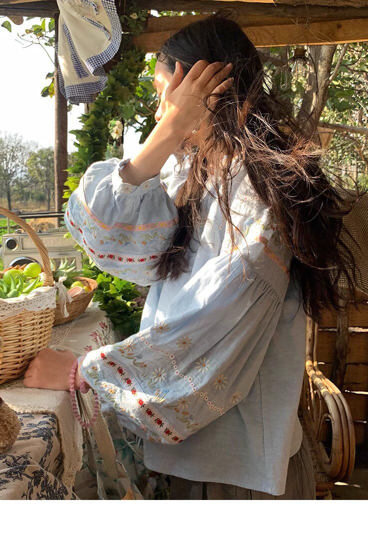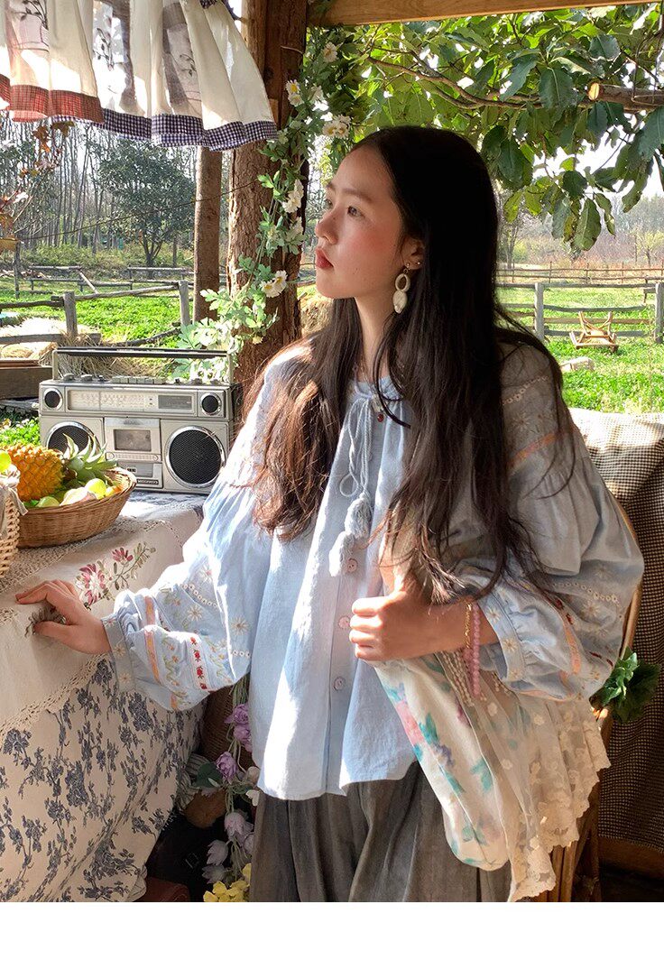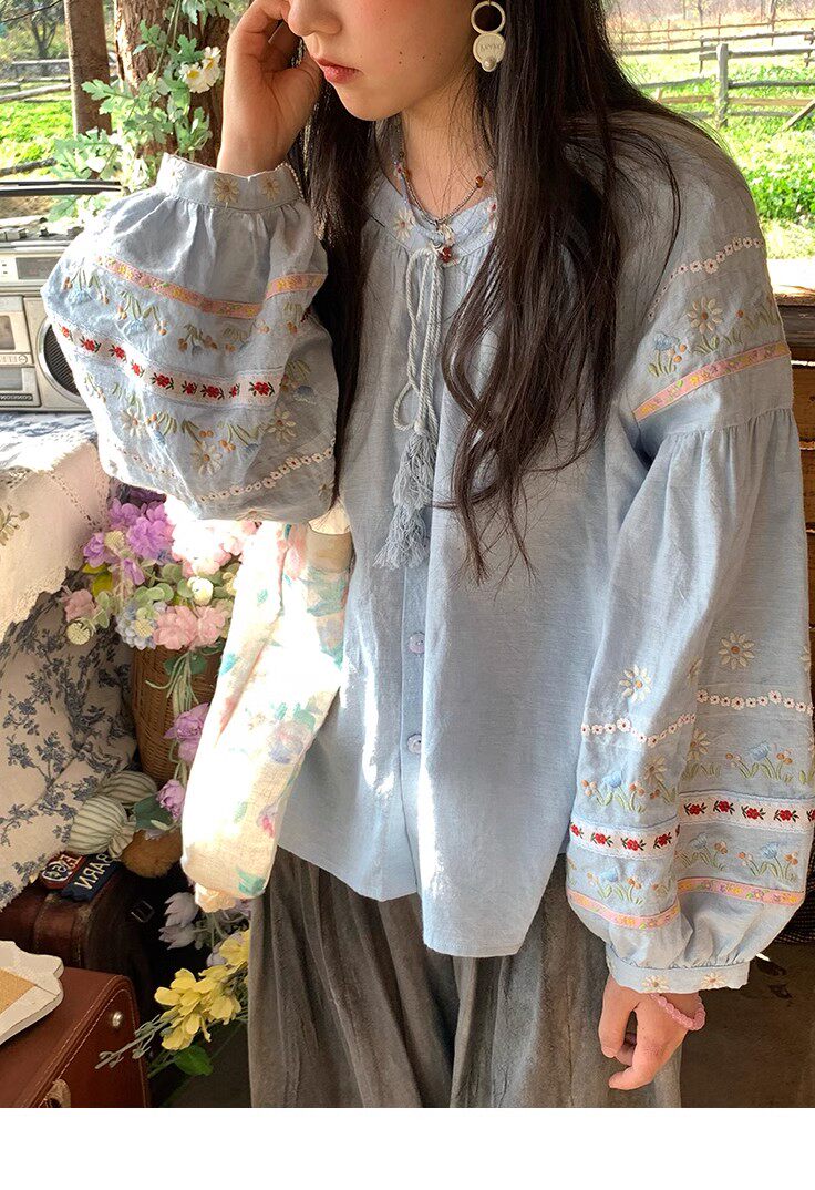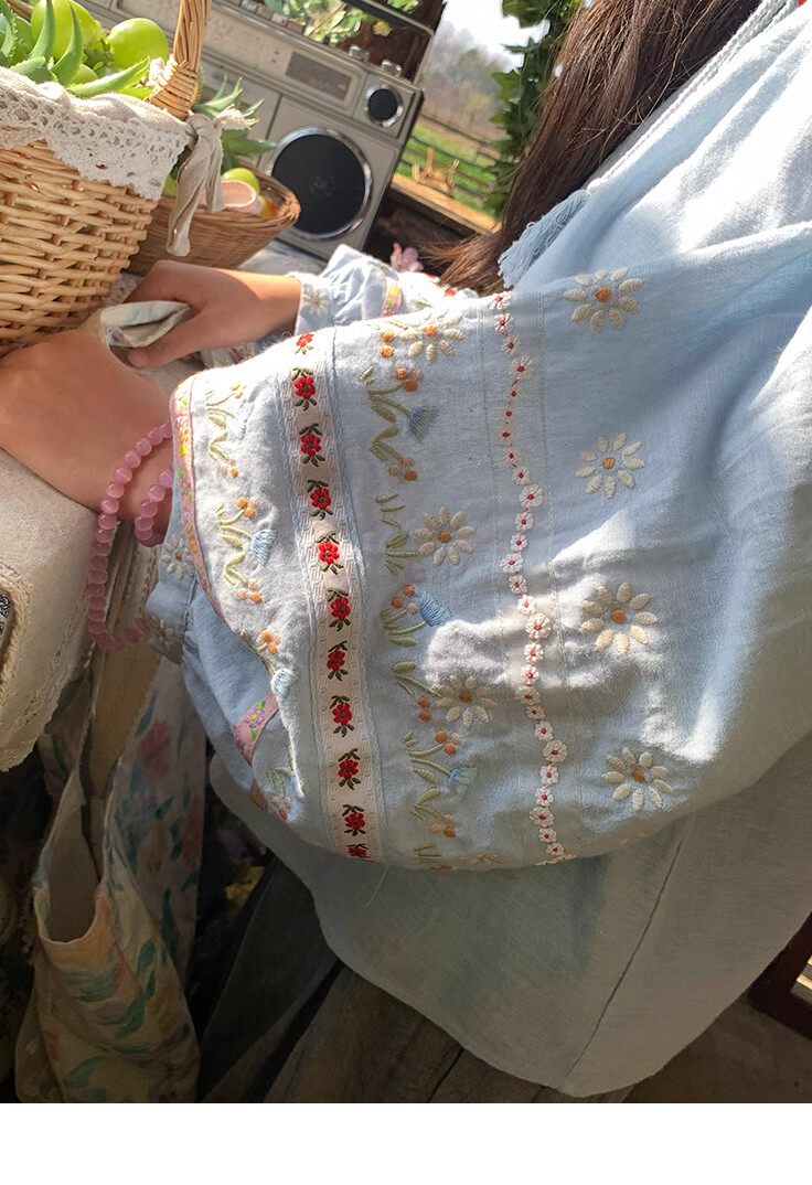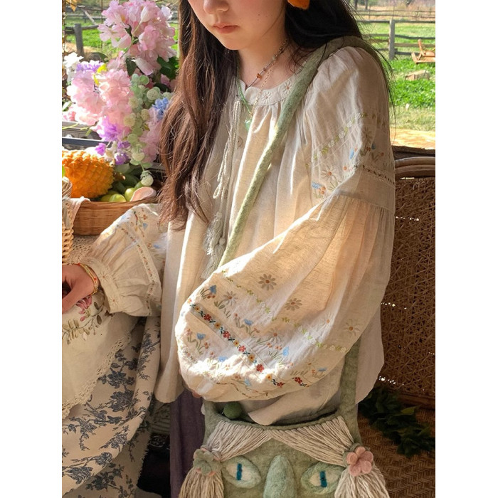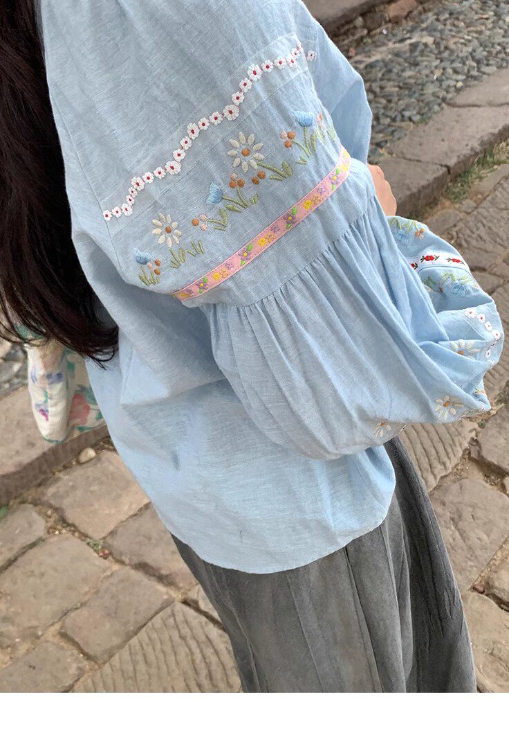森系刺綉亞麻襯衫女長袖燈籠袖甜美少女娃娃衫薄款夏季防曬上衣