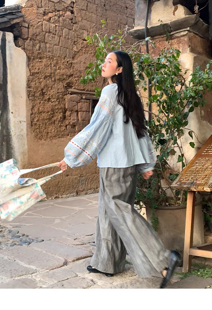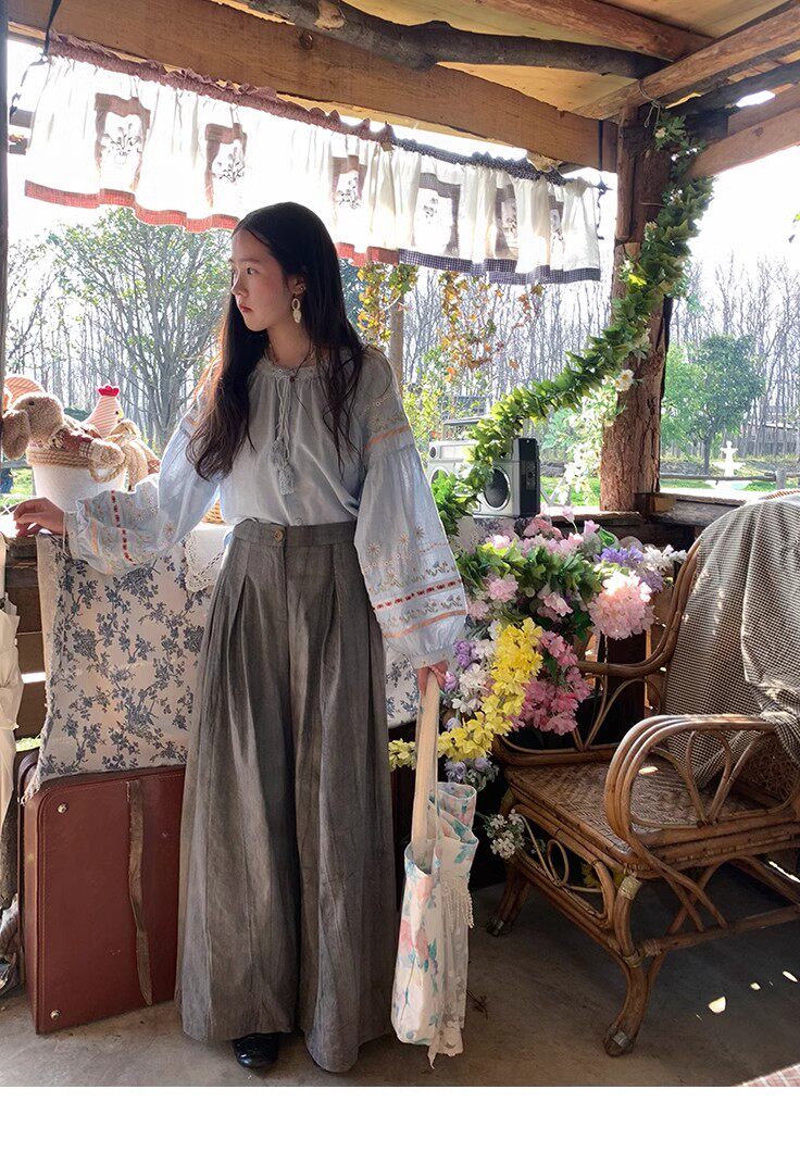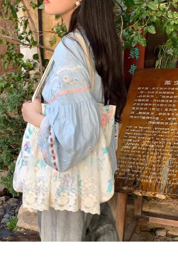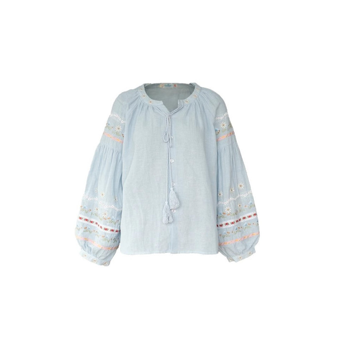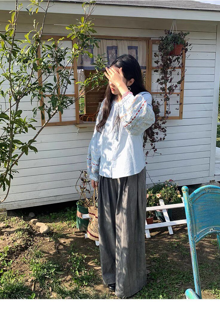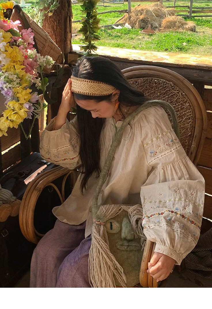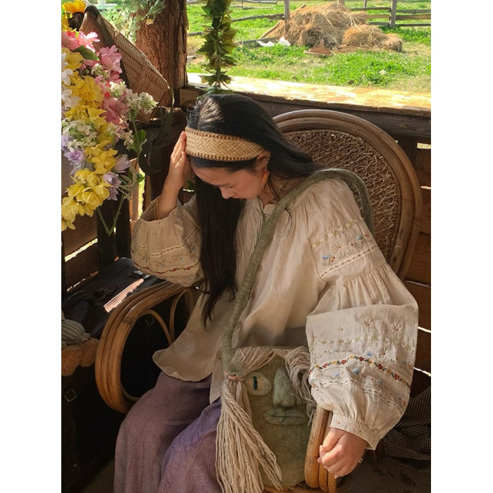 森系刺綉亞麻襯衫女長袖燈籠袖甜美少女娃娃衫薄款夏季防曬上衣