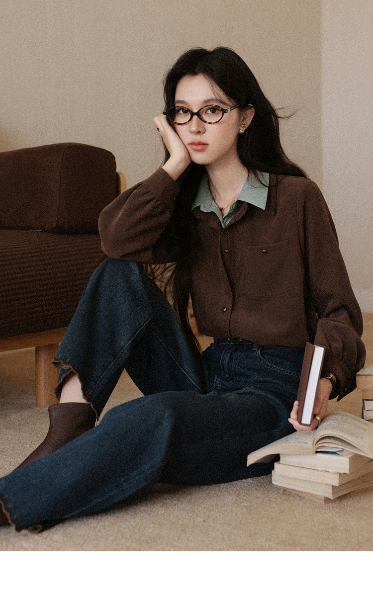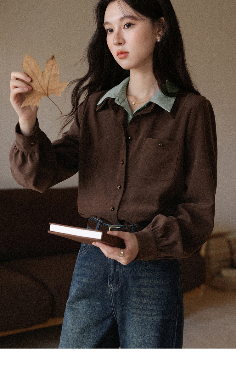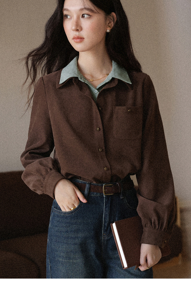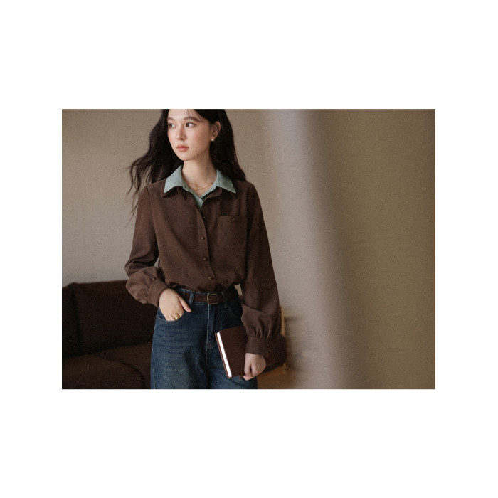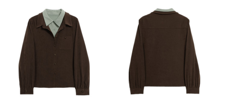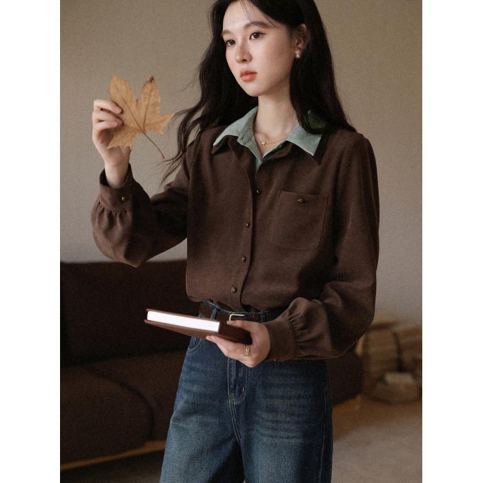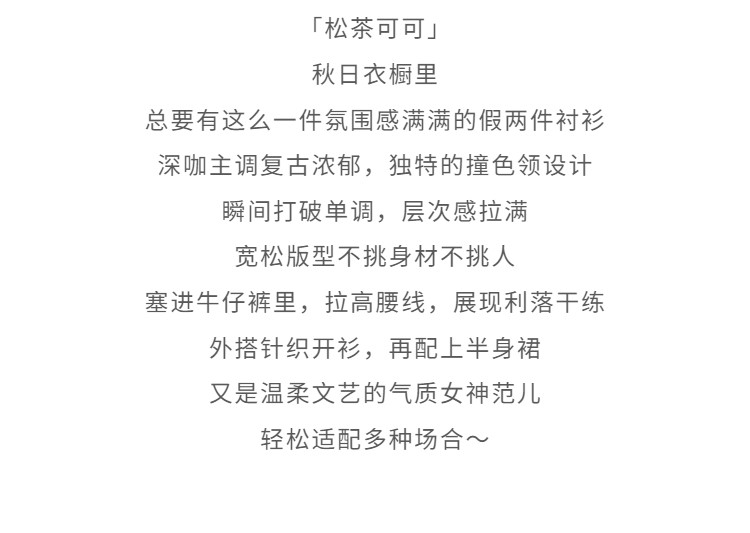 鹿向南「松茶可可」假兩件美拉德襯衫女秋冬氣質上衣通勤法式襯衣