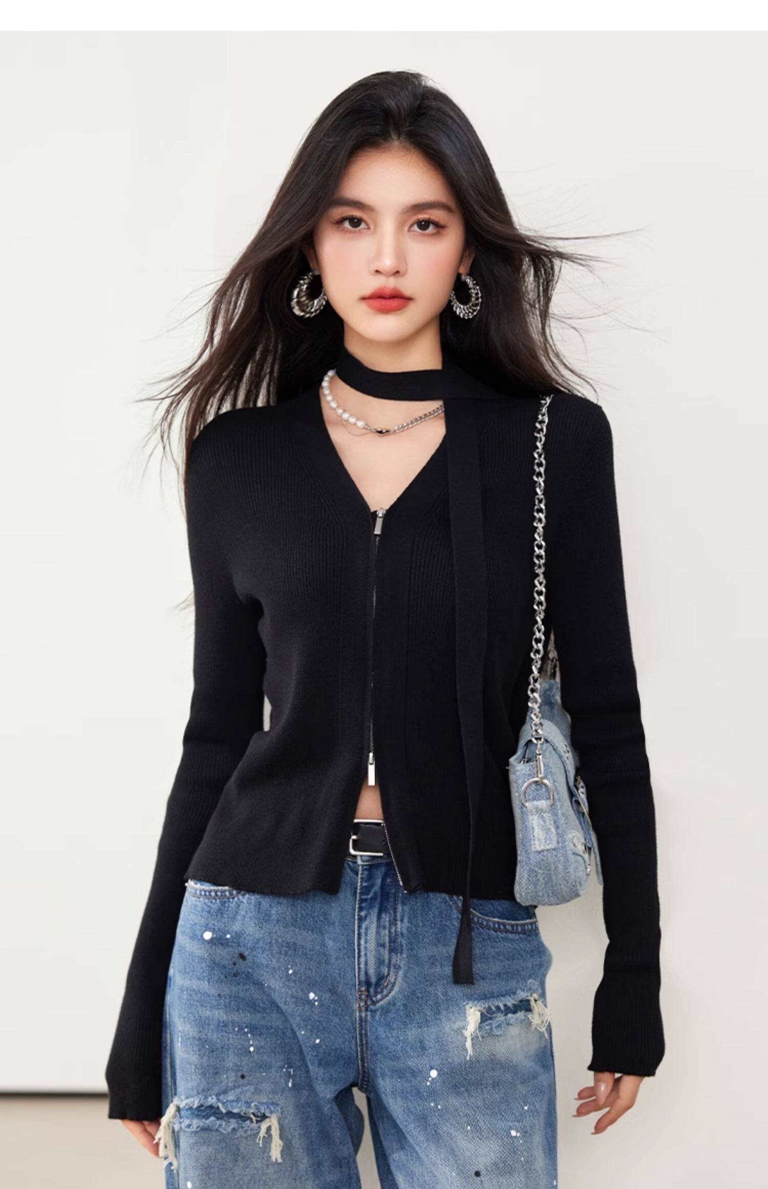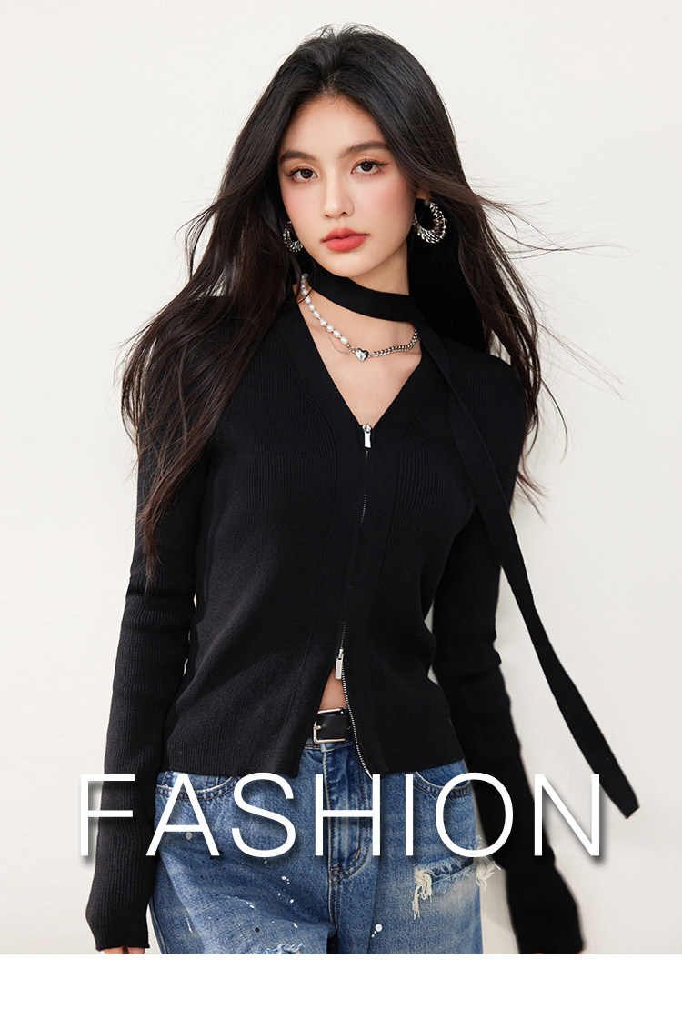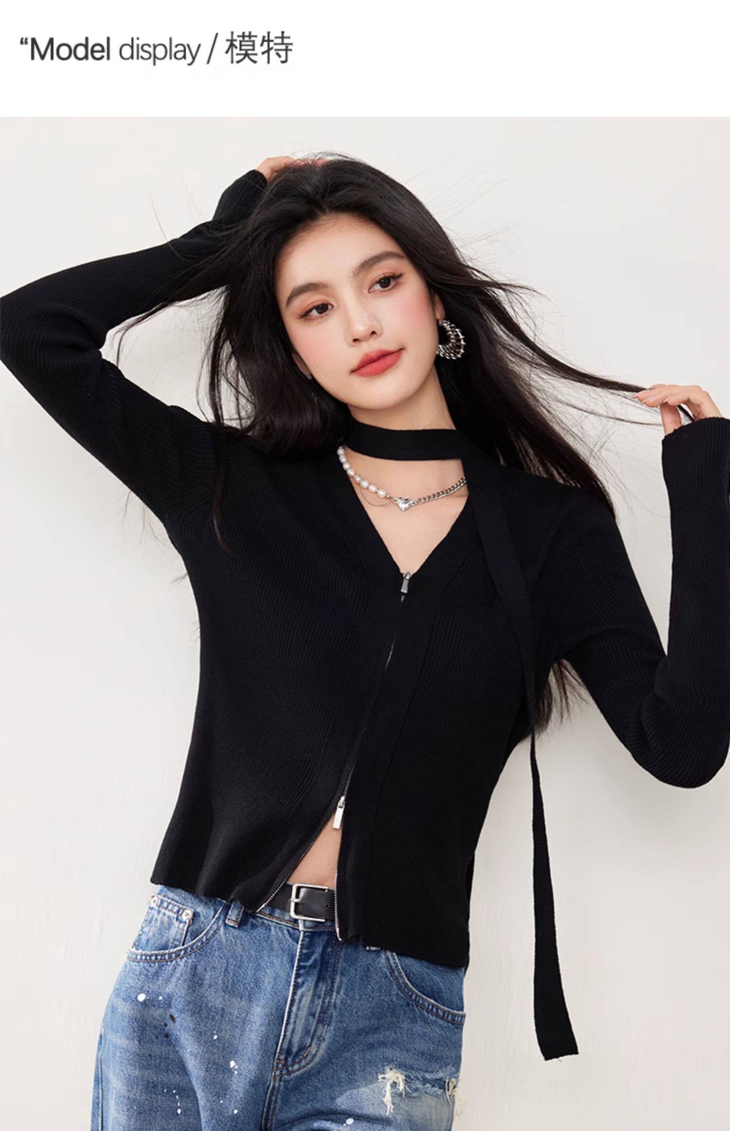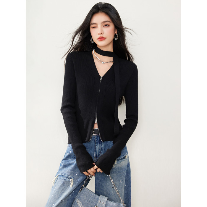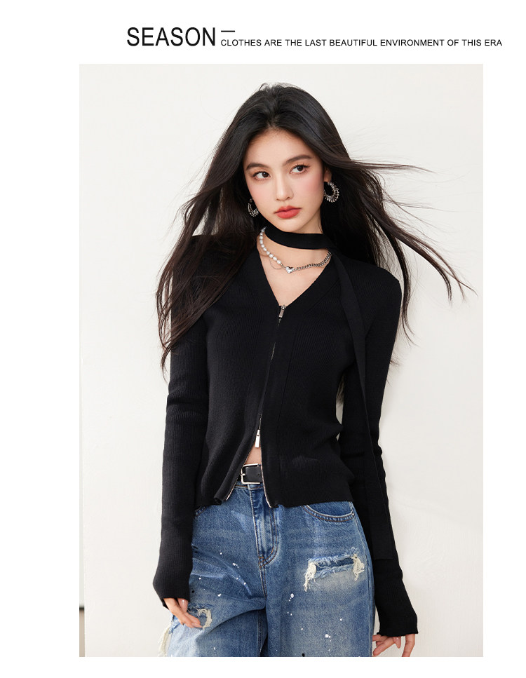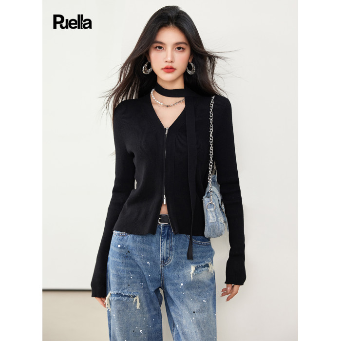 拉夏貝爾Puella2025年冬季設計感雙開拉鍊v領飄帶領巾洋氣上衣女