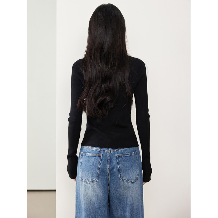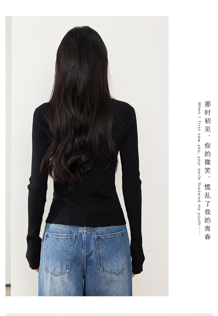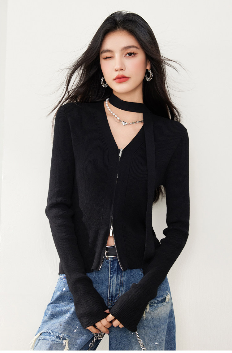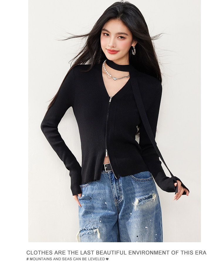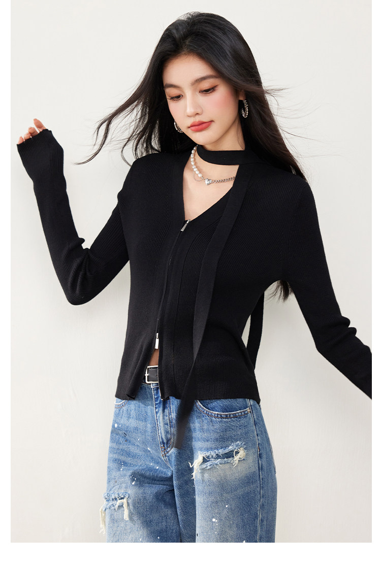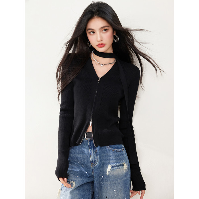 拉夏貝爾Puella2025年冬季設計感雙開拉鍊v領飄帶領巾洋氣上衣女
