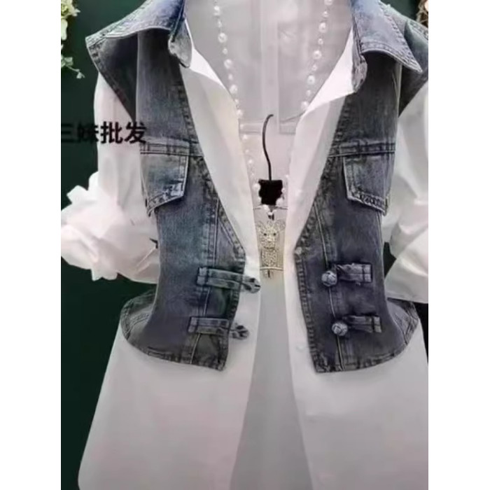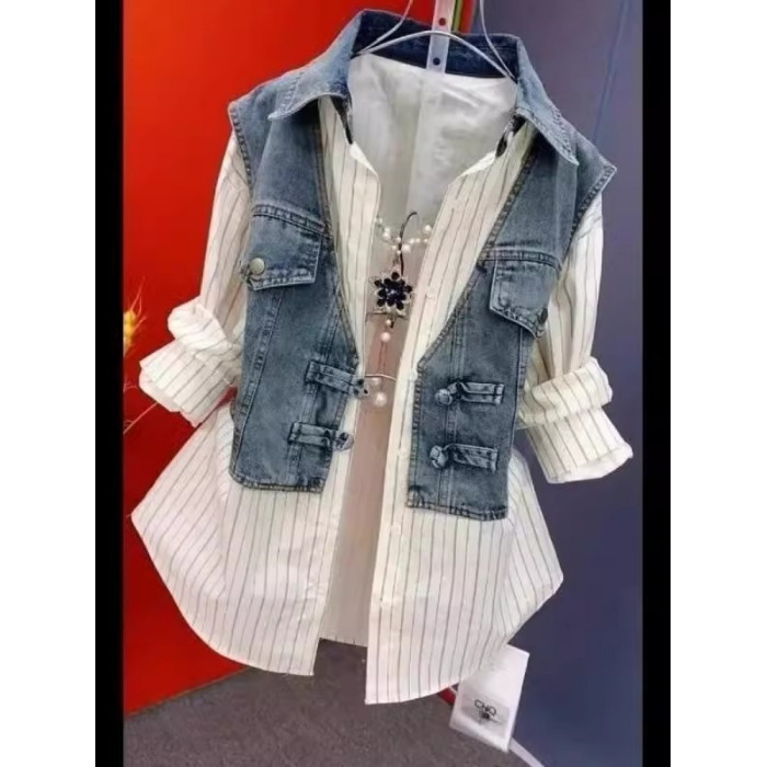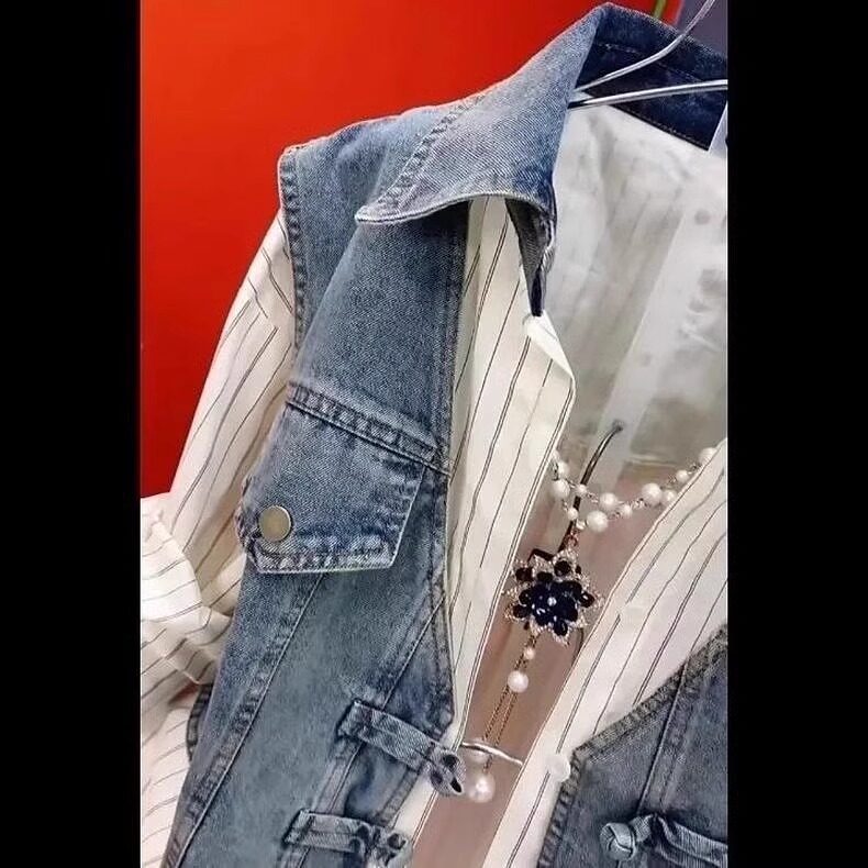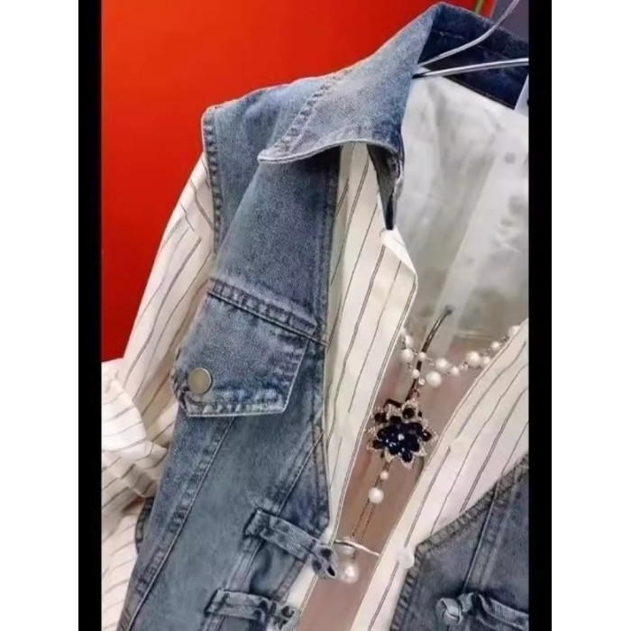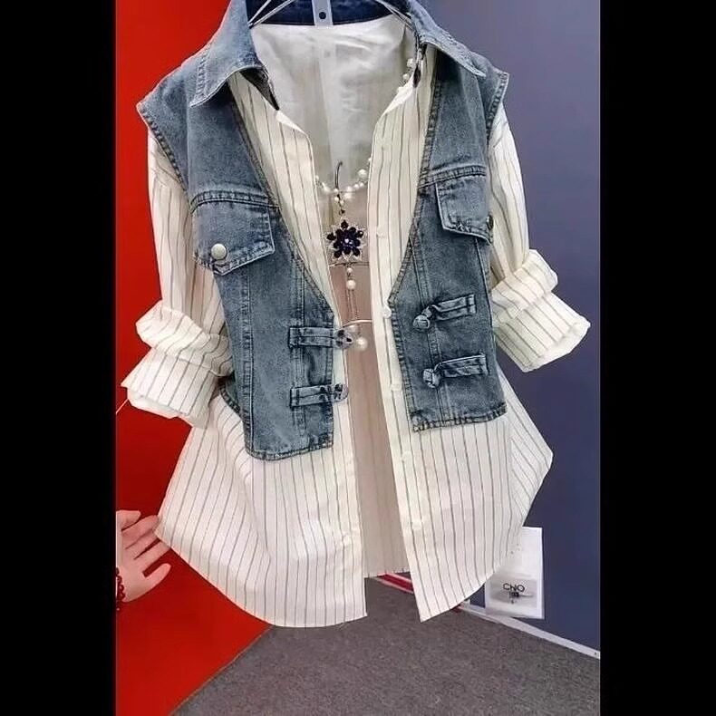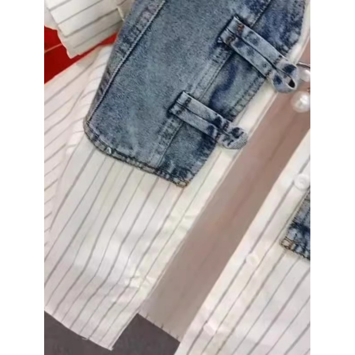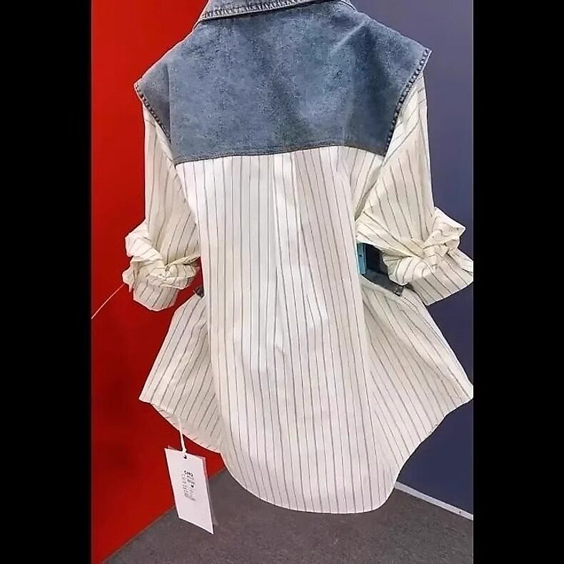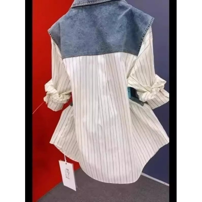 設計感假兩件牛仔襯衫女款2026春秋韓版休閒洋氣百搭拼接條紋上衣