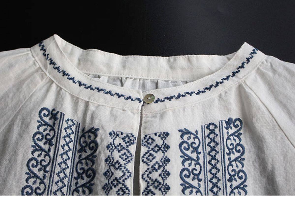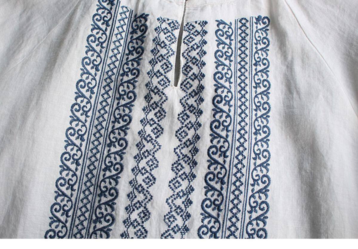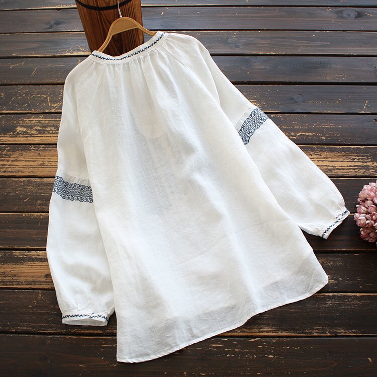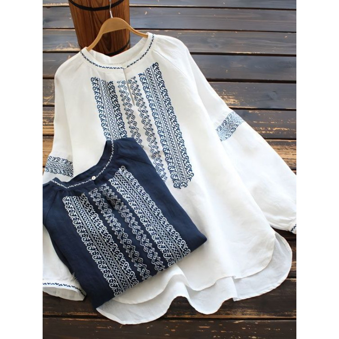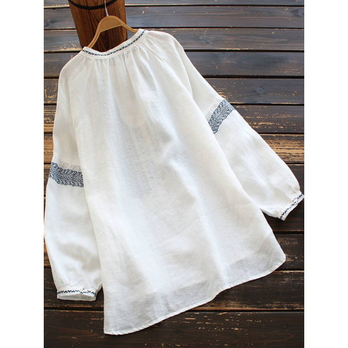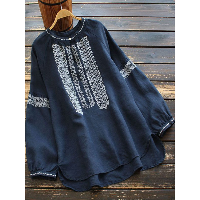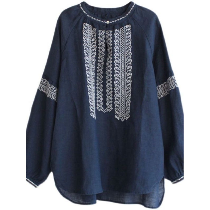 大碼女裝寬鬆民族風刺綉圓領t恤2025春秋季套頭簡約長袖襯衫上衣