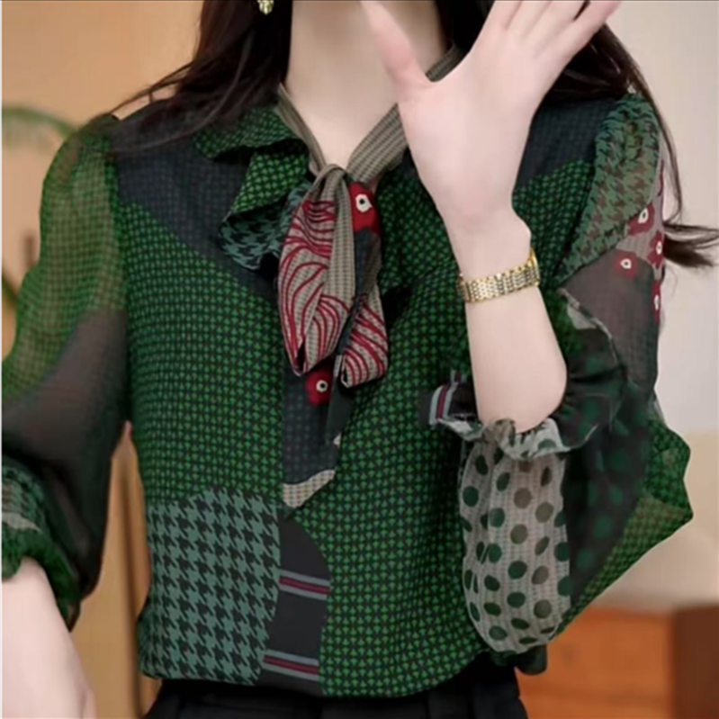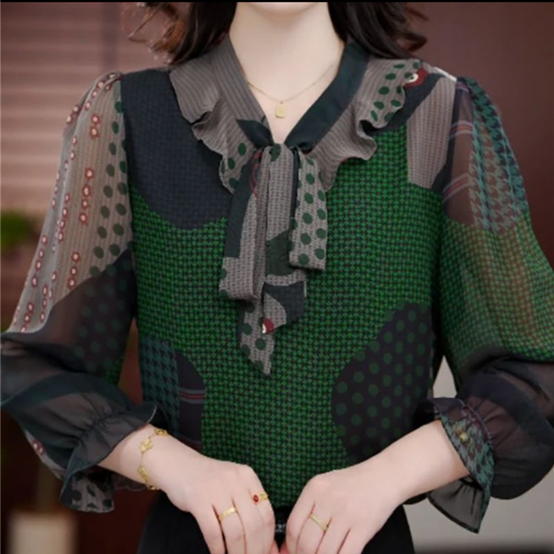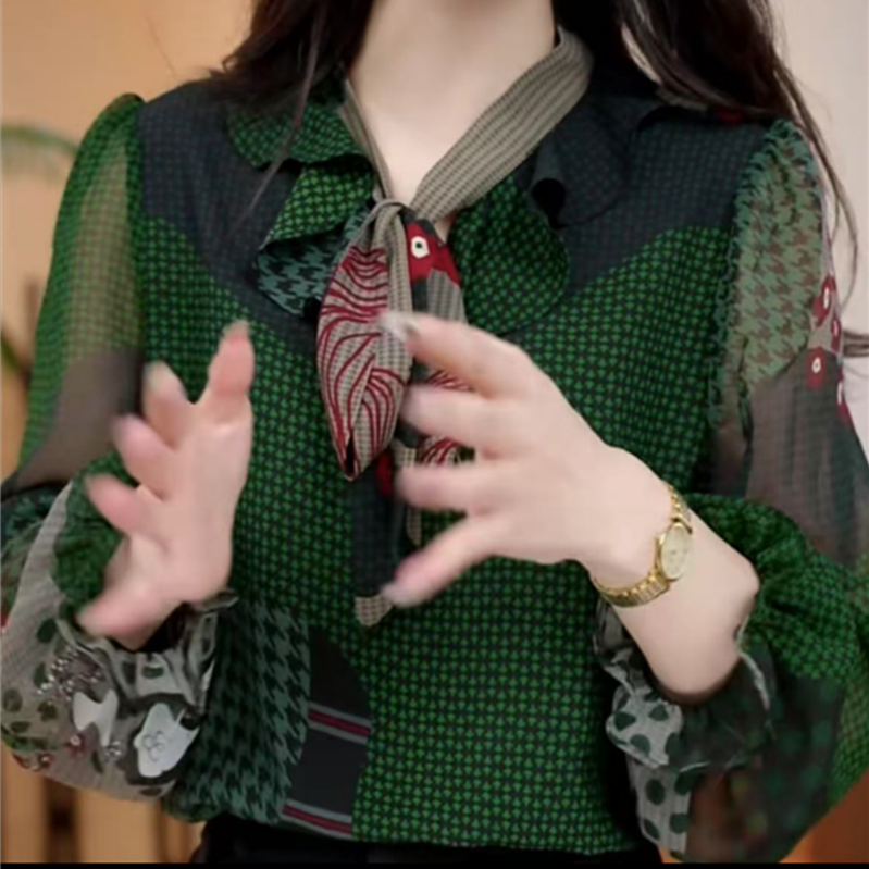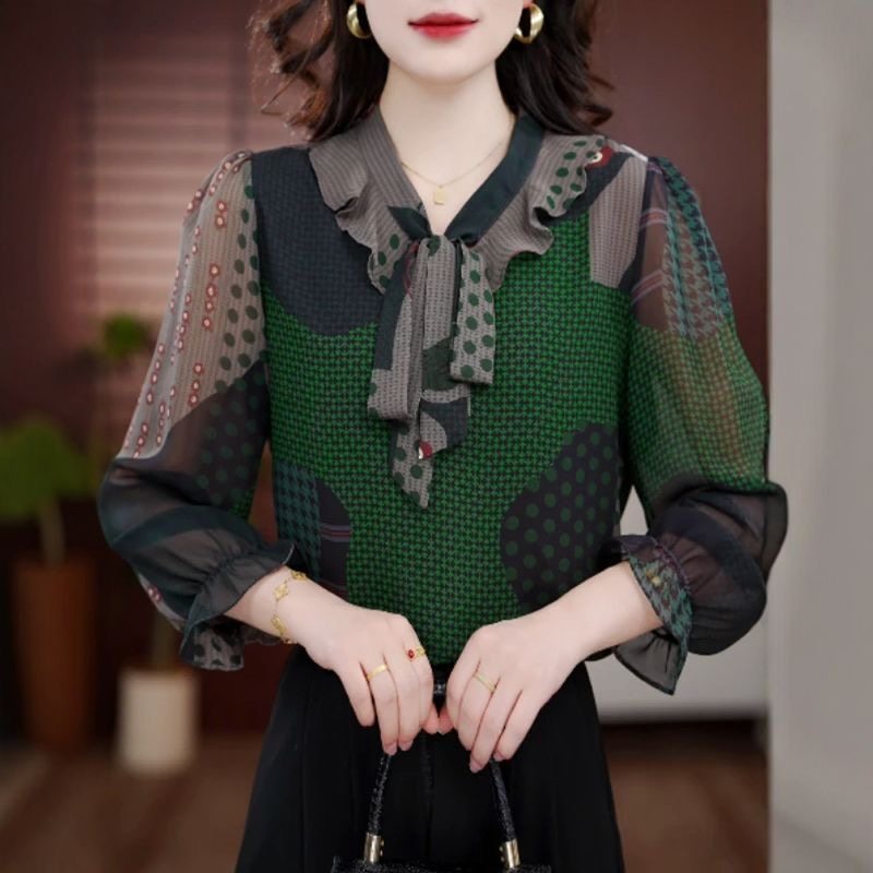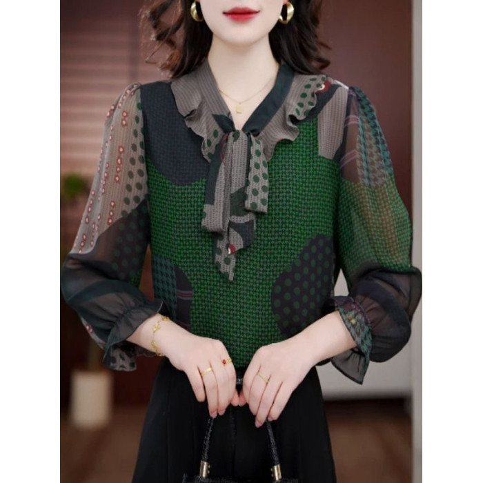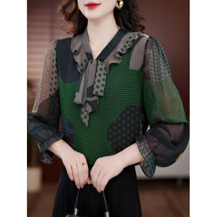 2025春季新款氣質V領飄帶撞色上衣氣質百搭寬鬆中年女裝套頭襯衣