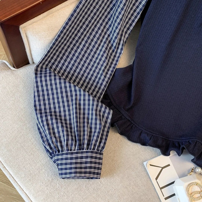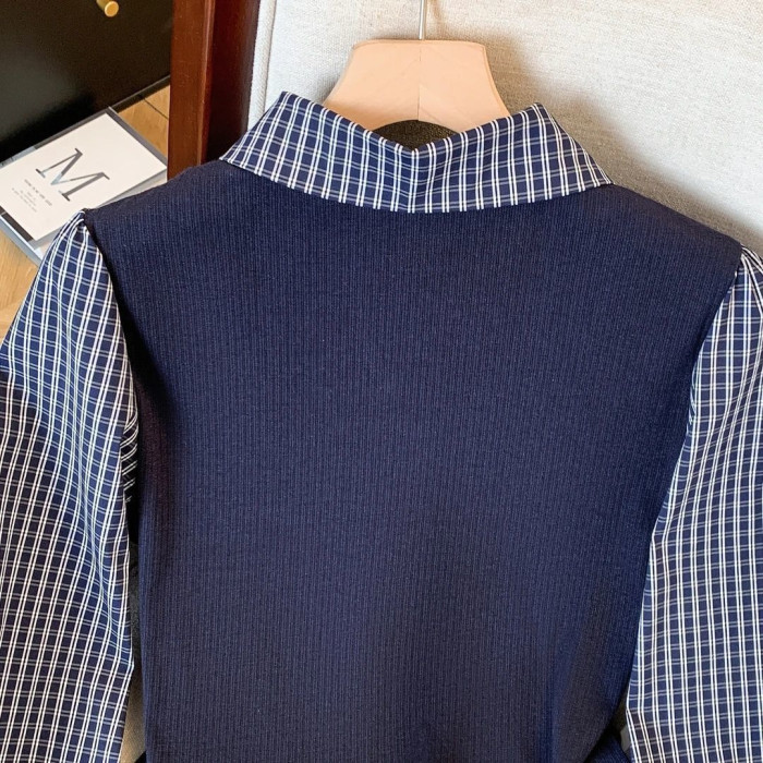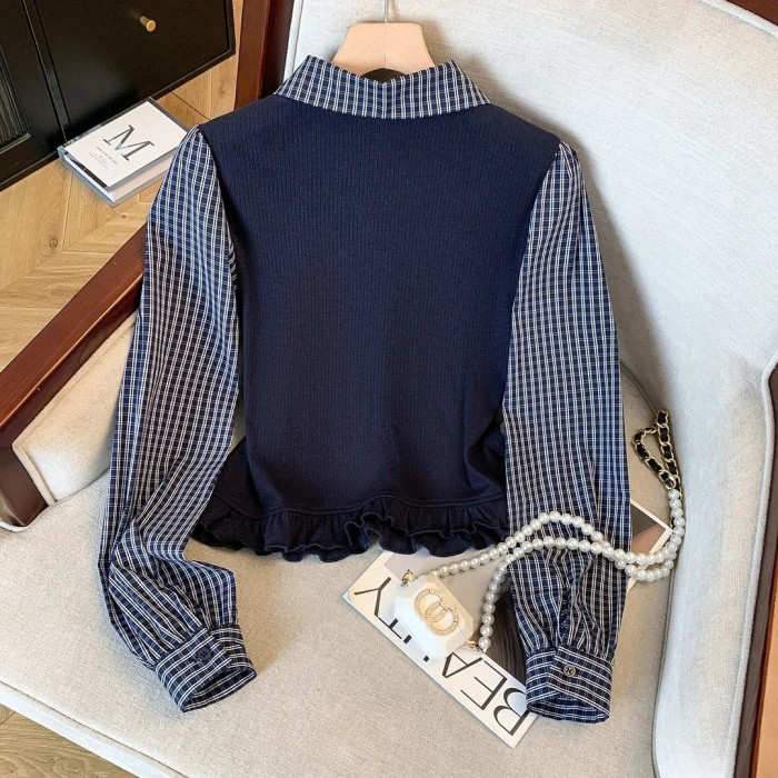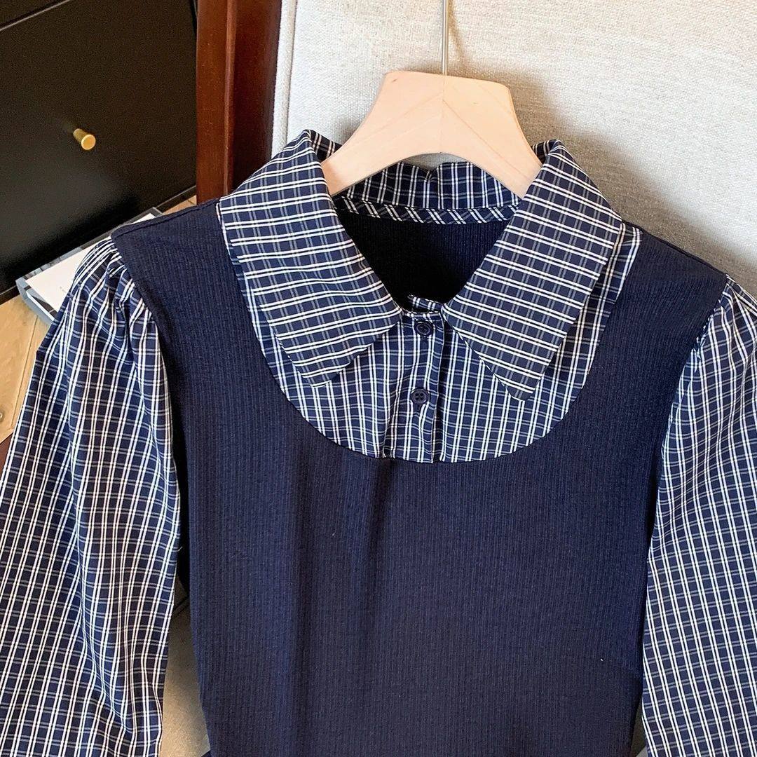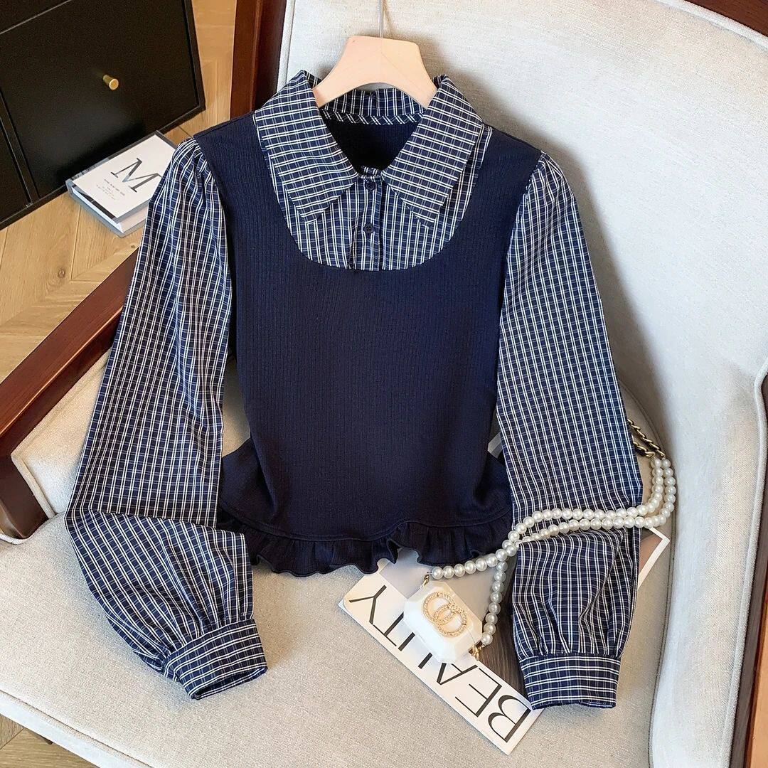 polo領假兩件溫柔風格子襯衫女2025新款早秋長袖打底衫T恤上衣