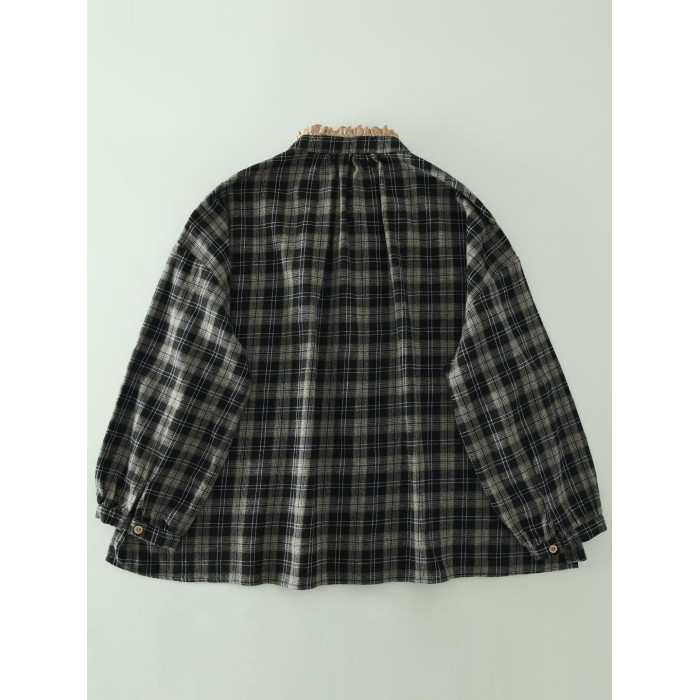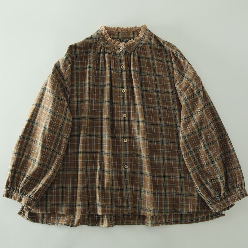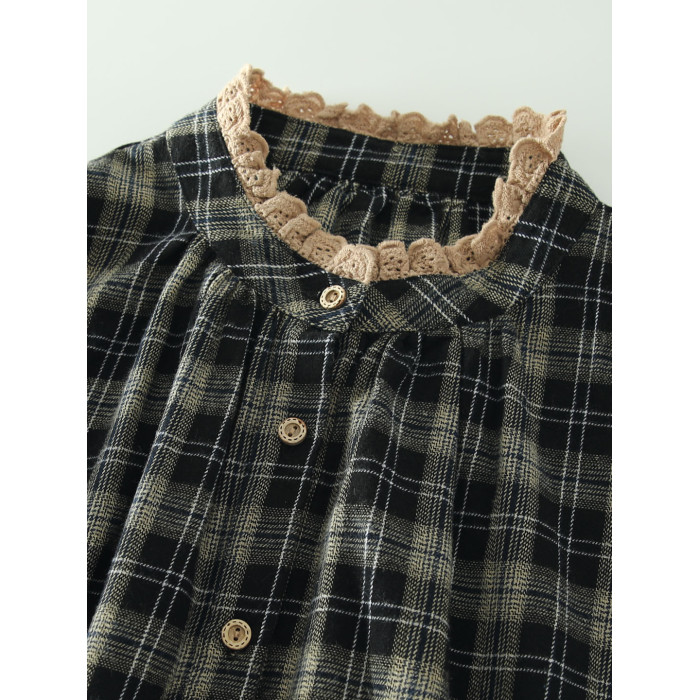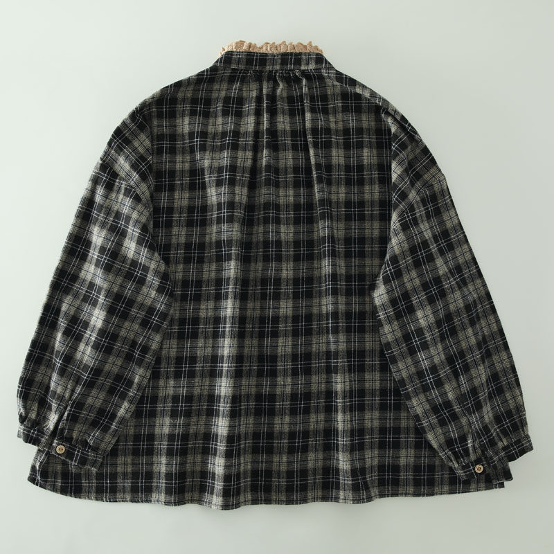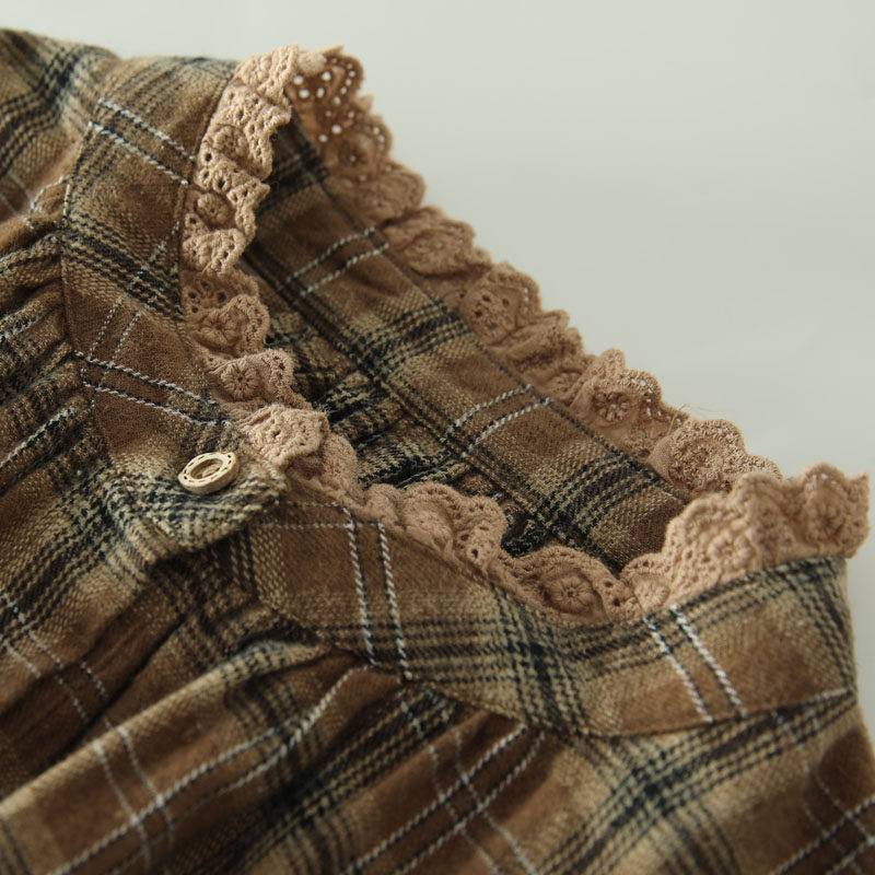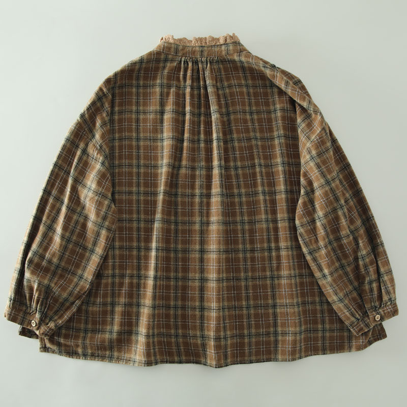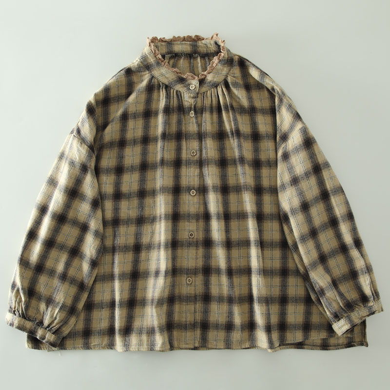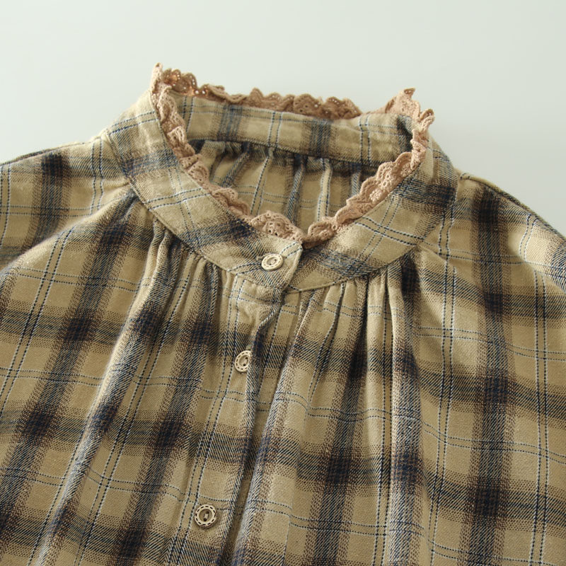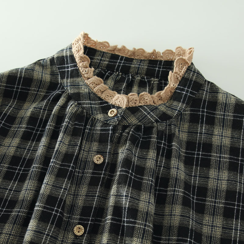 秋新款甜美森女蕾絲花邊立領斜紋磨毛棉格子襯衫寬鬆大碼百搭上衣