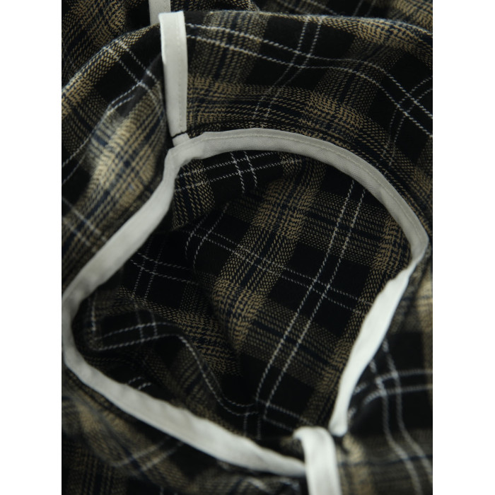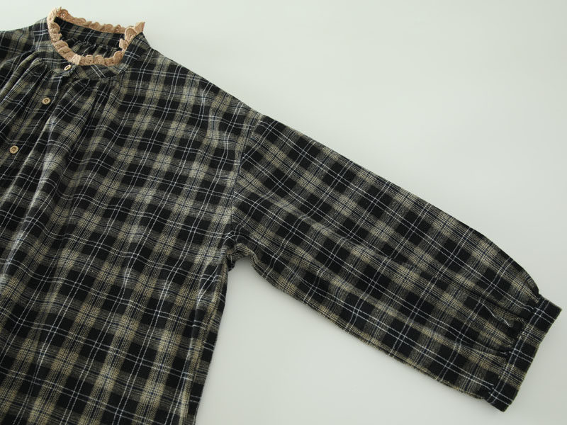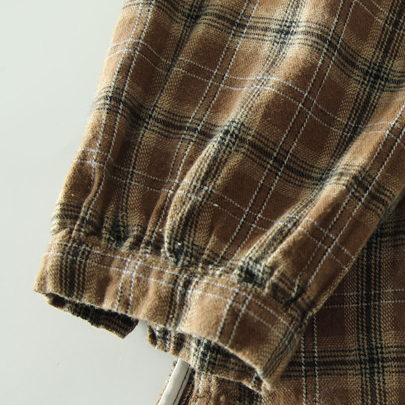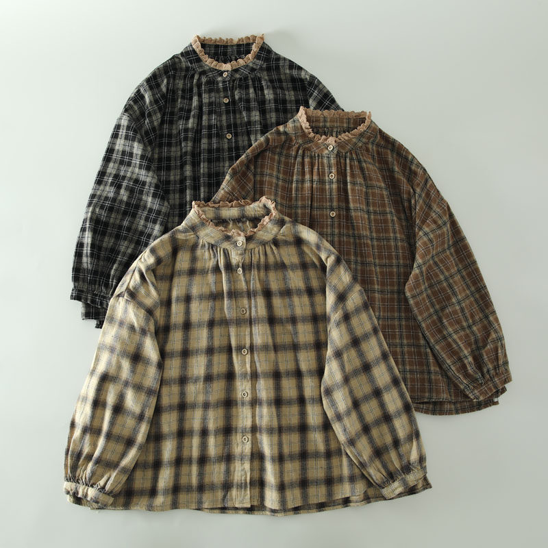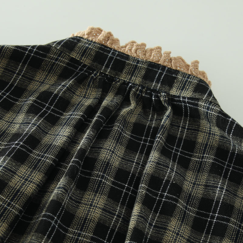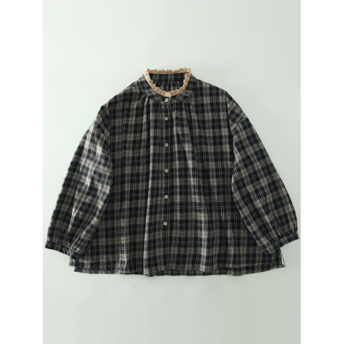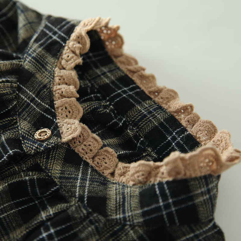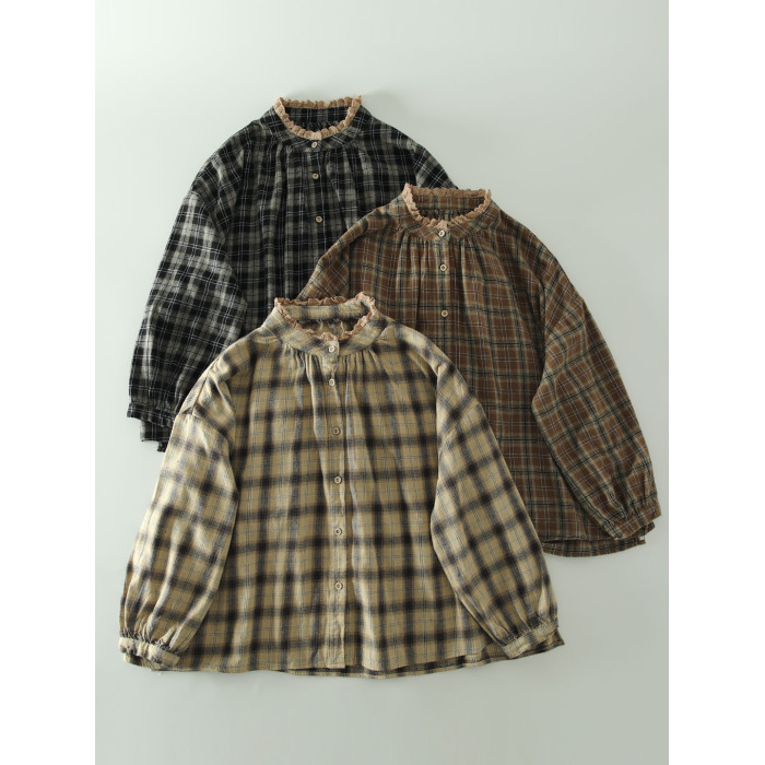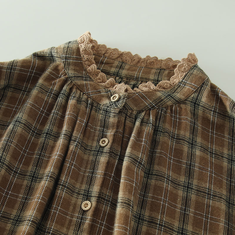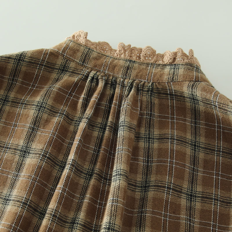 秋新款甜美森女蕾絲花邊立領斜紋磨毛棉格子襯衫寬鬆大碼百搭上衣