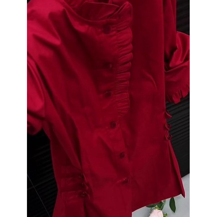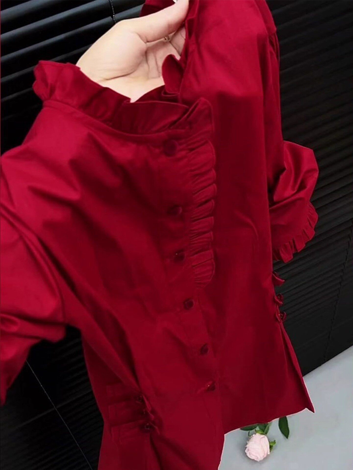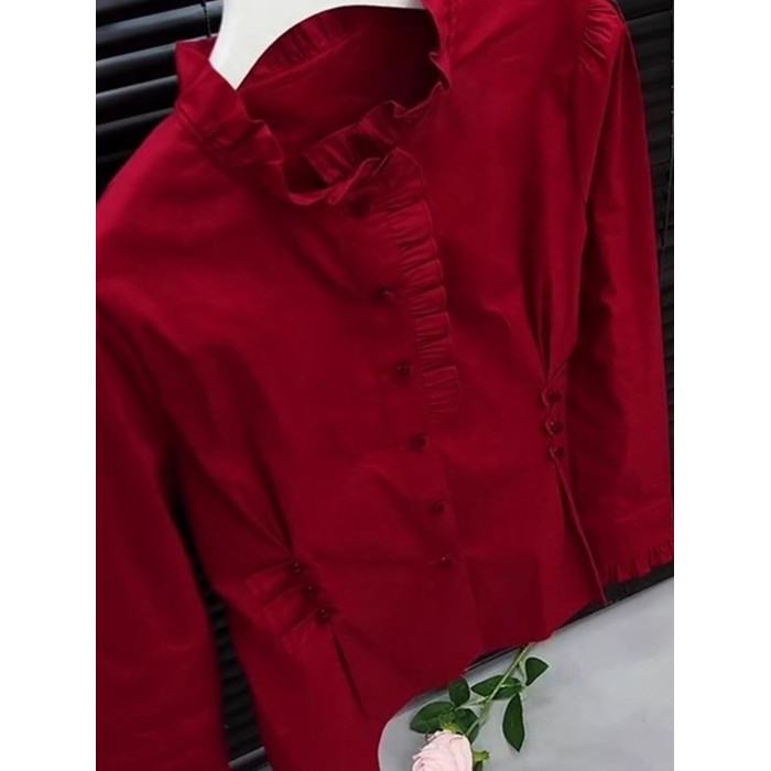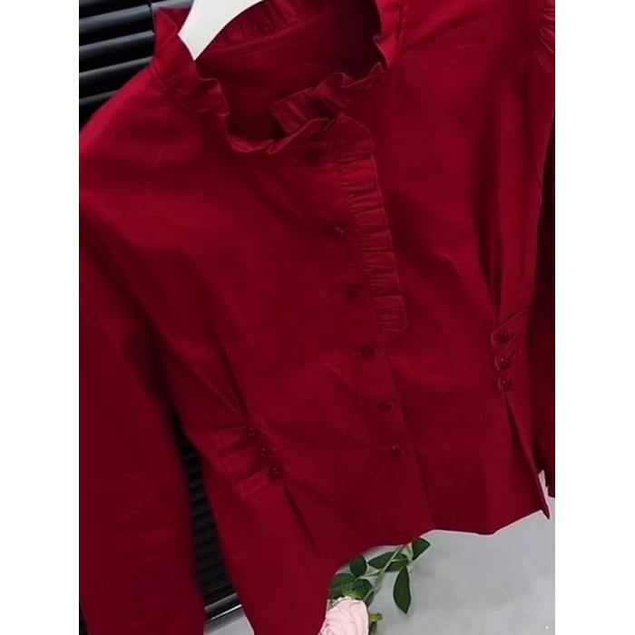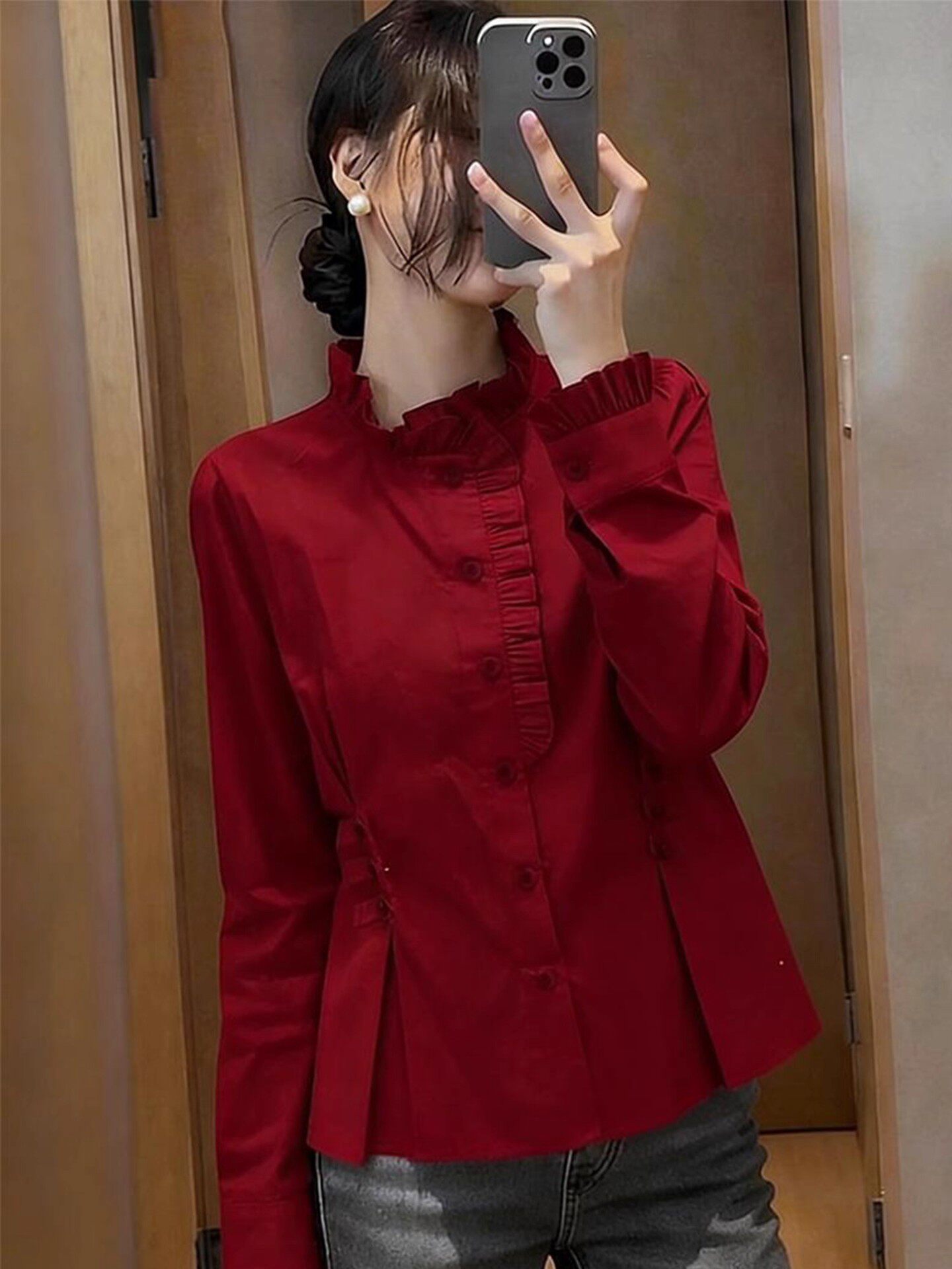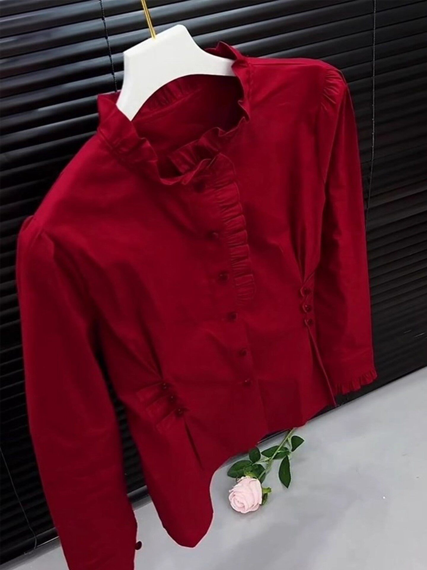 2026冬季爆款紅色襯衫女木耳邊修身顯瘦復古國風氣質百搭長袖上衣