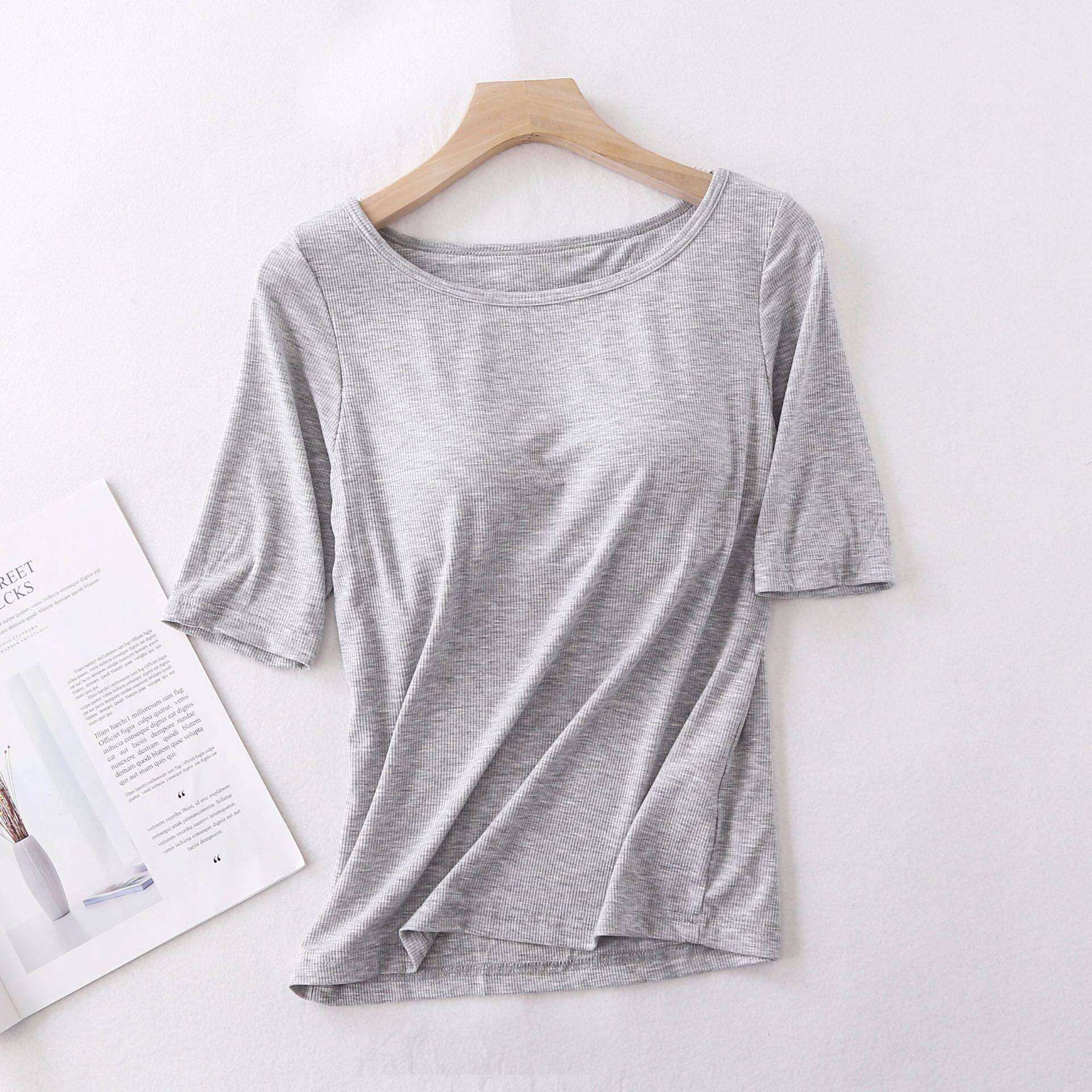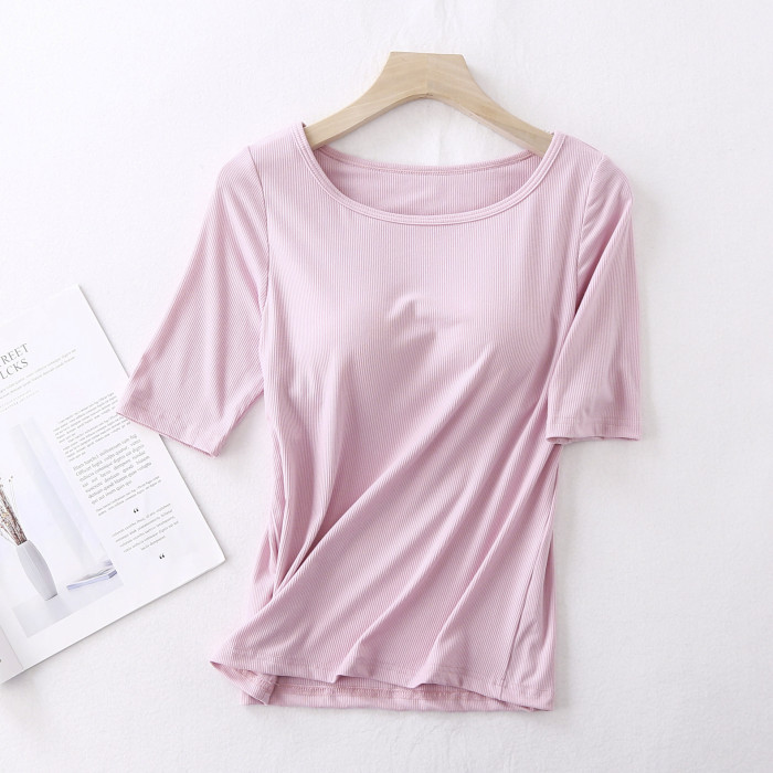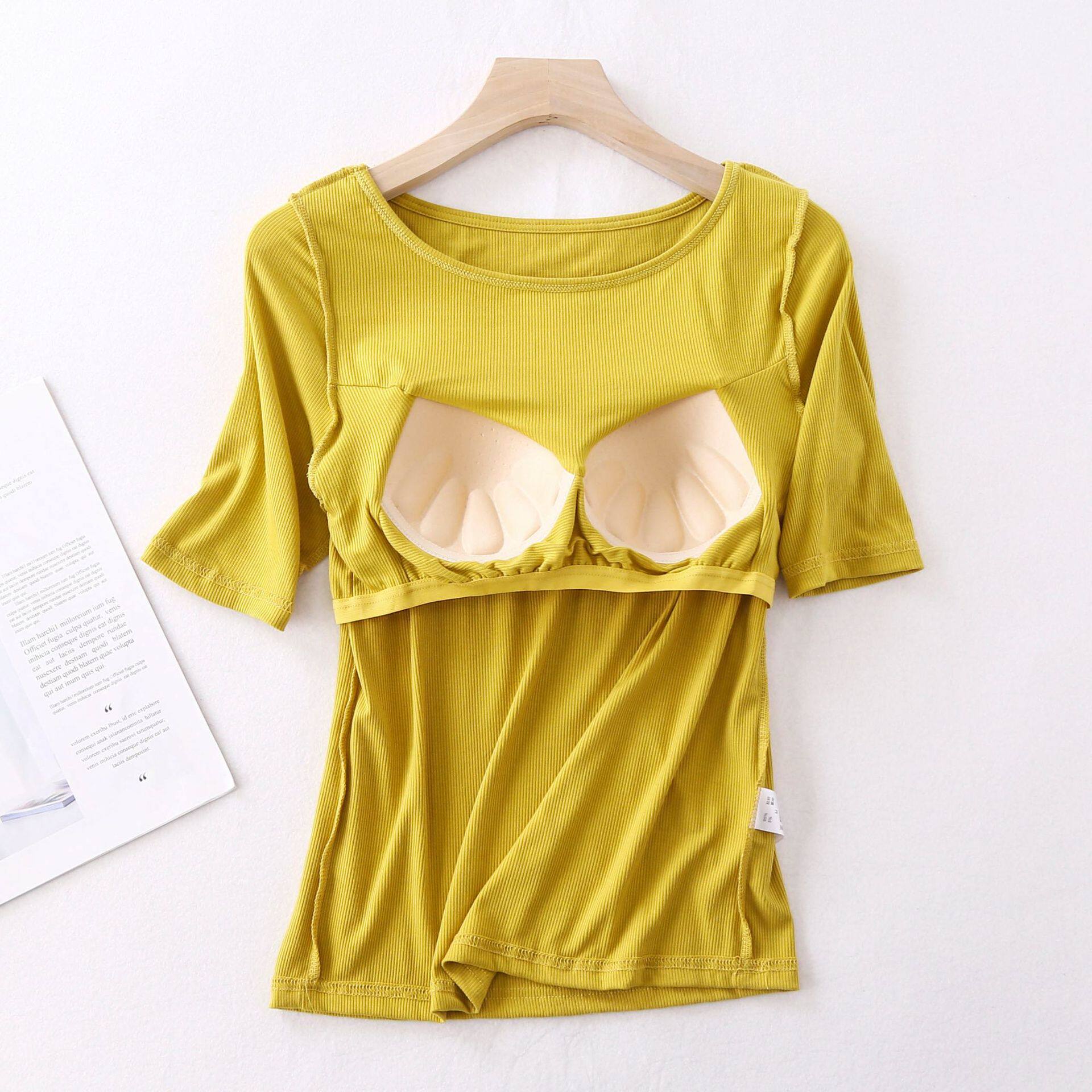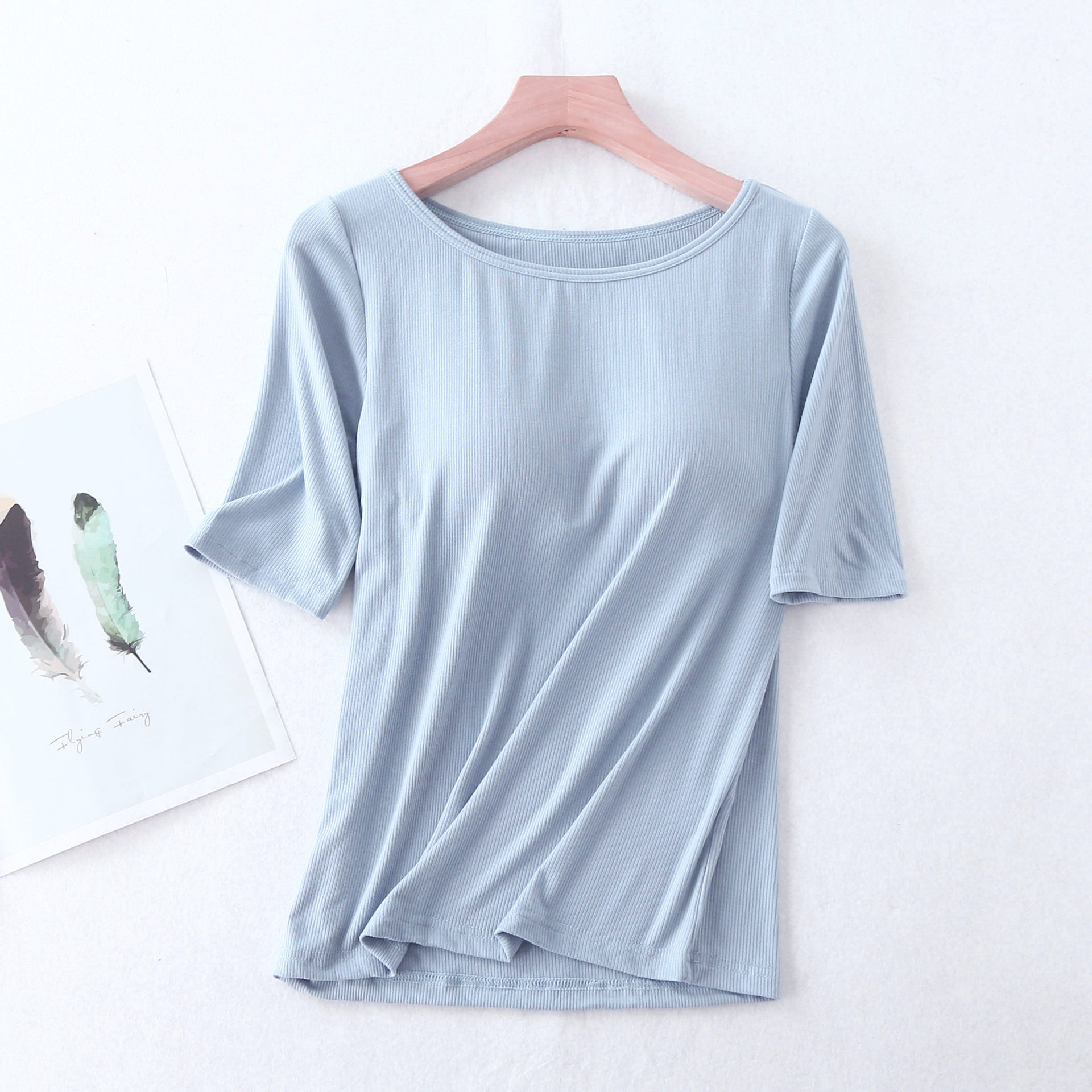 羅紋莫代爾帶胸墊五分袖T恤女夏免文胸短袖睡衣家居服可外穿上衣