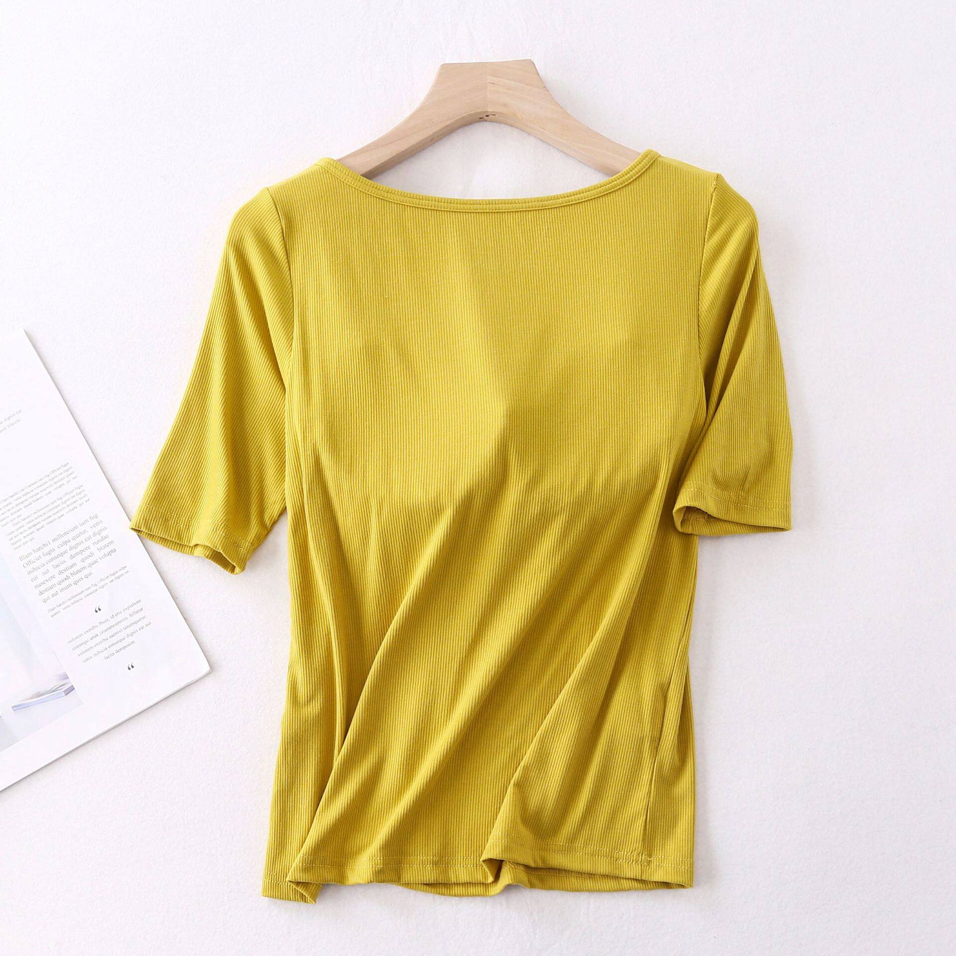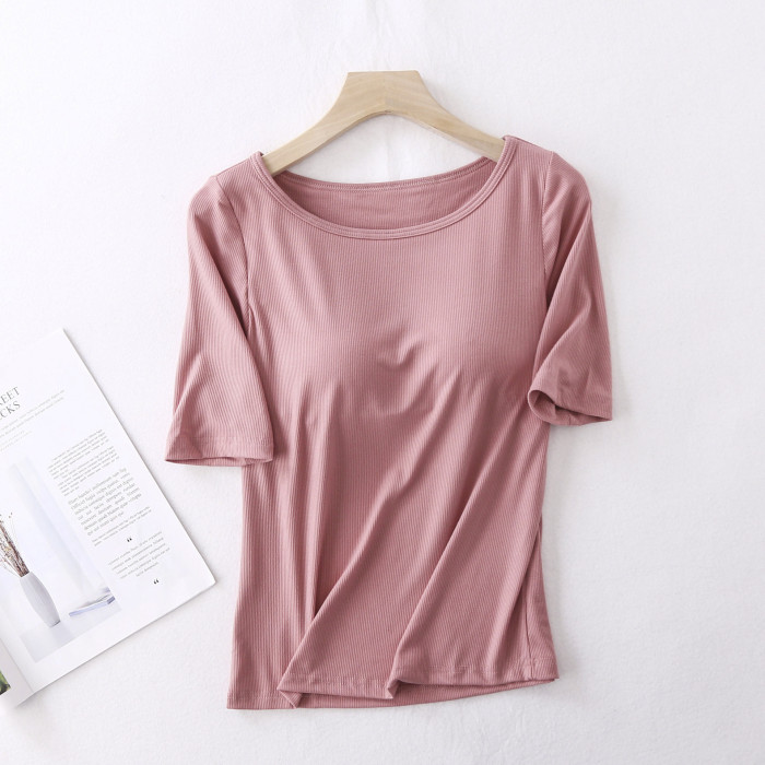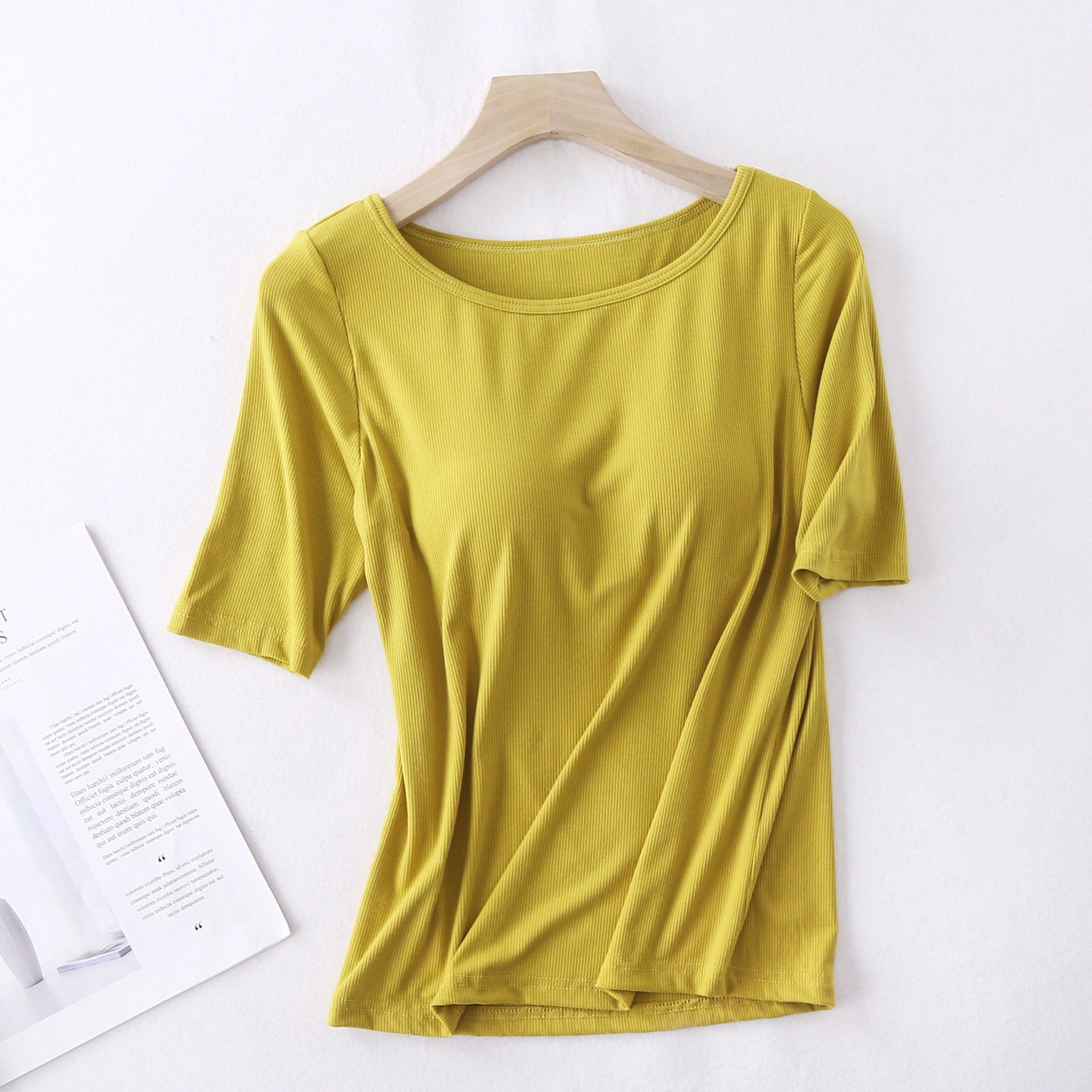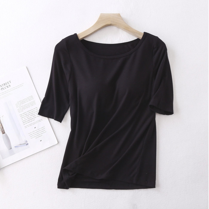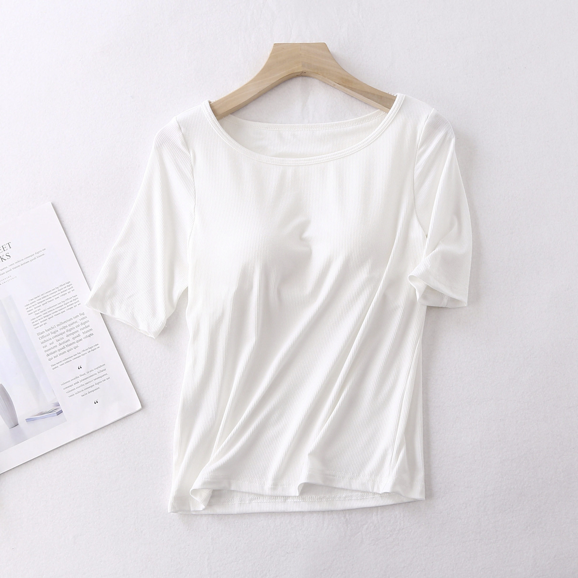 羅紋莫代爾帶胸墊五分袖T恤女夏免文胸短袖睡衣家居服可外穿上衣