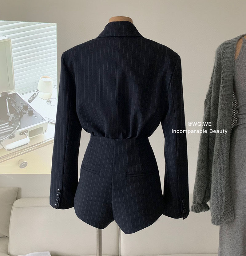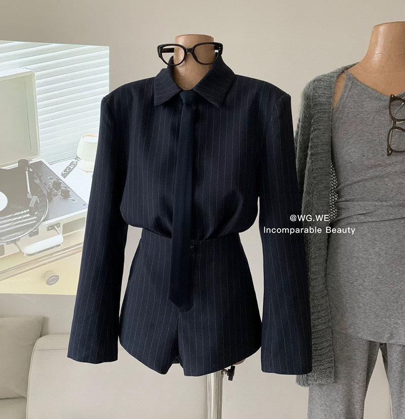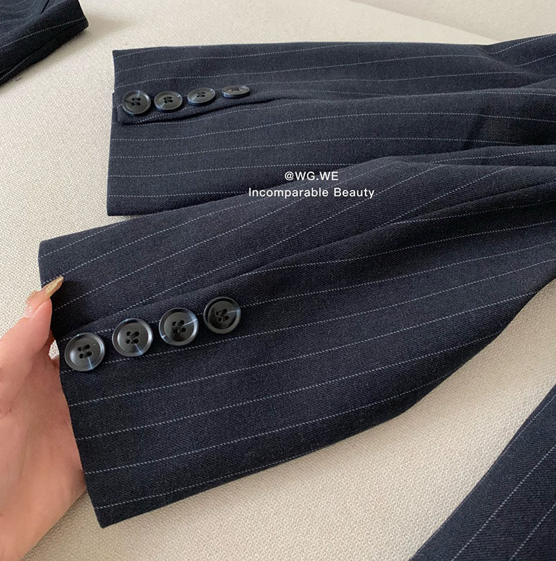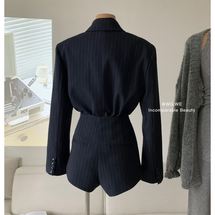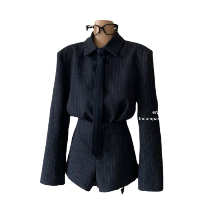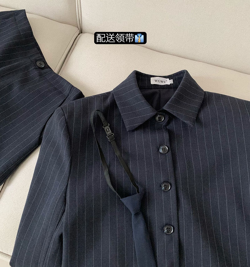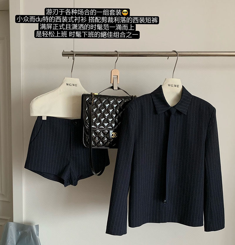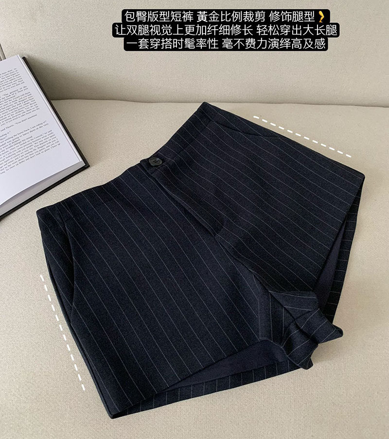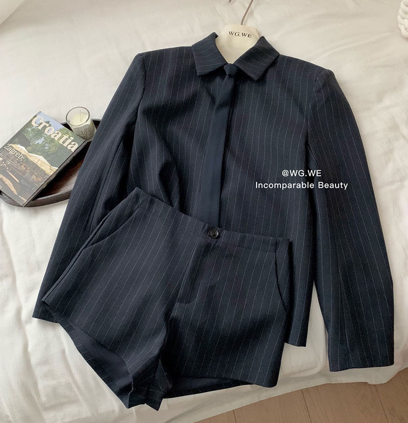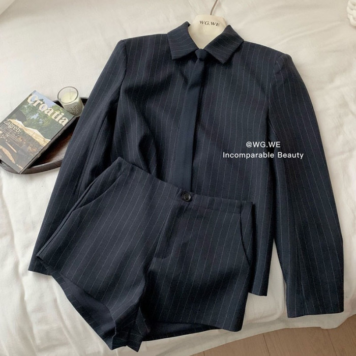 認真賣 禦姐風高級感條紋西裝襯衫女秋高腰短褲辣妹顯瘦兩件套