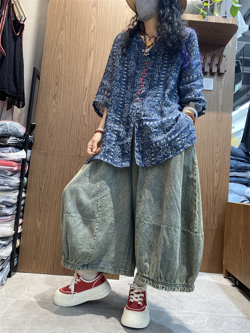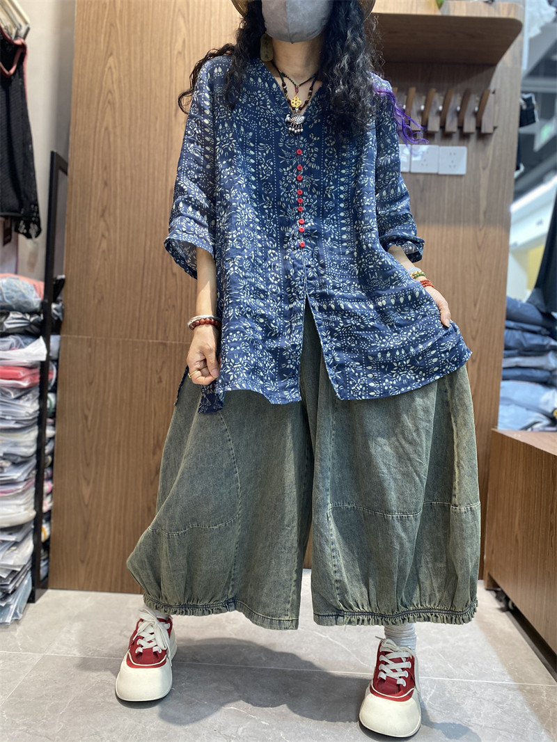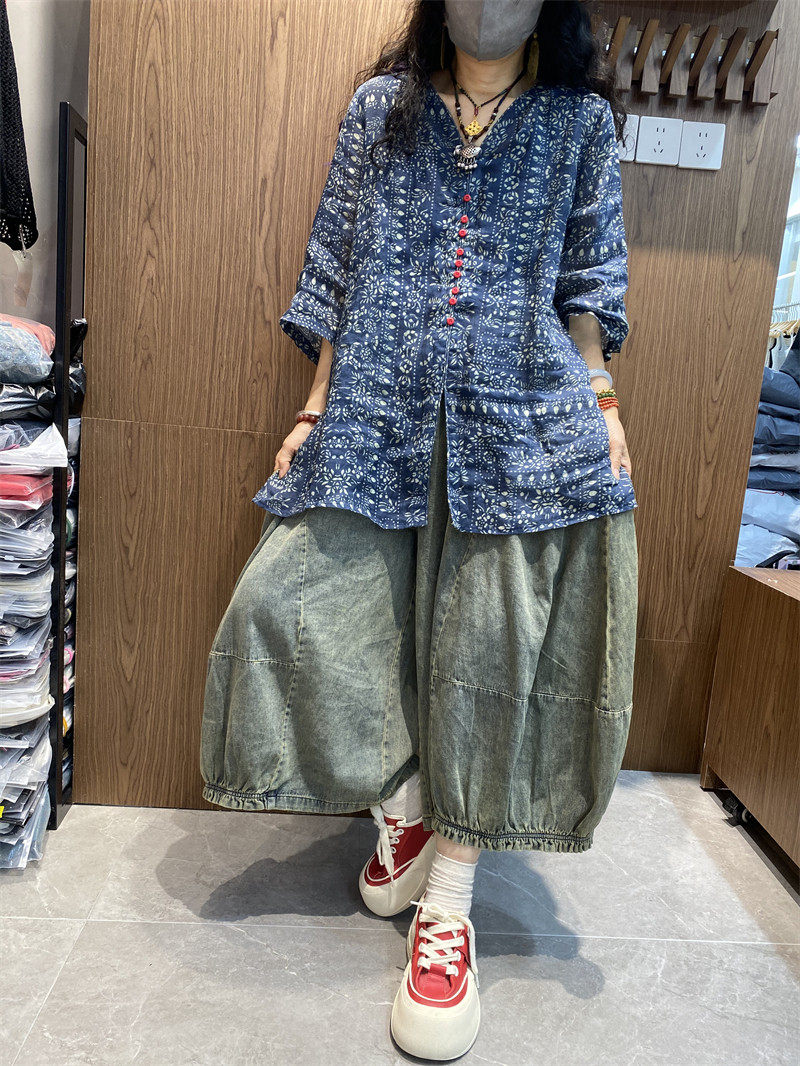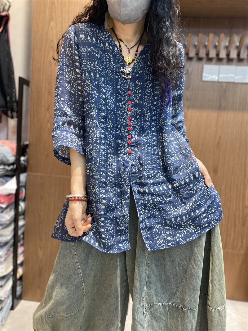 日系高級出口大碼襯衫印花顯瘦民族風復古百搭五分袖V領上衣