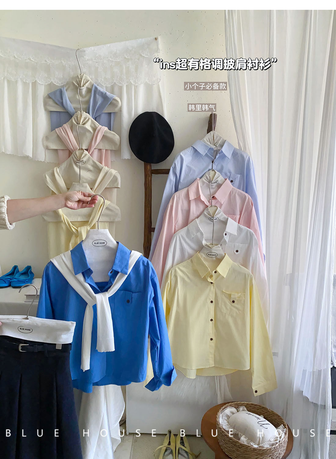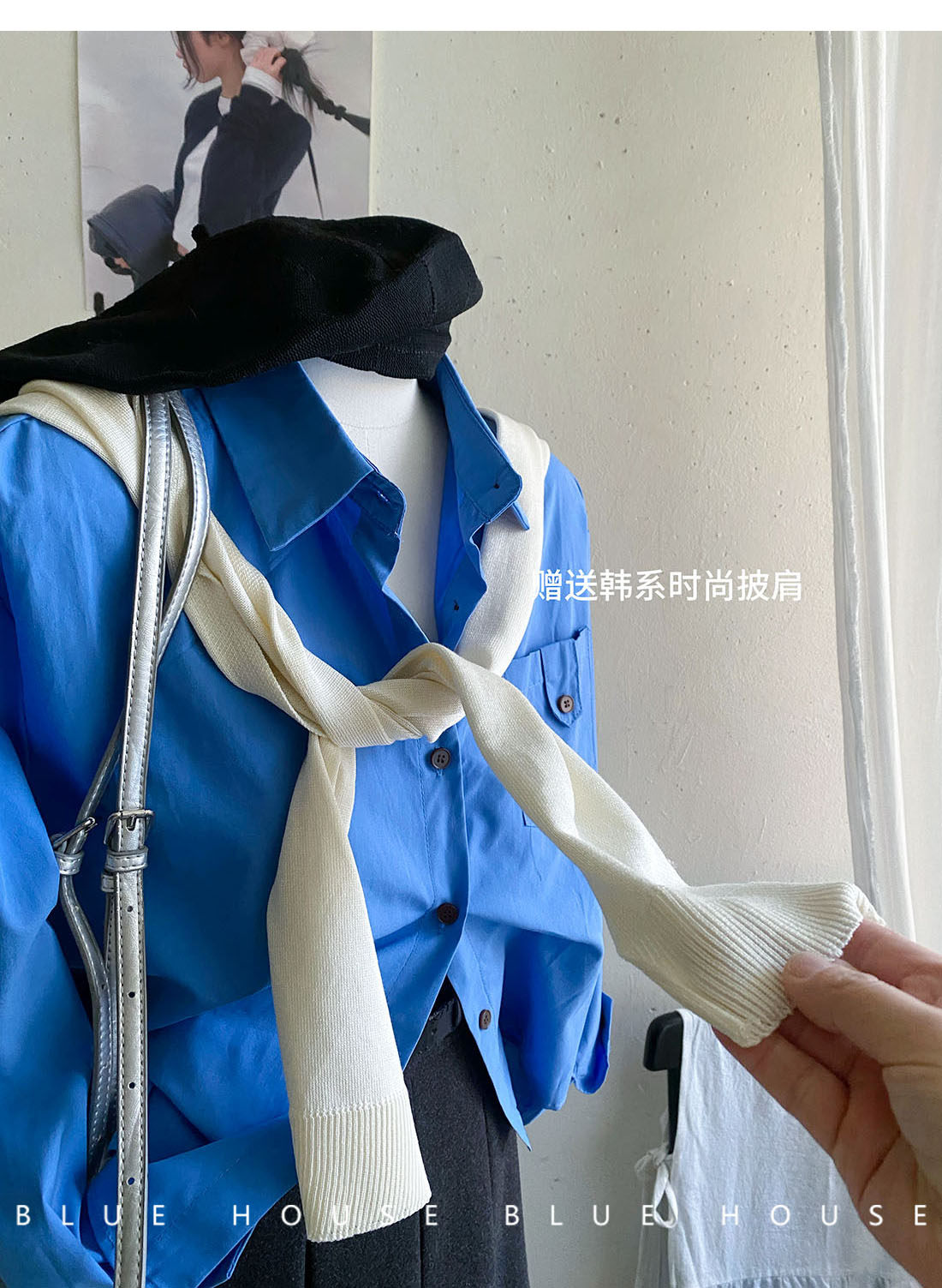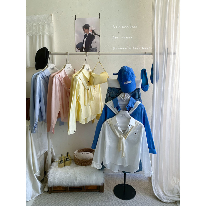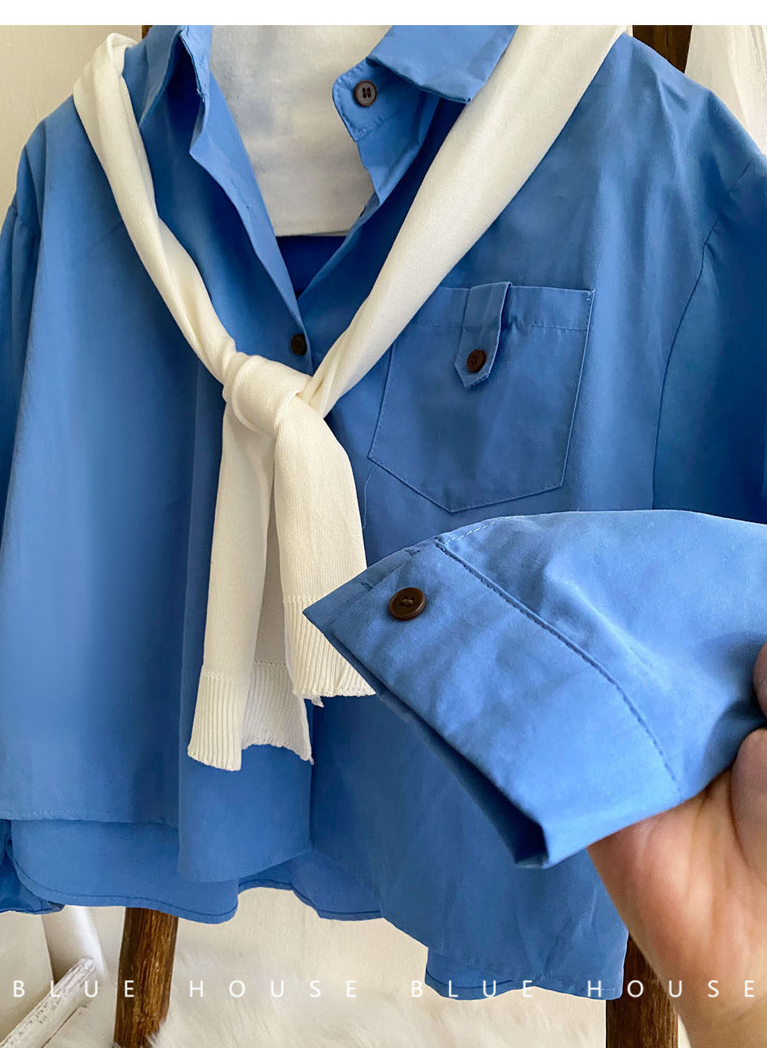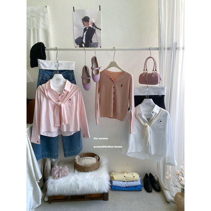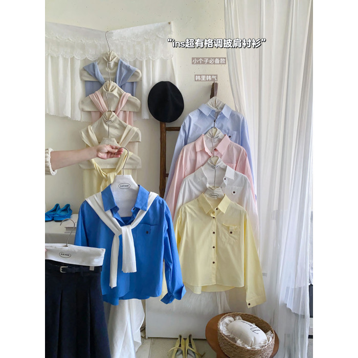 文藝知性藍配披肩短款長袖襯衫兩件套女春法式氣質小個子口袋襯衣