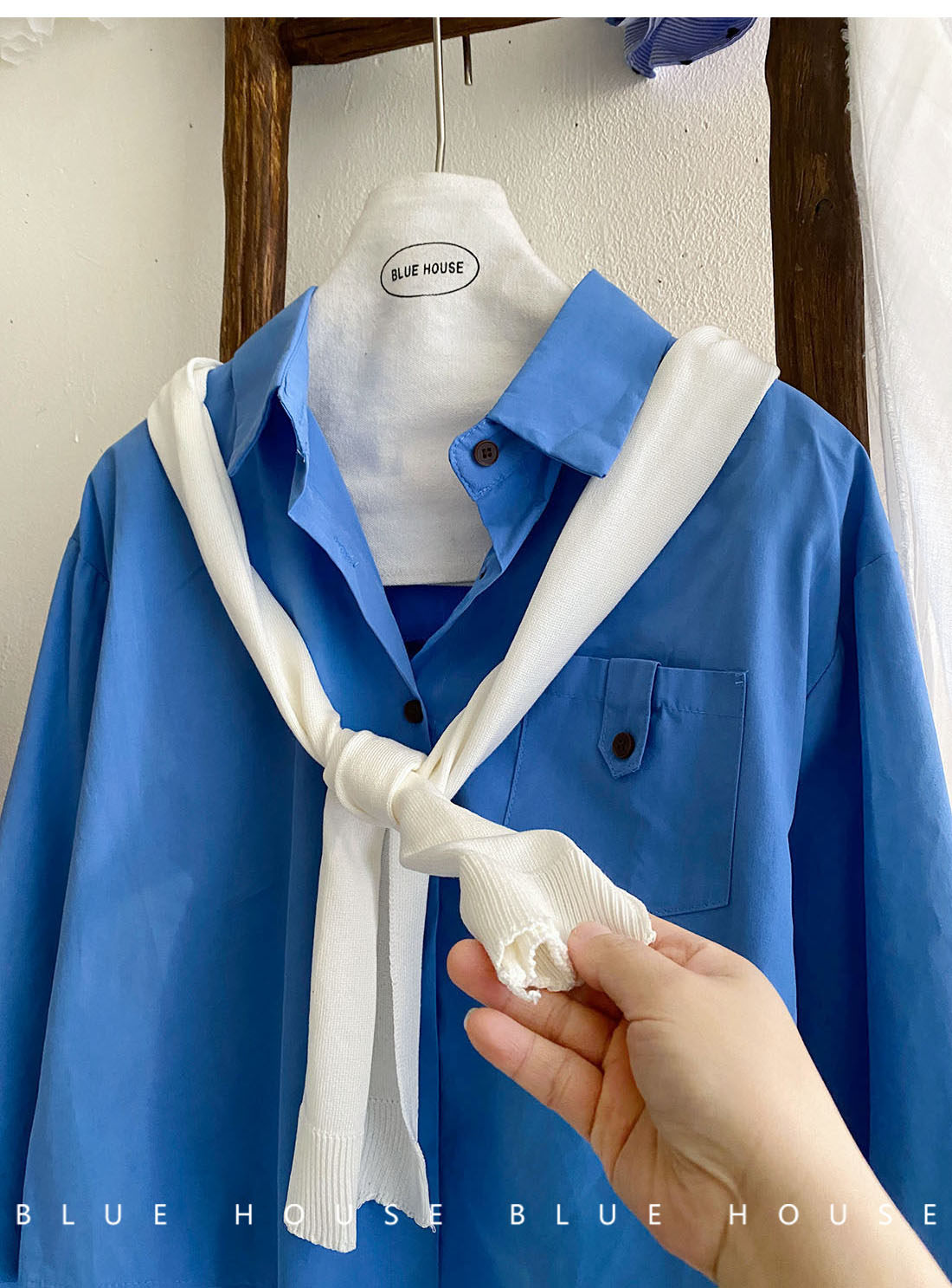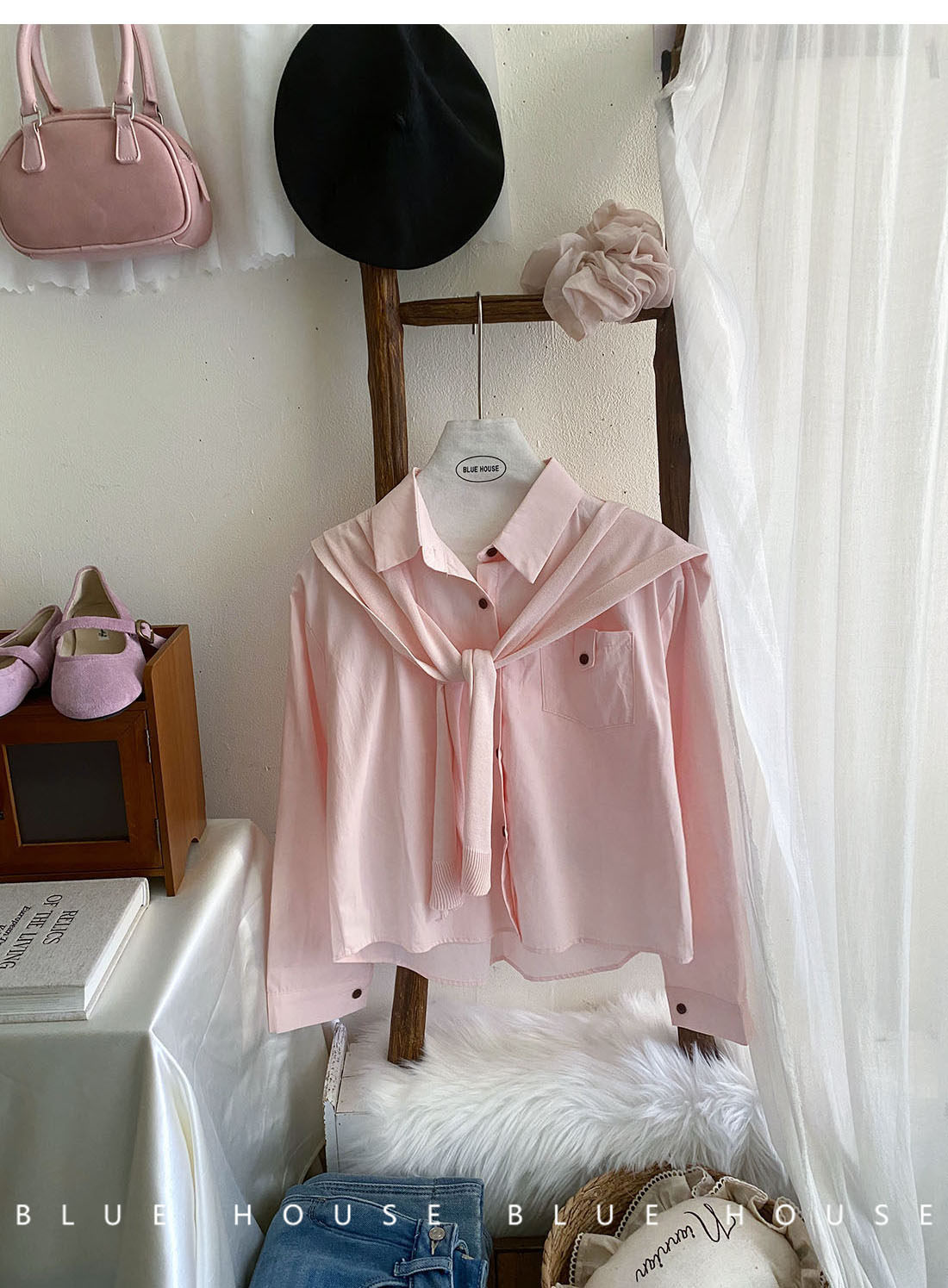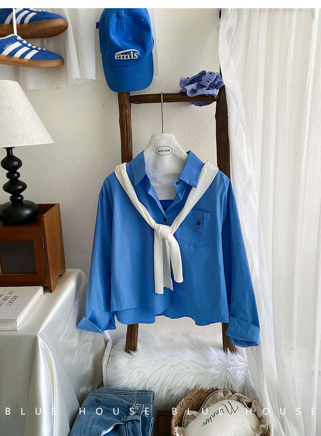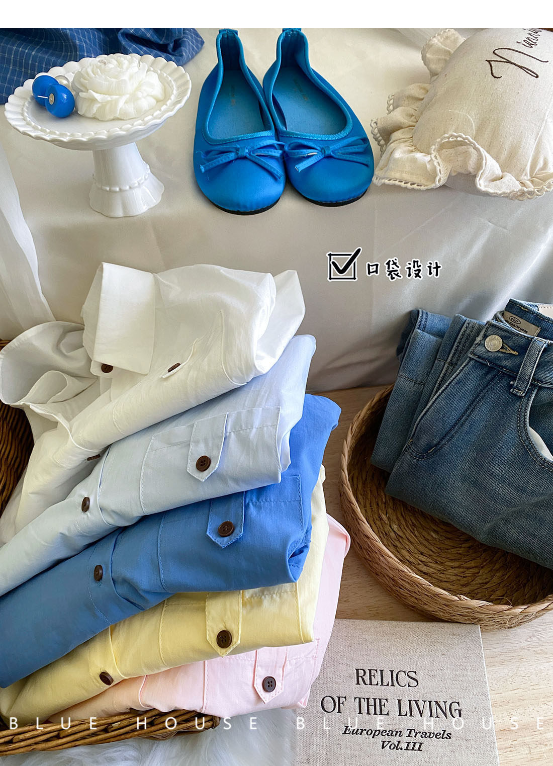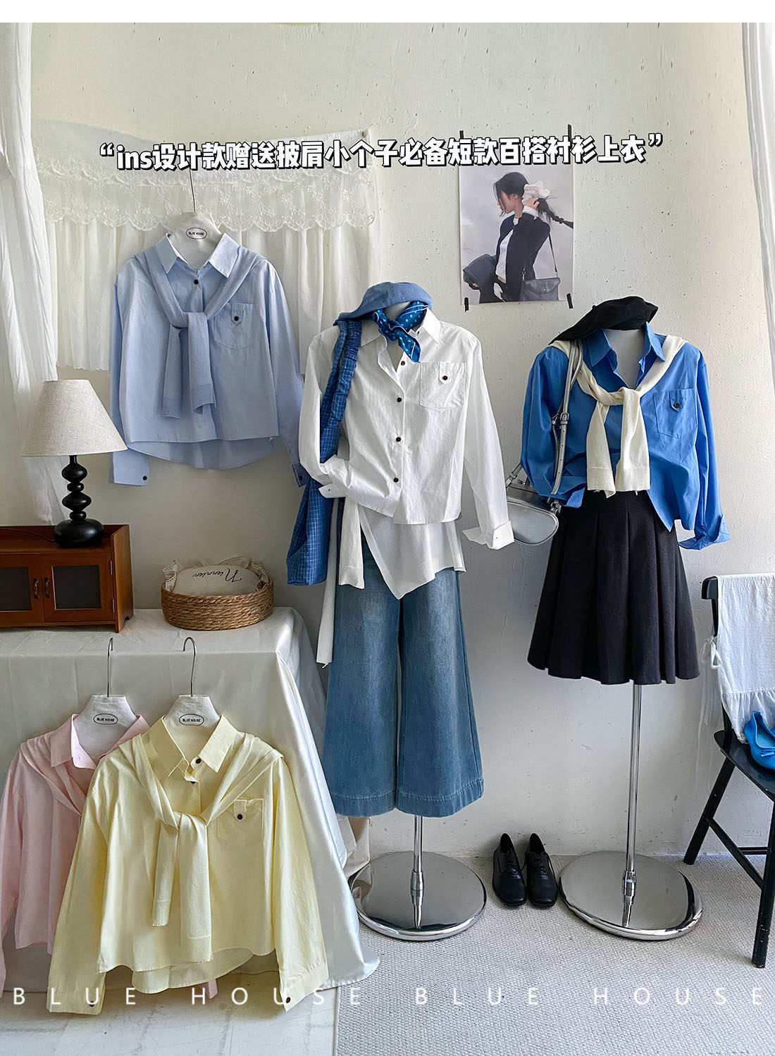 文藝知性藍配披肩短款長袖襯衫兩件套女春法式氣質小個子口袋襯衣