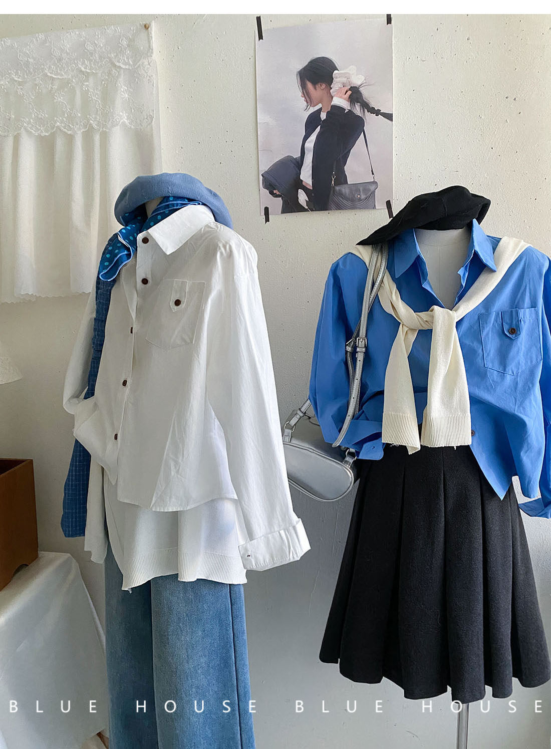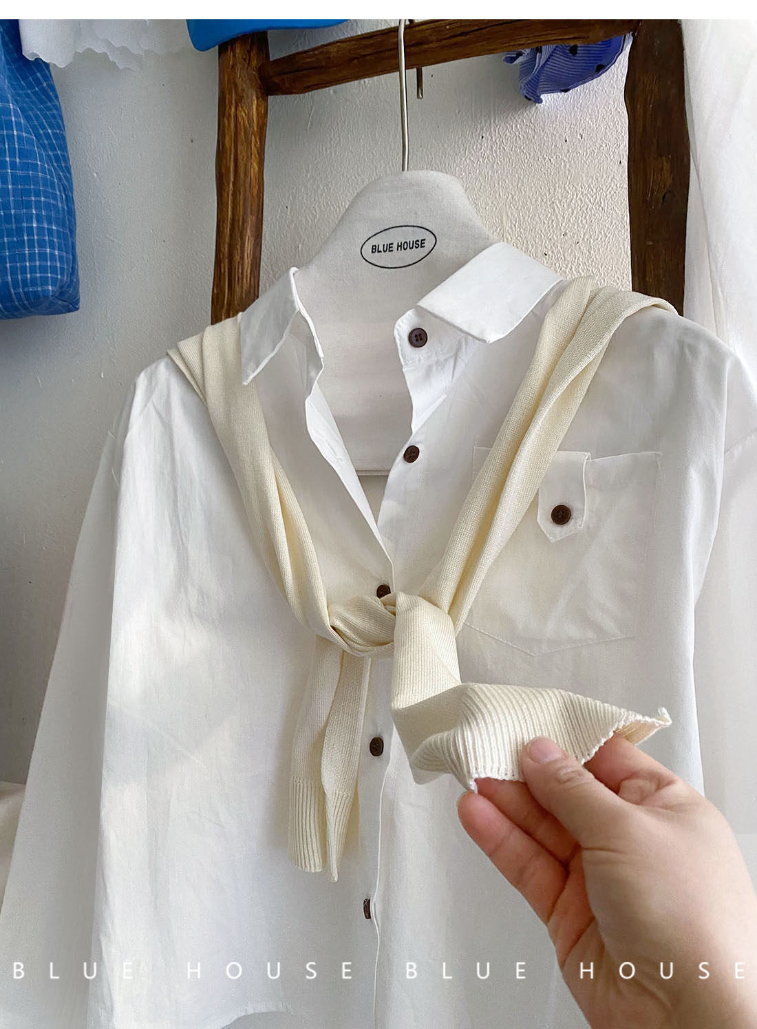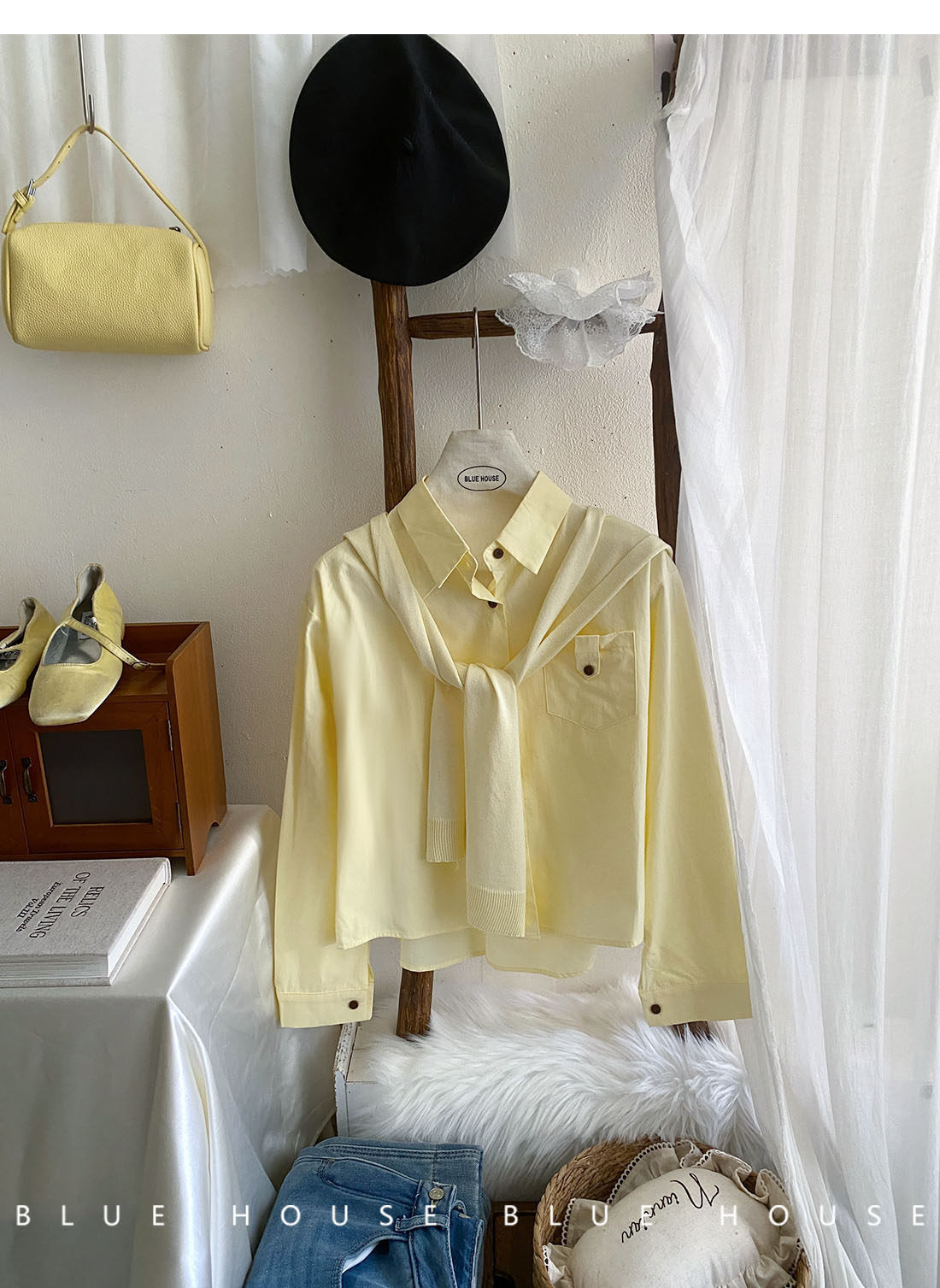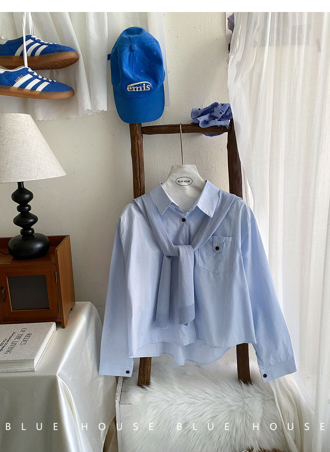 文藝知性藍配披肩短款長袖襯衫兩件套女春法式氣質小個子口袋襯衣