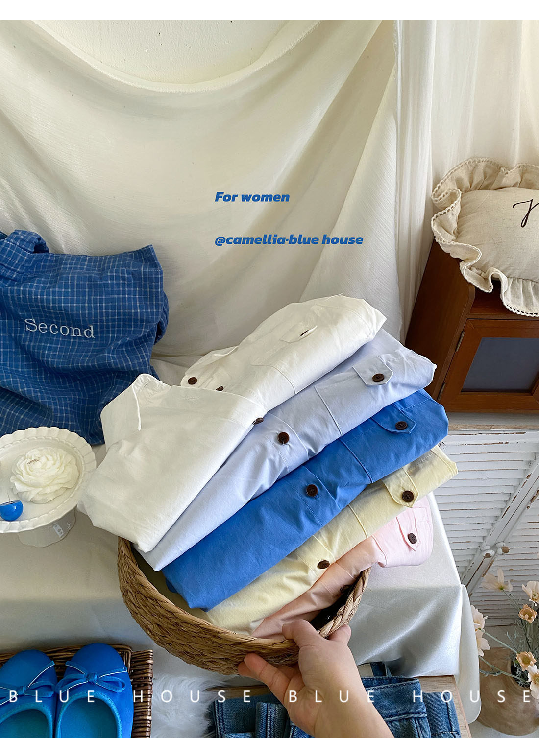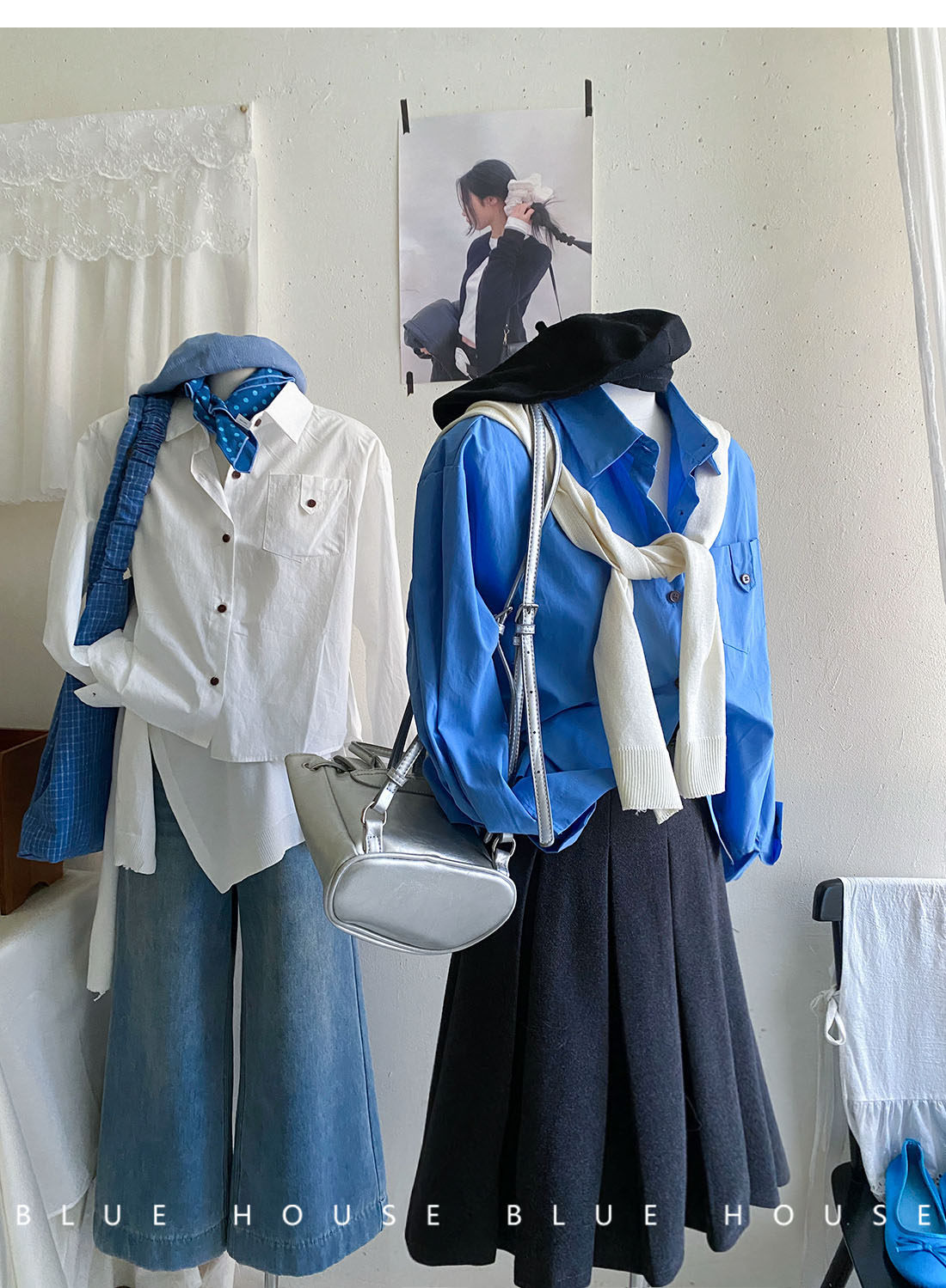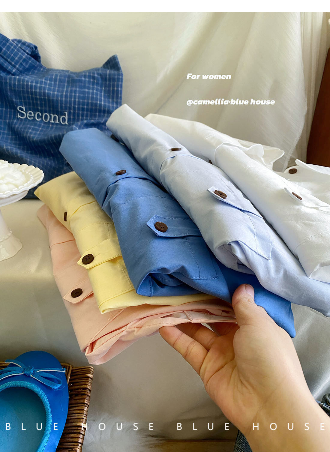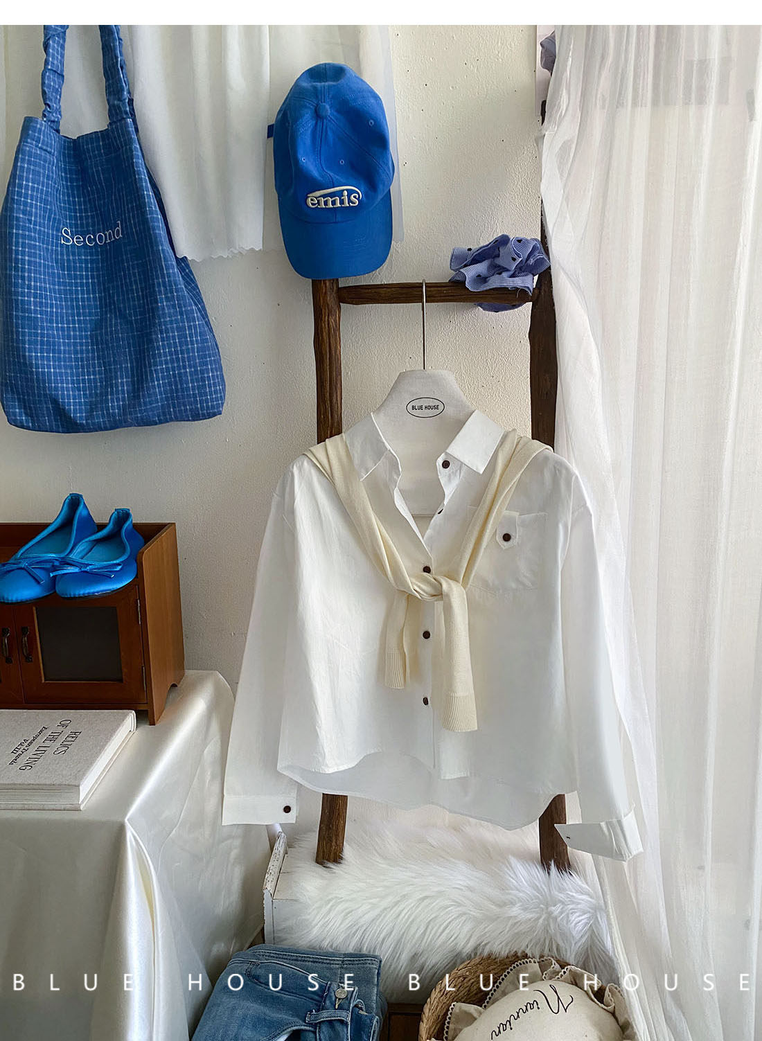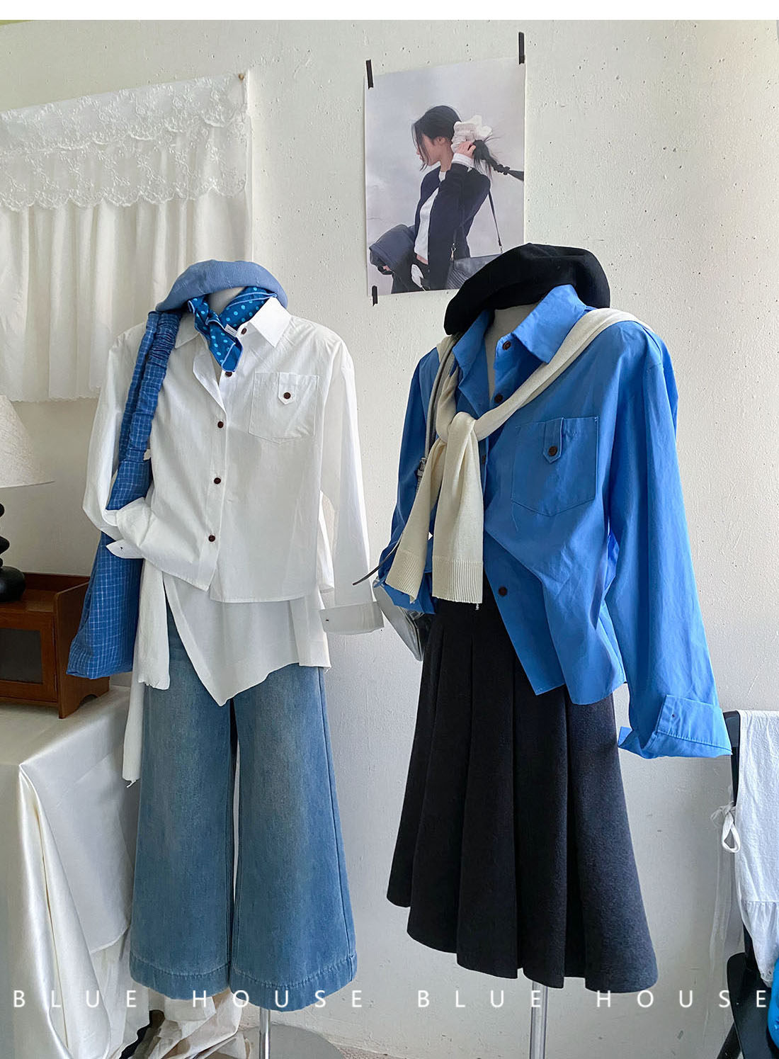 文藝知性藍配披肩短款長袖襯衫兩件套女春法式氣質小個子口袋襯衣